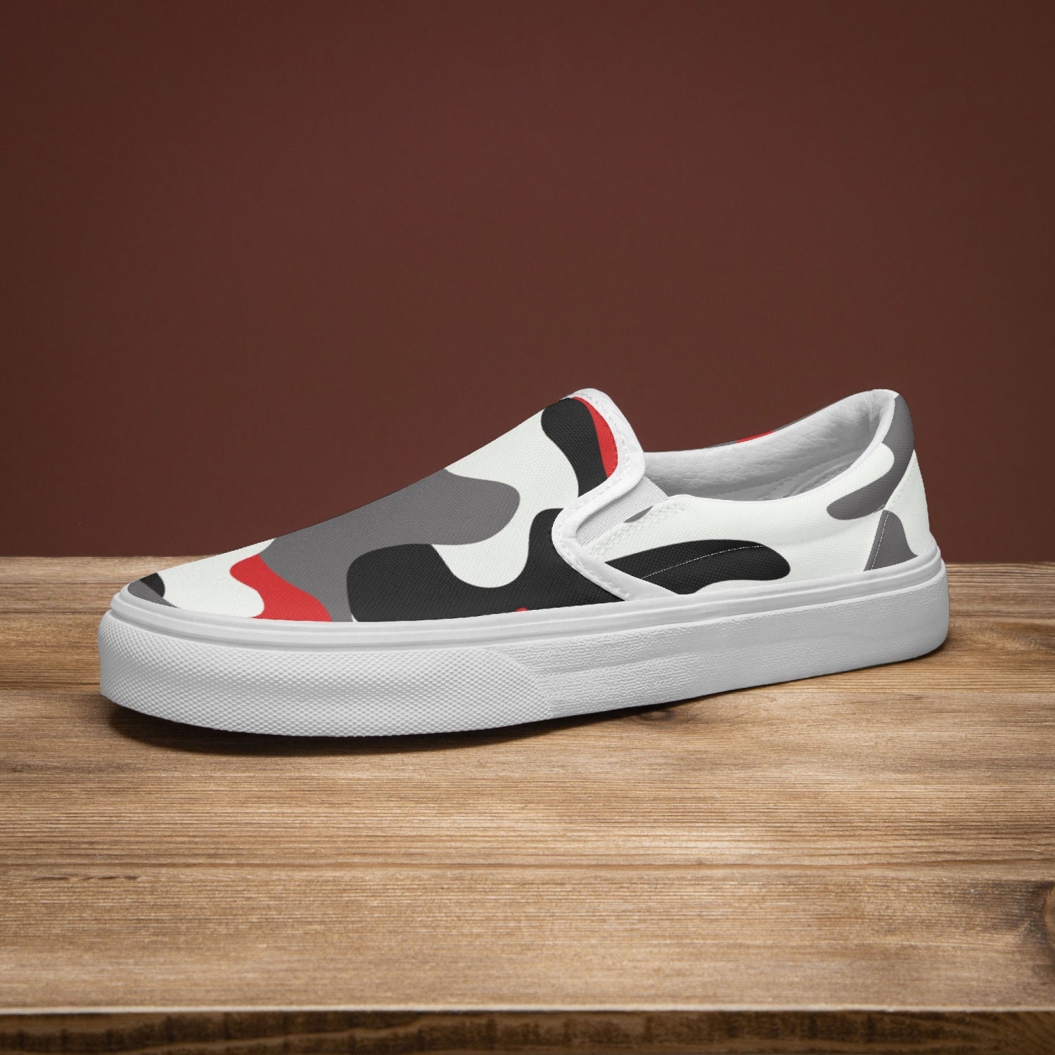 These Camo Slip-On Shoes in red, black, and white camouflage offer style and comfort. Made with high-quality materials, they are perfect for any outdoor or casual occasion. The unique camo pattern adds a touch of edginess to your outfit while the slip-on design provides convenience and ease. Stand out in these trendy and durable shoes.