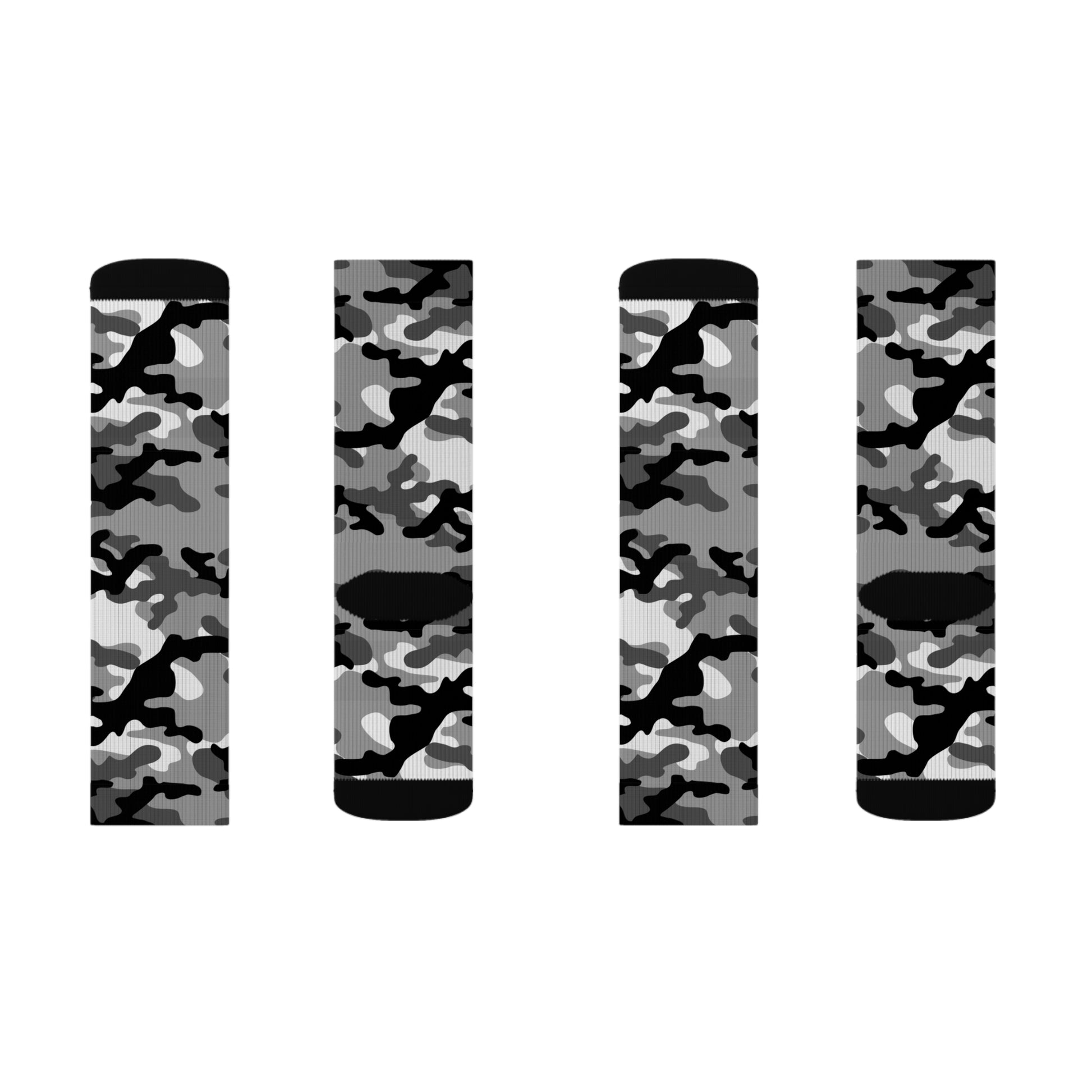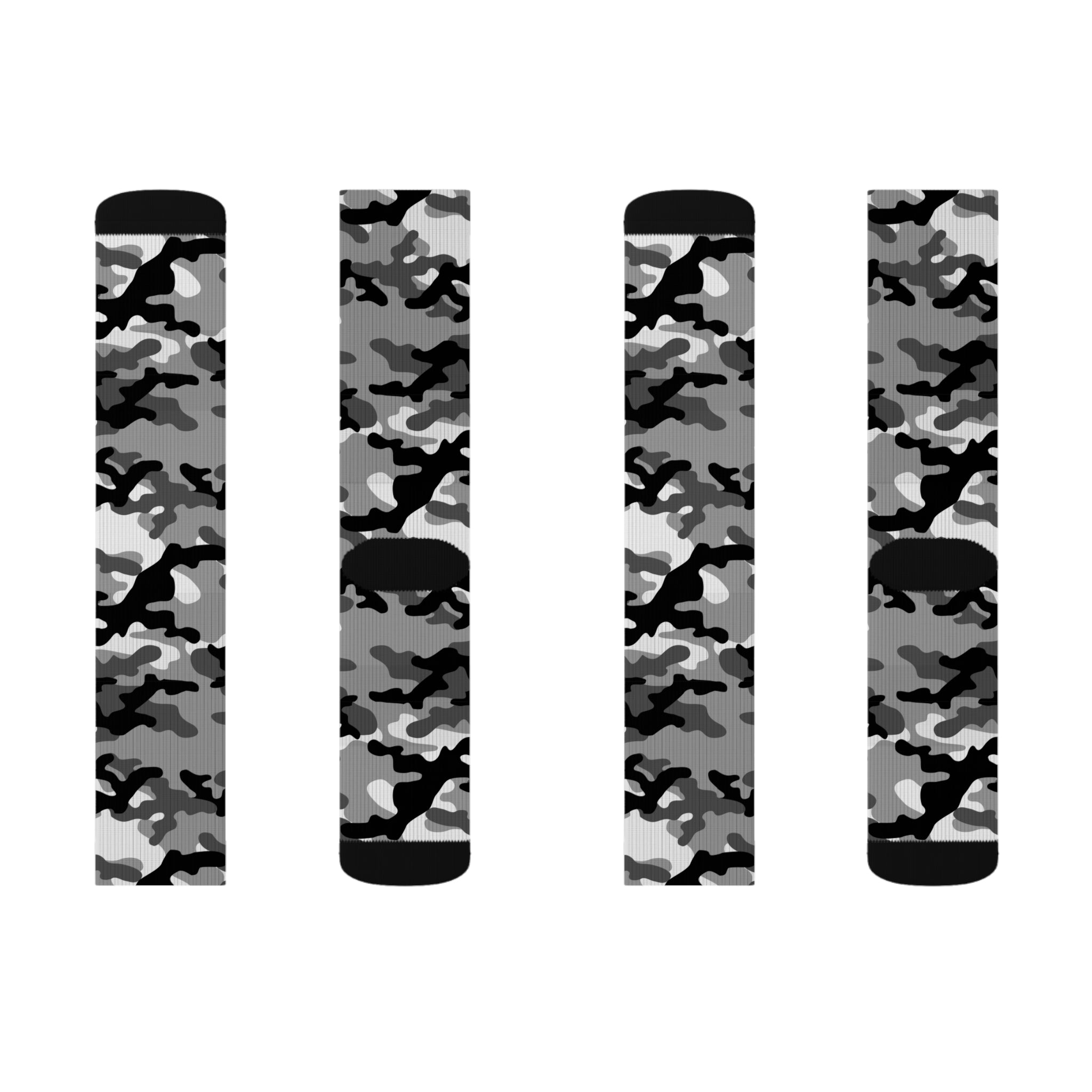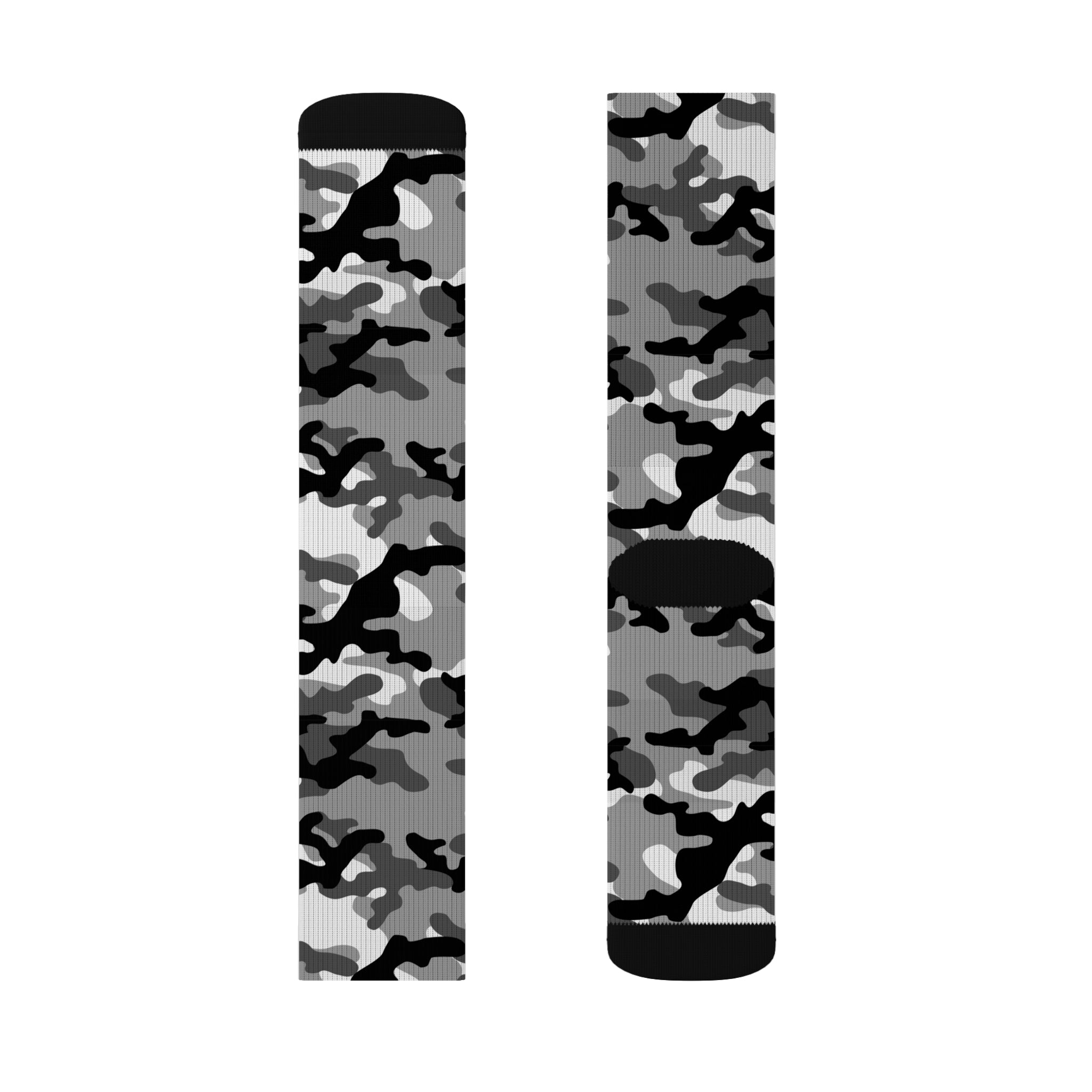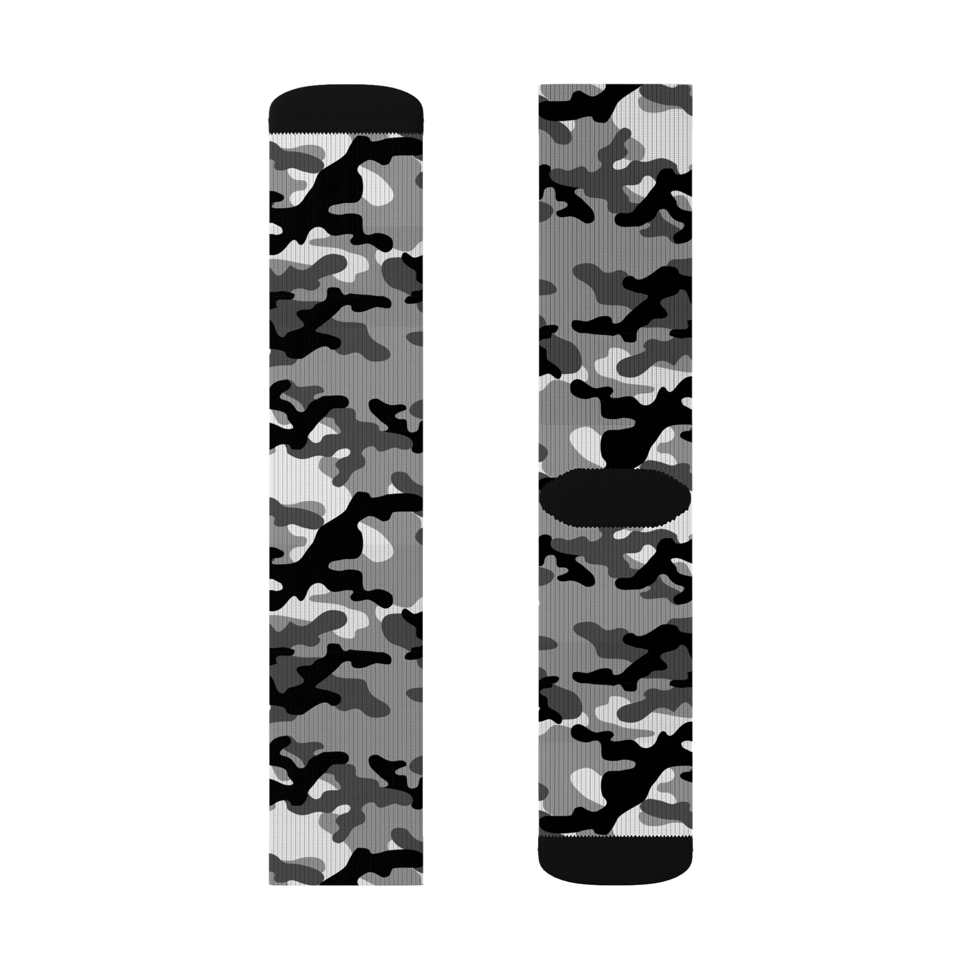 Unleash your inner adventurer with our Camo Socks in black, gray, and white camouflage. Made with high-quality materials, these socks are both stylish and comfortable. Perfect for everyday wear or outdoor activities. Get yours today and stay on-trend while on the go.