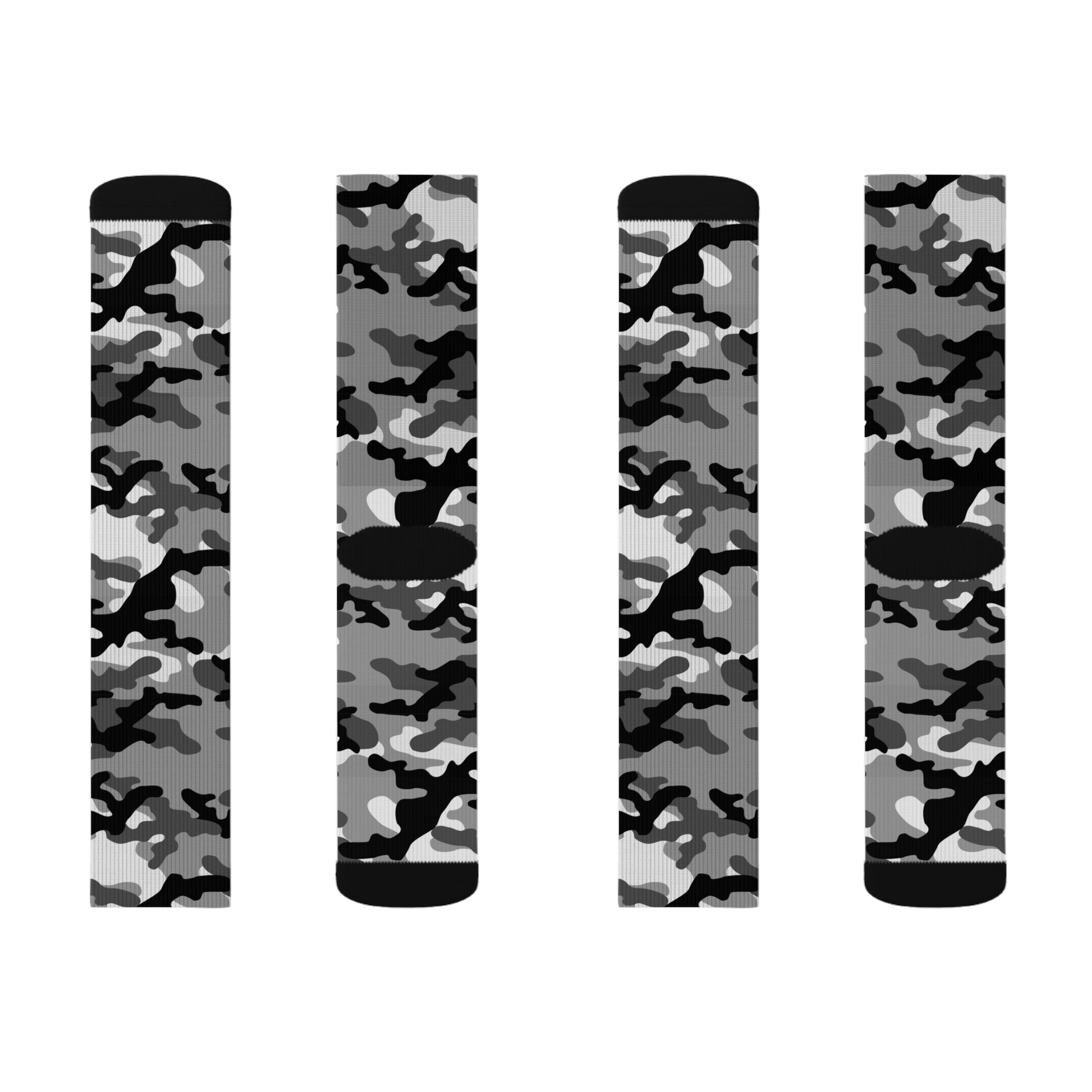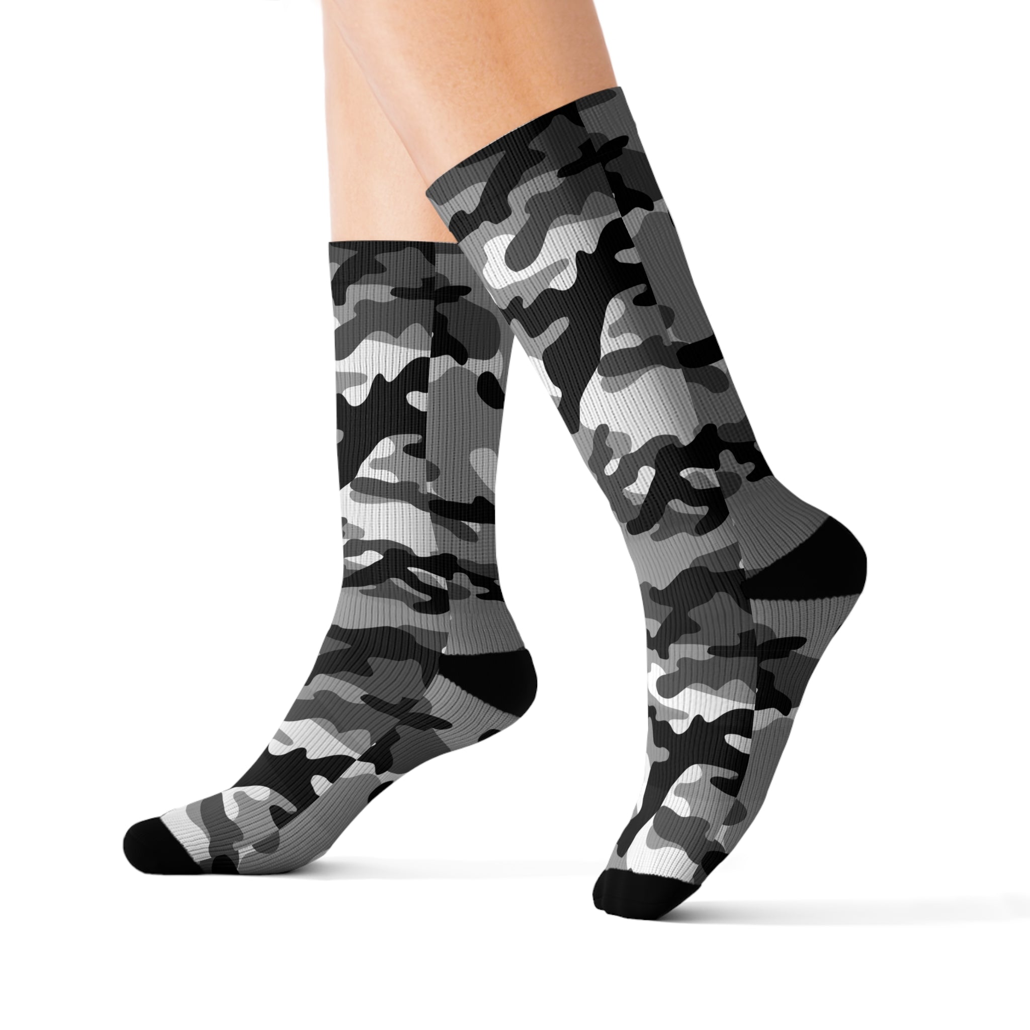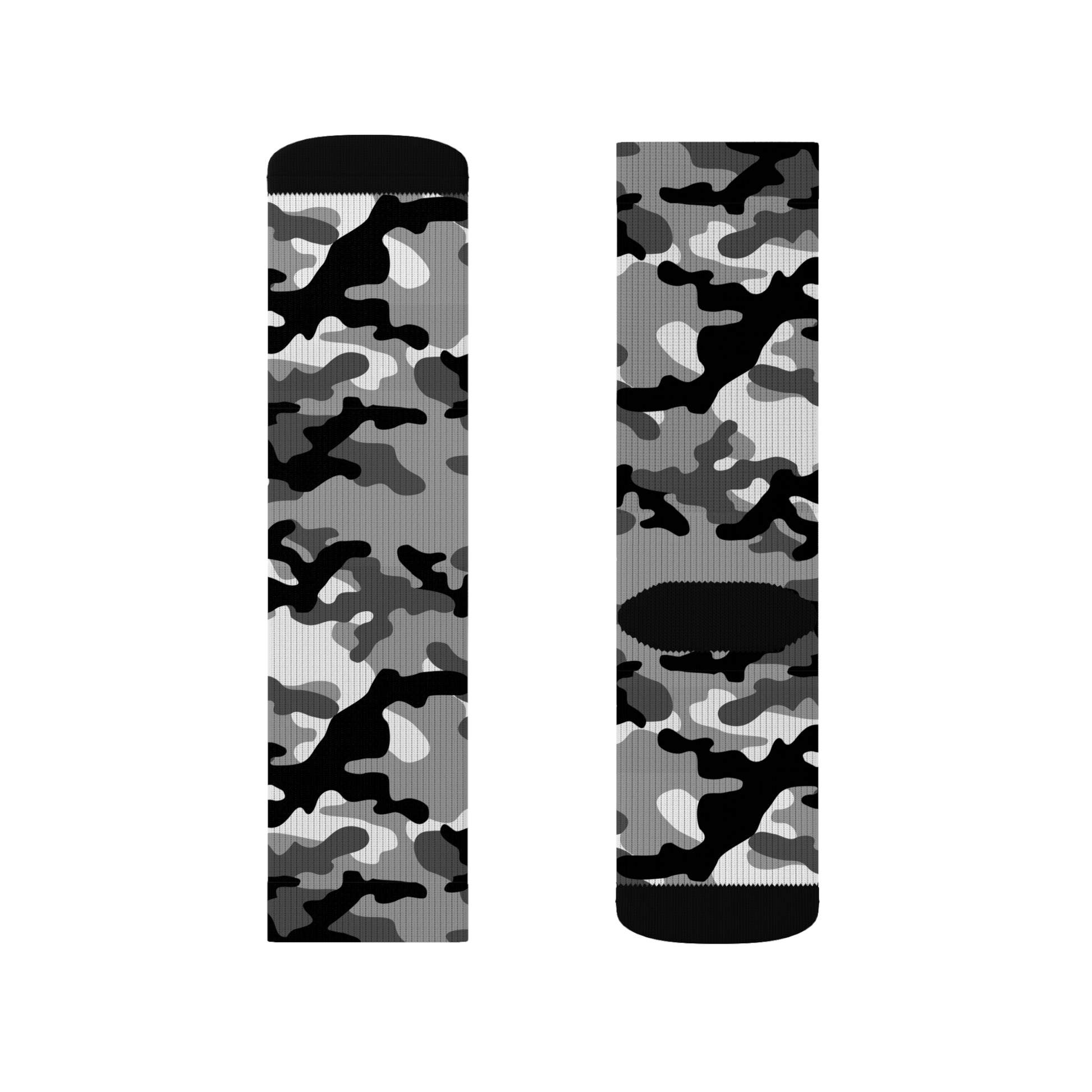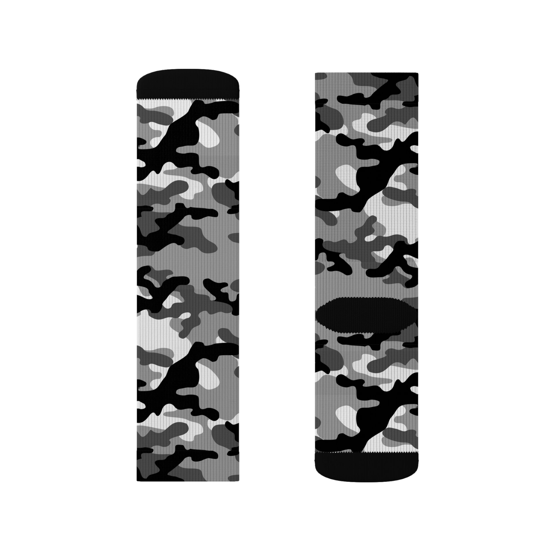Unleash your inner adventurer with our Camo Socks in black, gray, and white camouflage. Made with high-quality materials, these socks are both stylish and comfortable. Perfect for everyday wear or outdoor activities. Get yours today and stay on-trend while on the go.