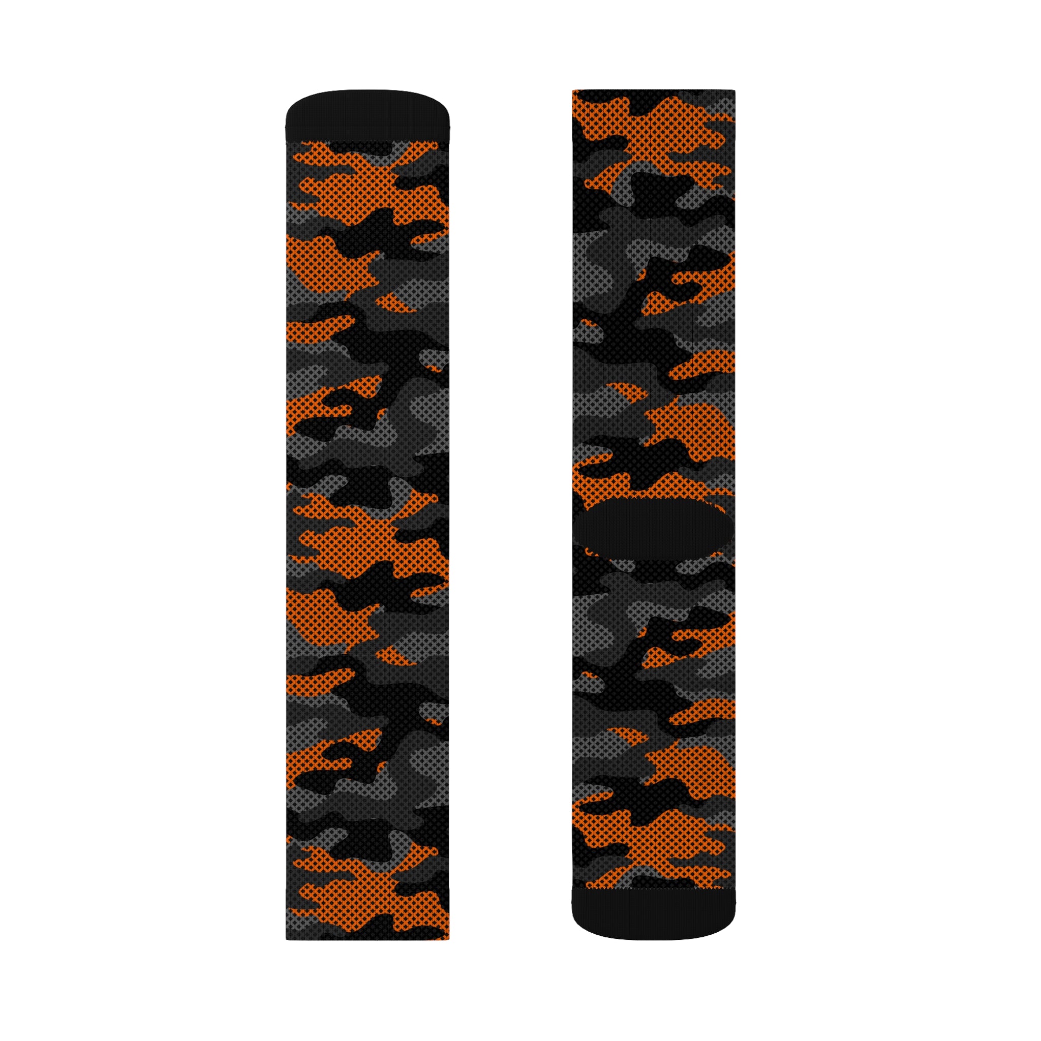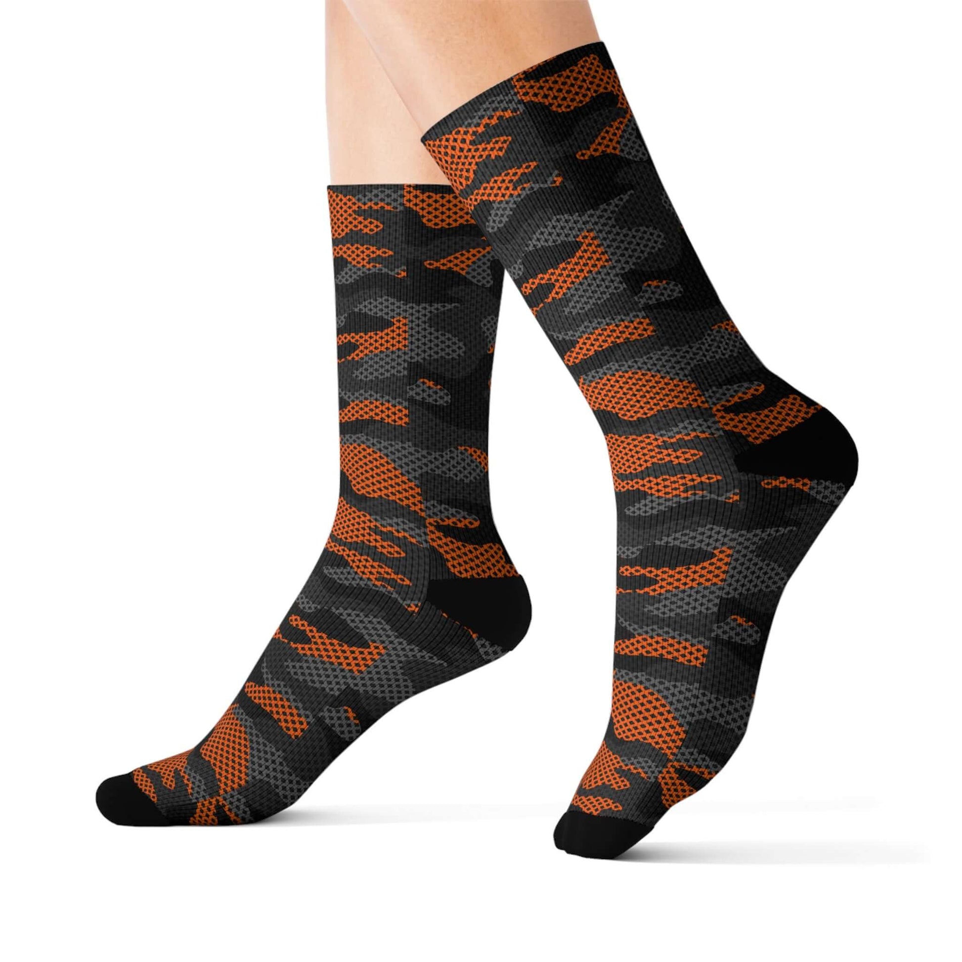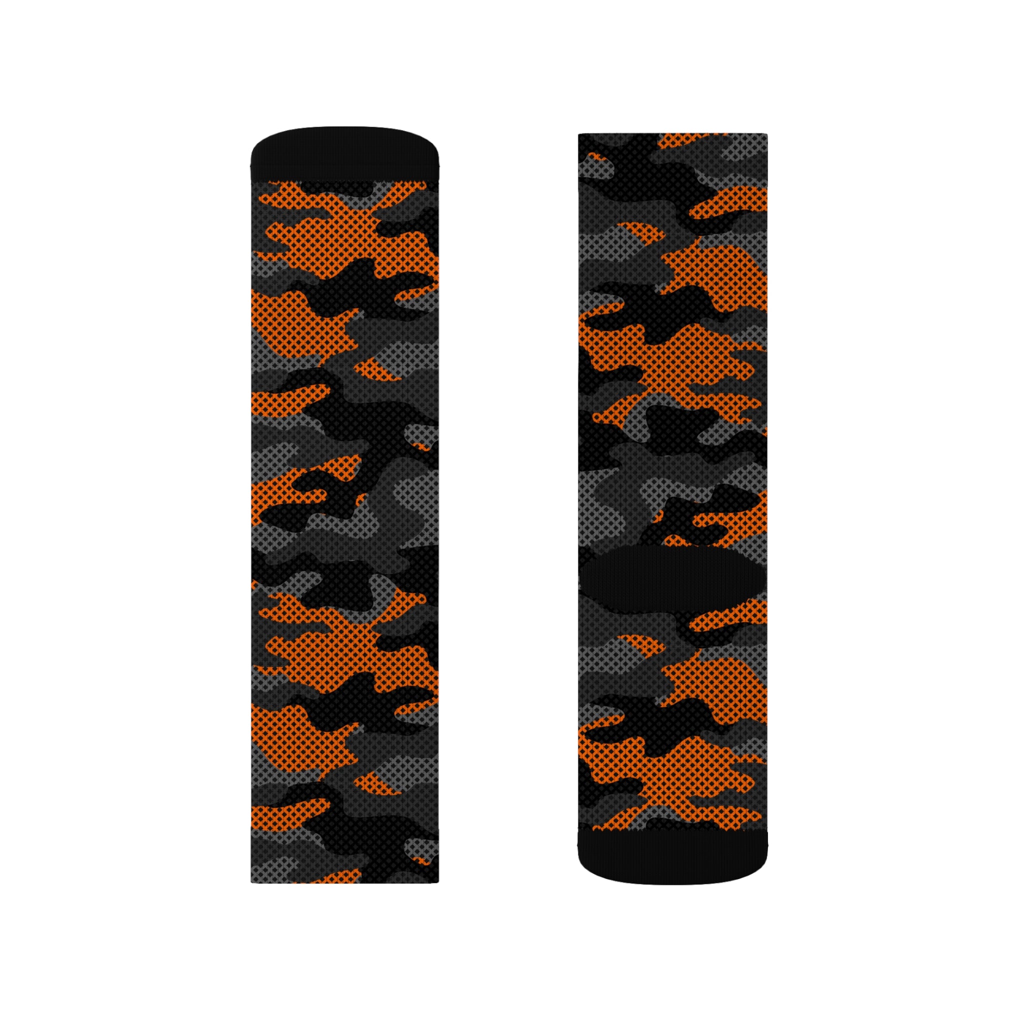 Introducing our Camo Socks, featuring a unique Black & Orange Pixel Camouflage design. These socks are stylish, comfortable, and perfect for outdoor enthusiasts or those with a bold fashion sense. Made with high-quality materials, these socks will elevate any outfit.