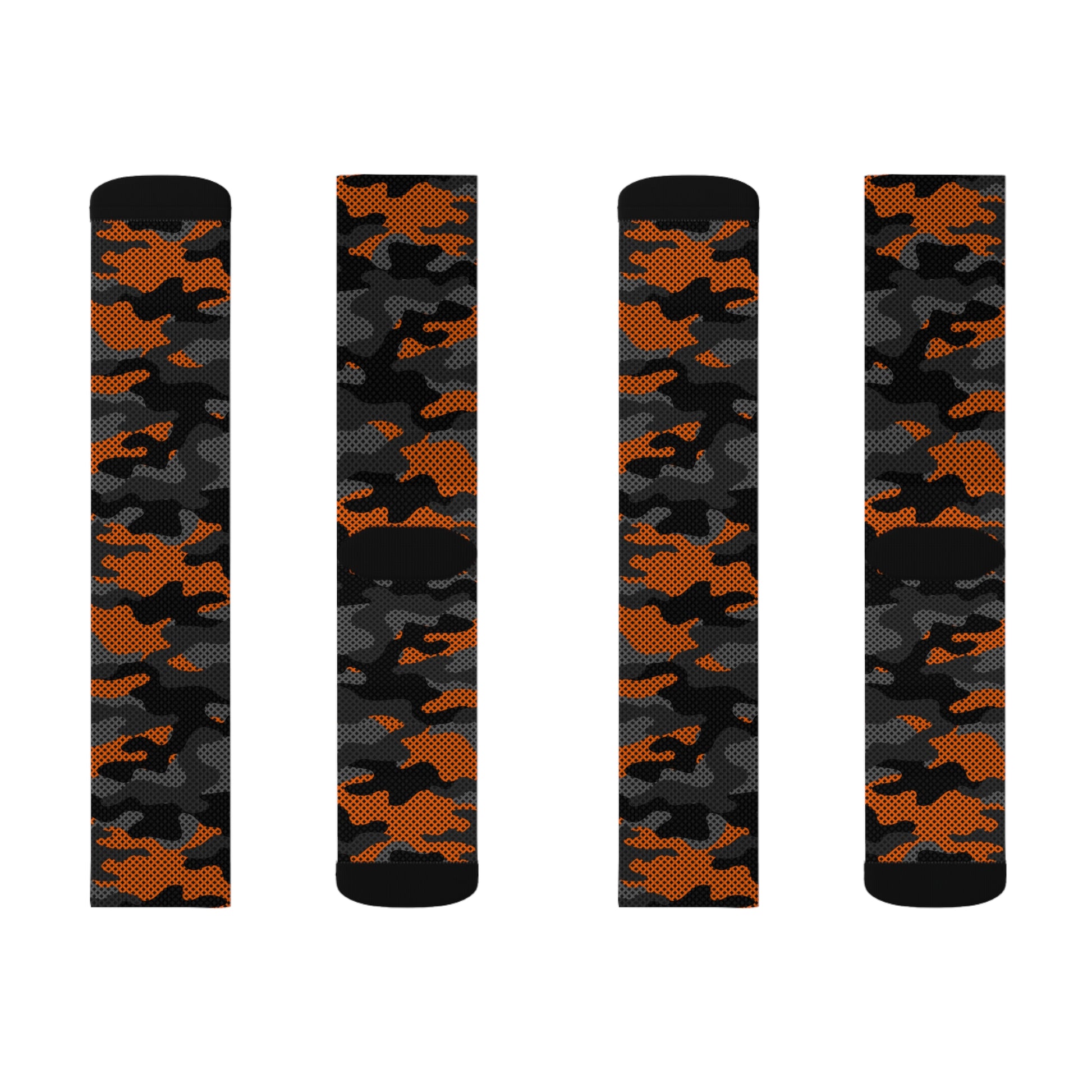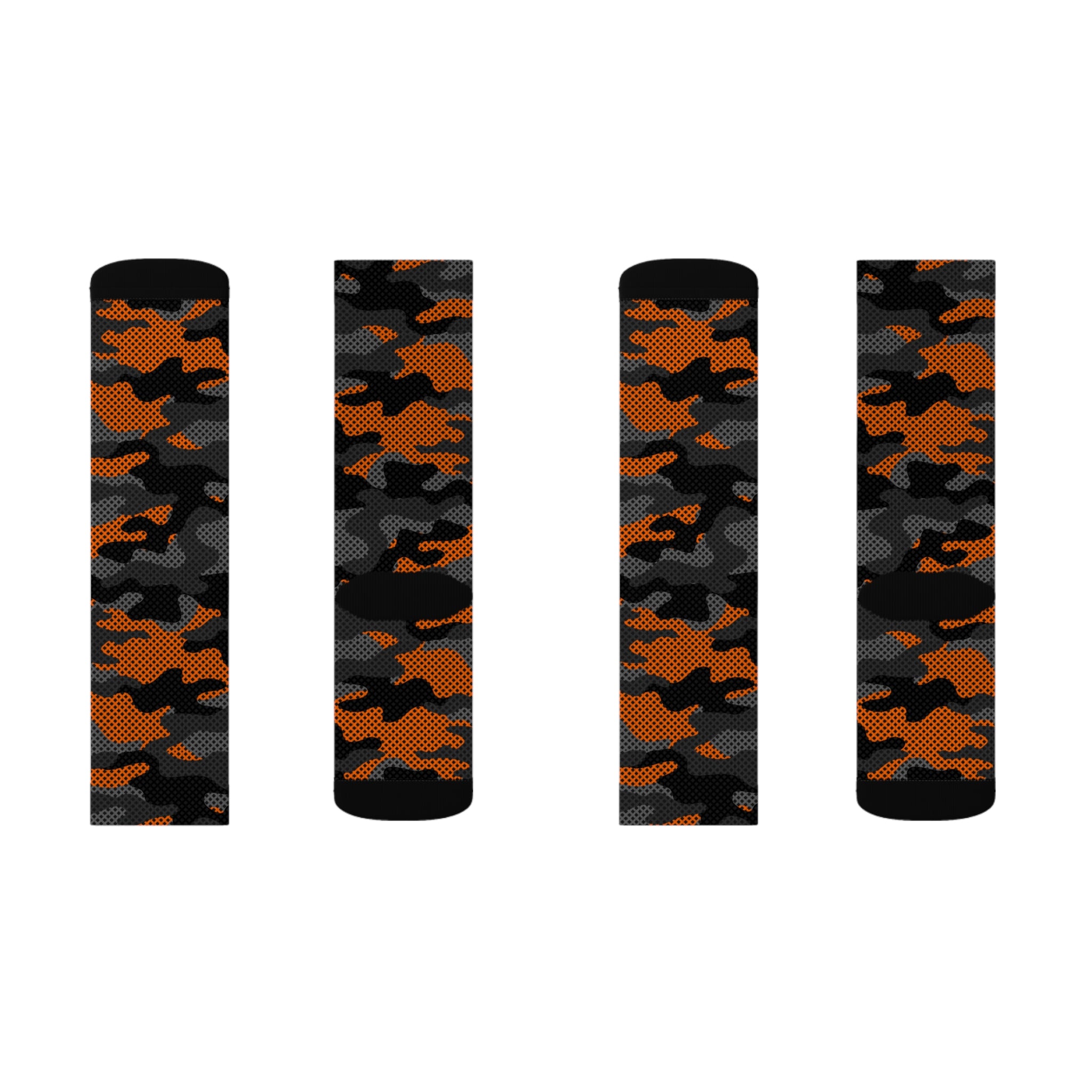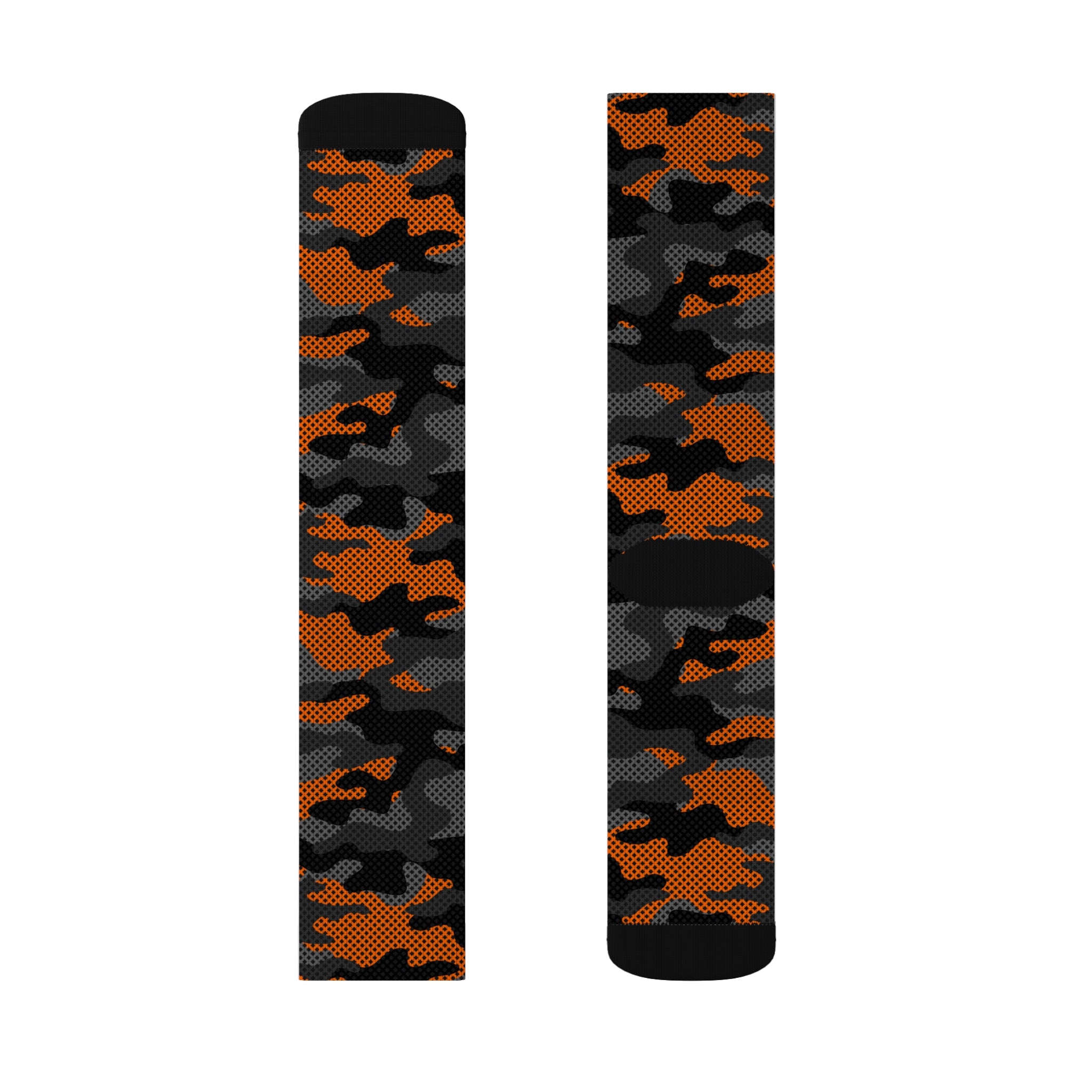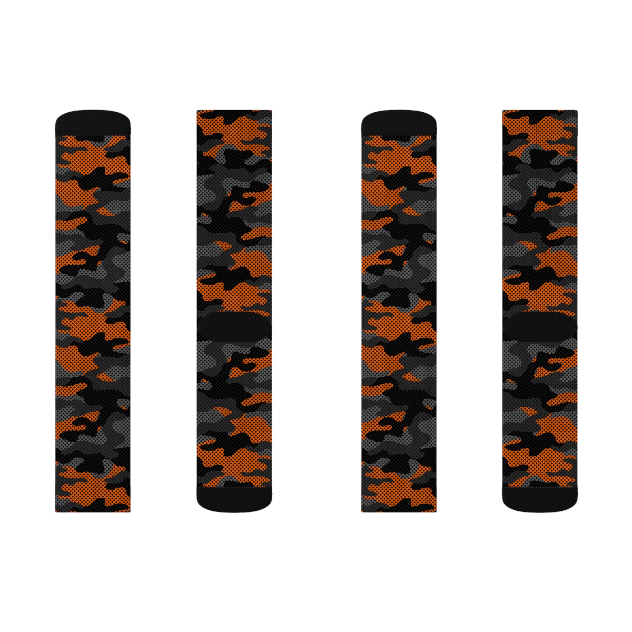 Introducing our Camo Socks, featuring a unique Black & Orange Pixel Camouflage design. These socks are stylish, comfortable, and perfect for outdoor enthusiasts or those with a bold fashion sense. Made with high-quality materials, these socks will elevate any outfit.