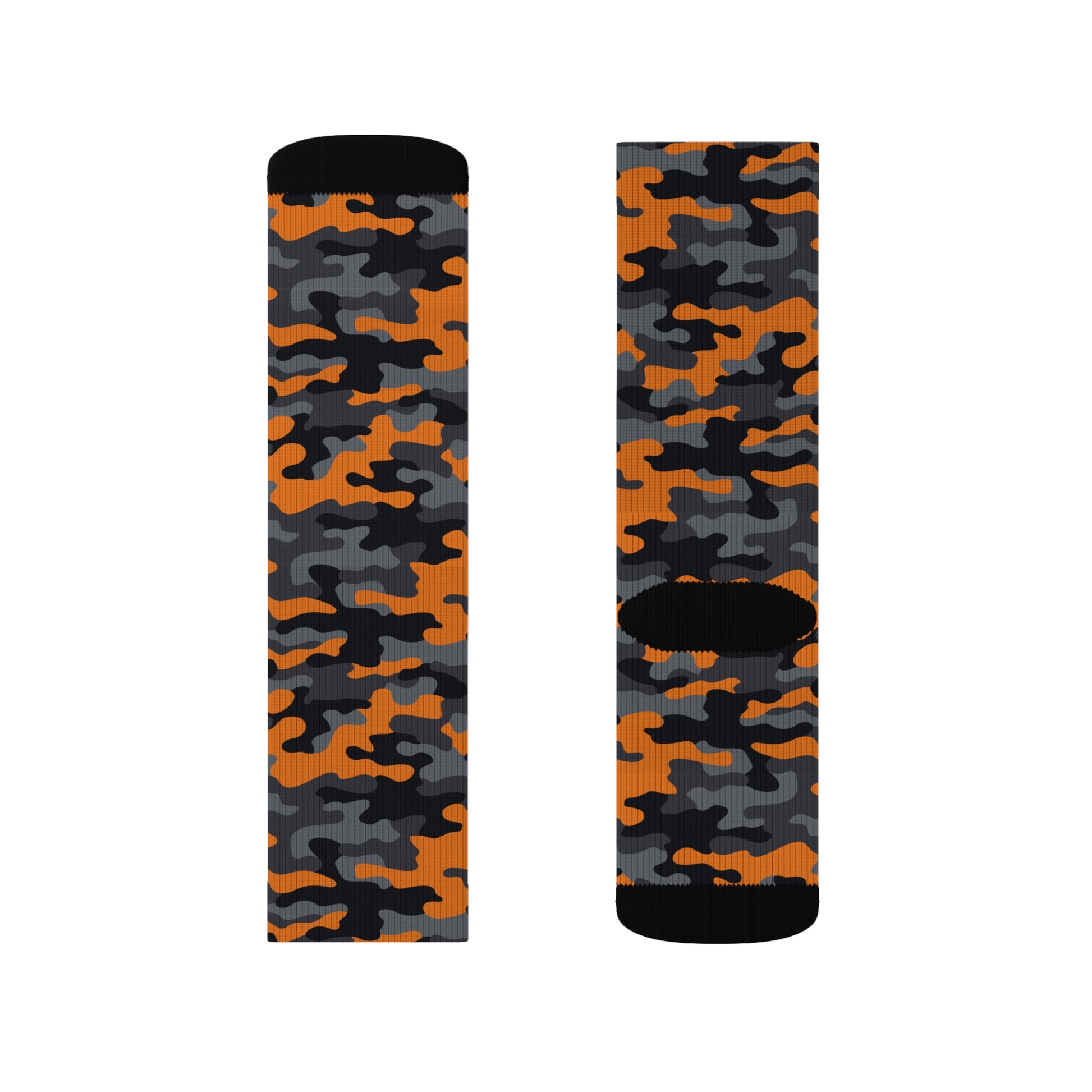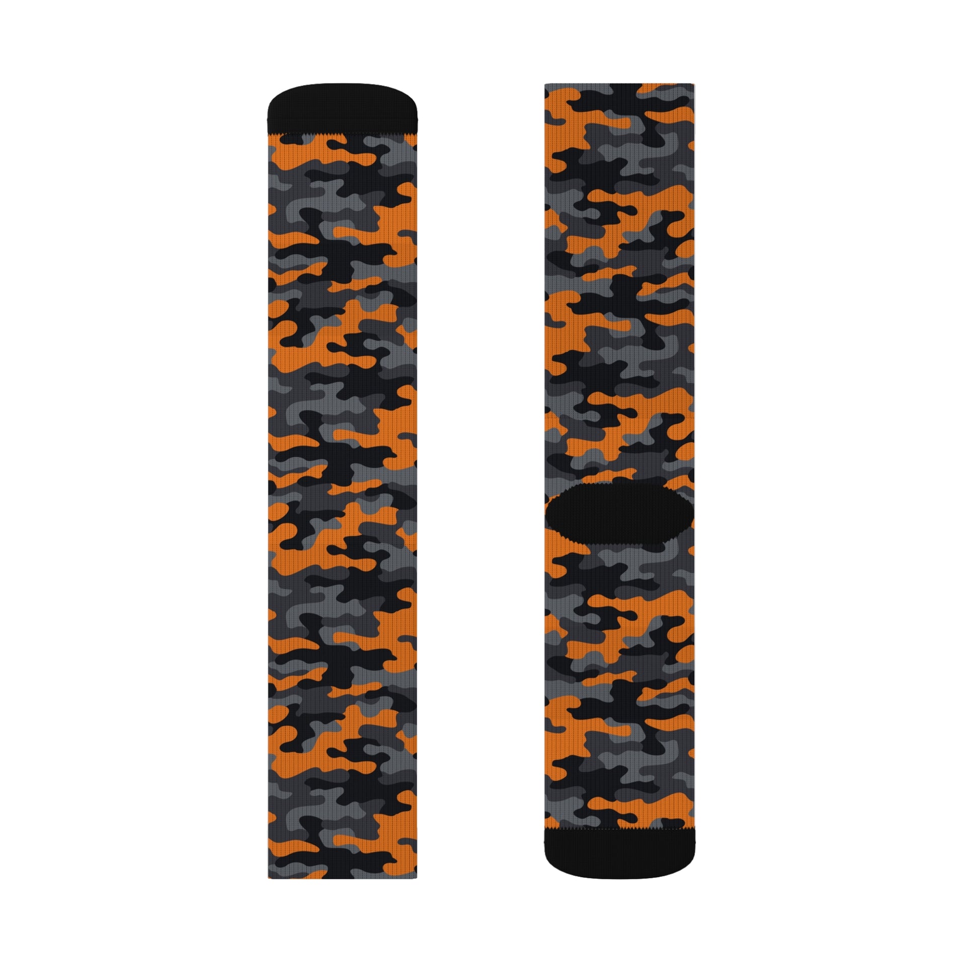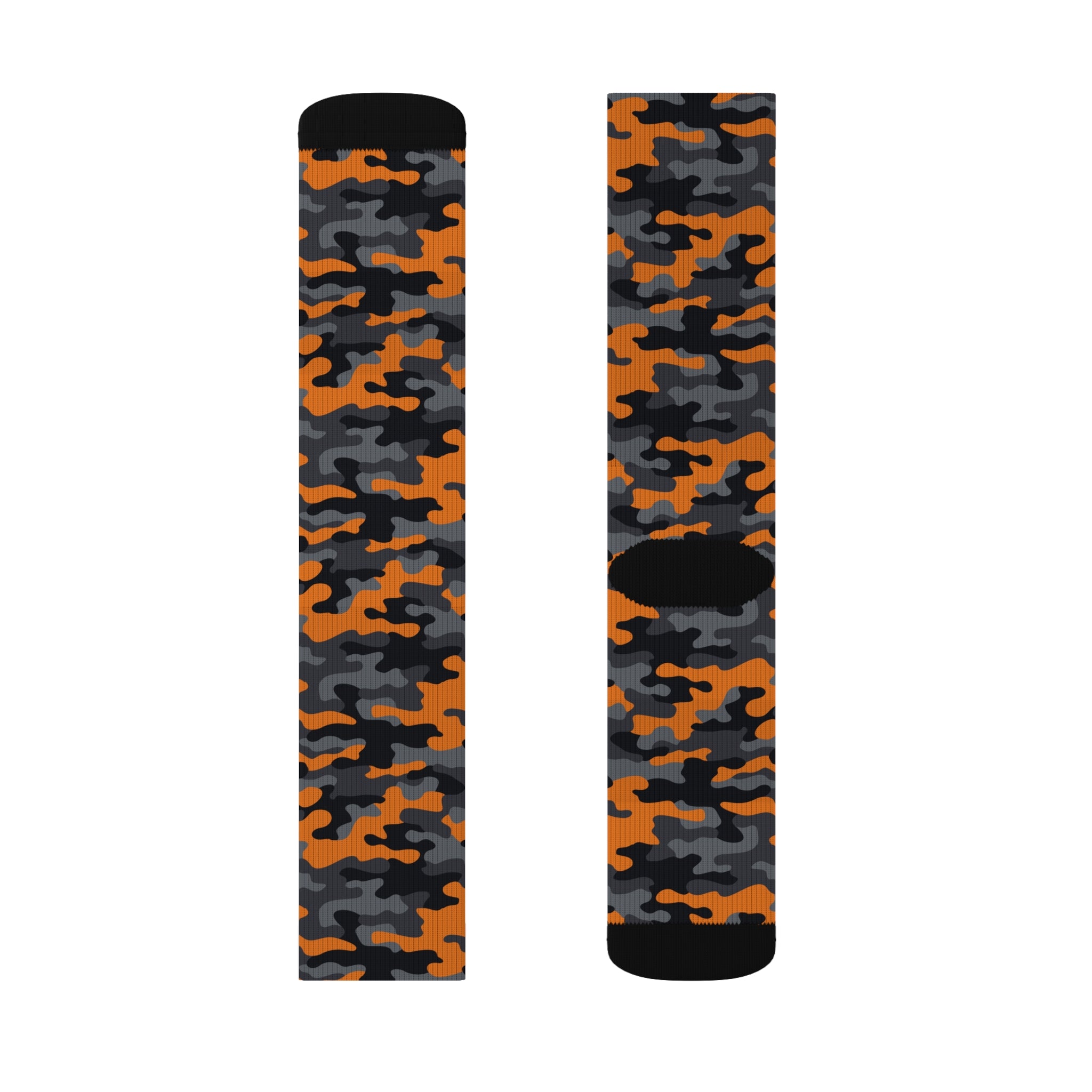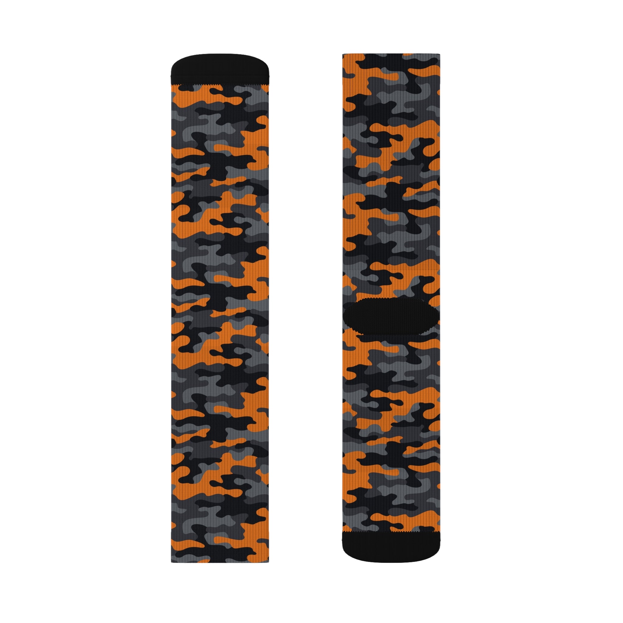Stay invisible and stylish with our Camo Socks. Featuring a striking blend of orange, black, and gray camouflage, these socks are perfect for blending in and standing out. Made with high-quality materials, they provide both comfort and durability. Dominate any terrain with these camo socks.
