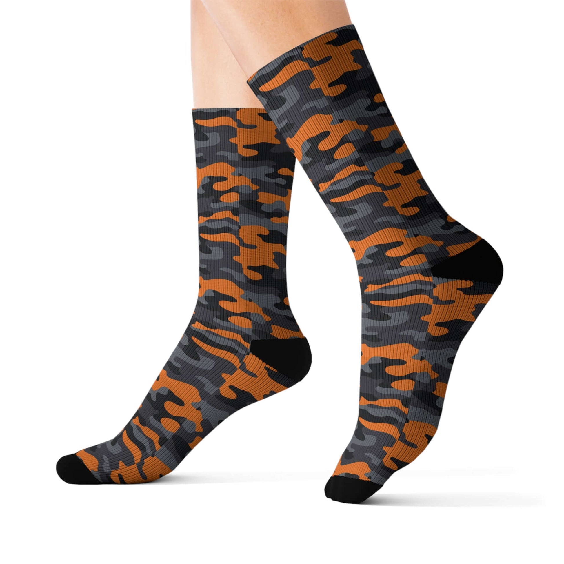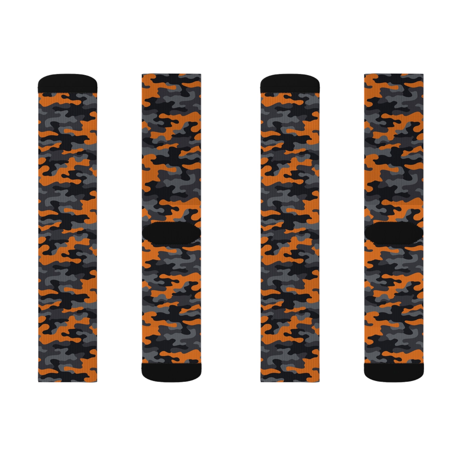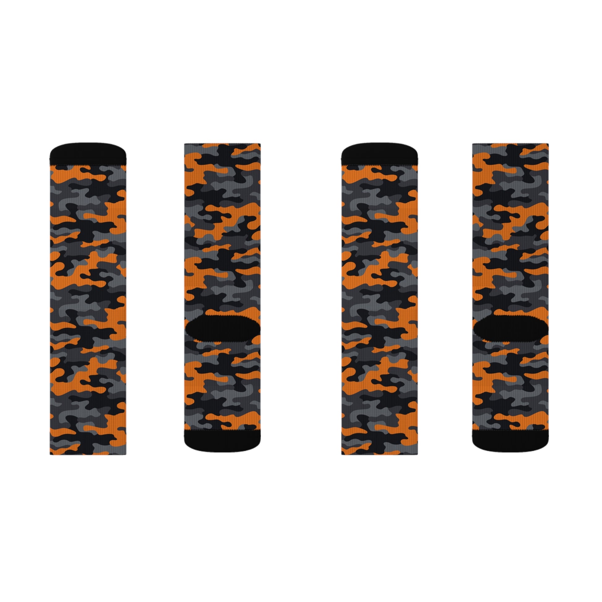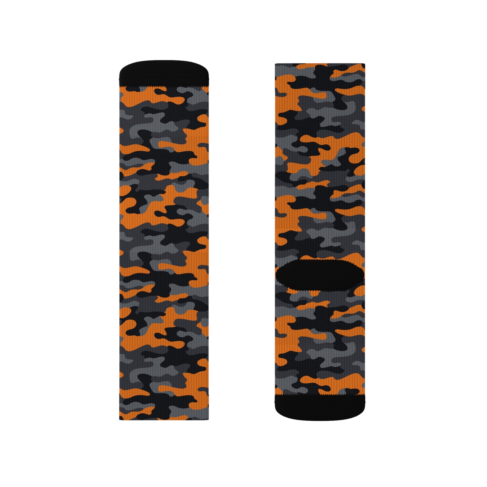Stay invisible and stylish with our Camo Socks. Featuring a striking blend of orange, black, and gray camouflage, these socks are perfect for blending in and standing out. Made with high-quality materials, they provide both comfort and durability. Dominate any terrain with these camo socks.