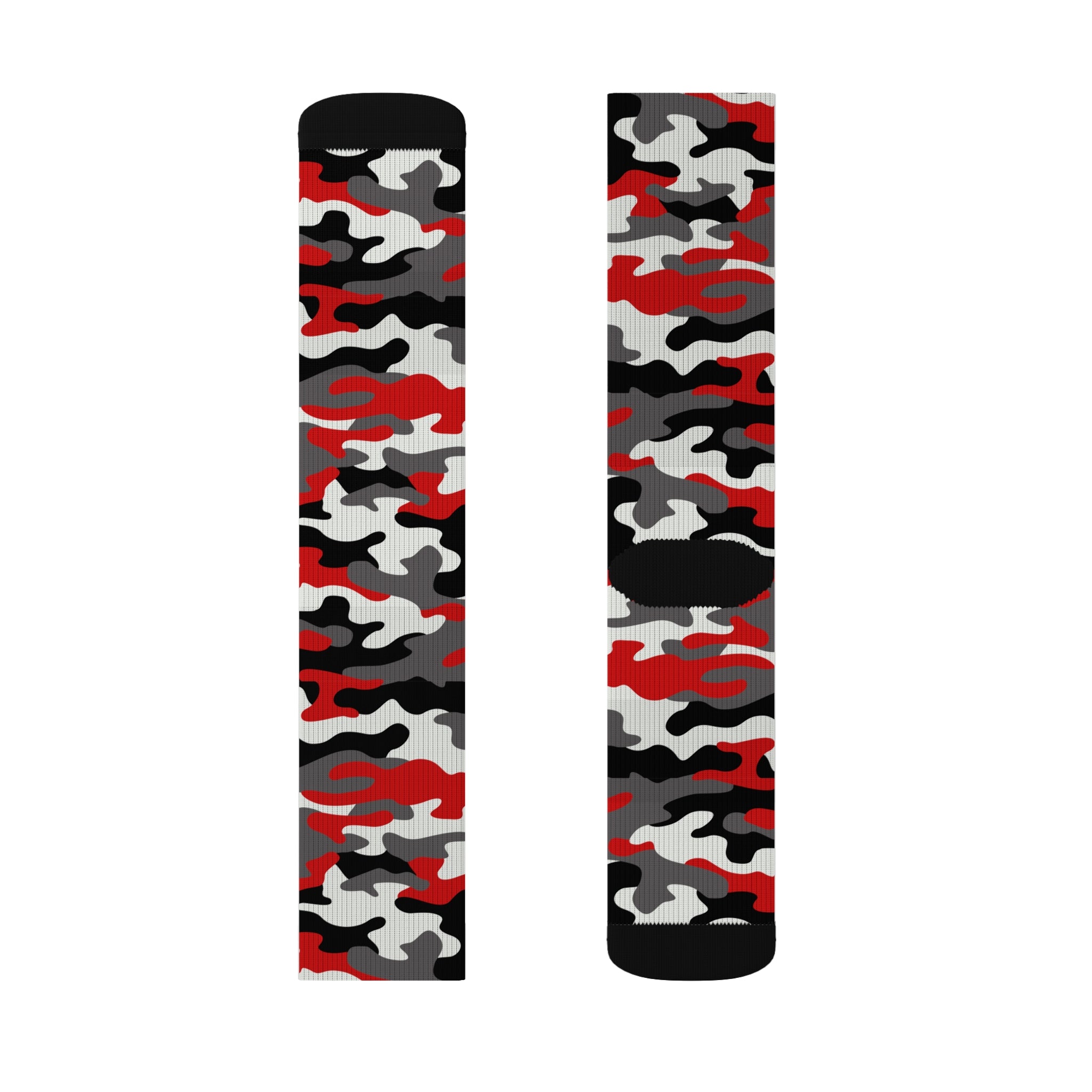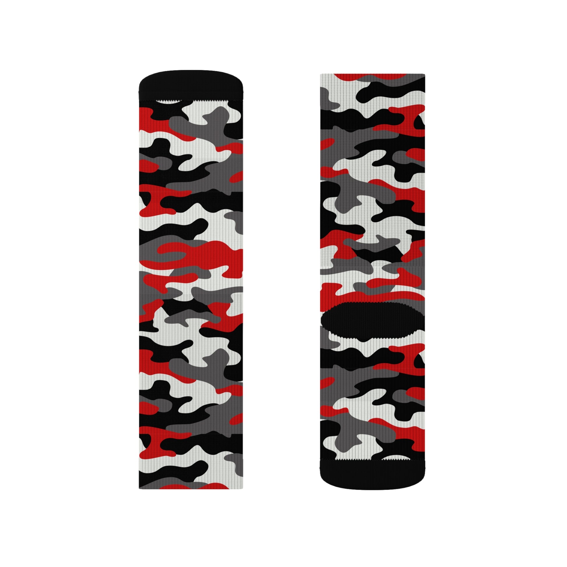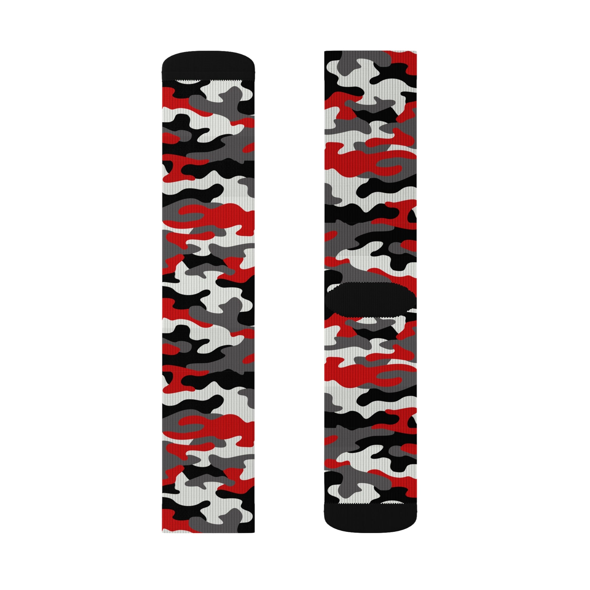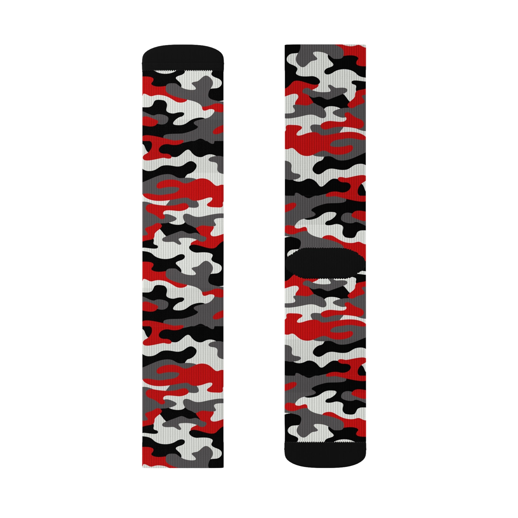 Add a touch of style to your outfit with our Camo Socks. The striking red, black, and white camouflage design will turn heads while the comfortable fit ensures all-day wear. Stand out while staying comfortable with these must-have socks.