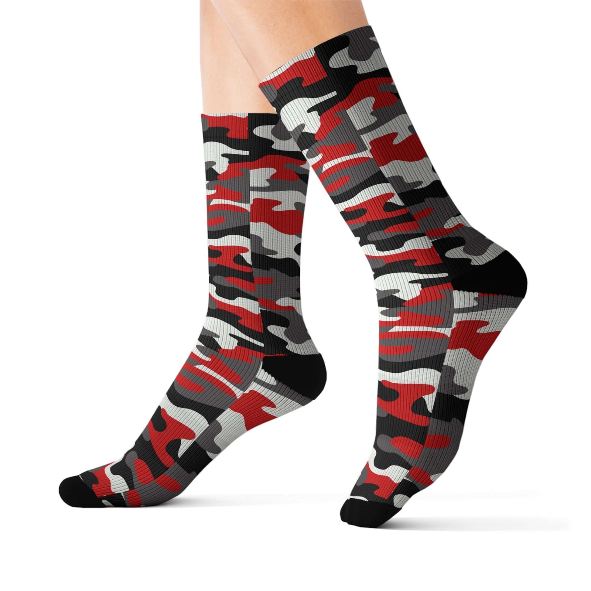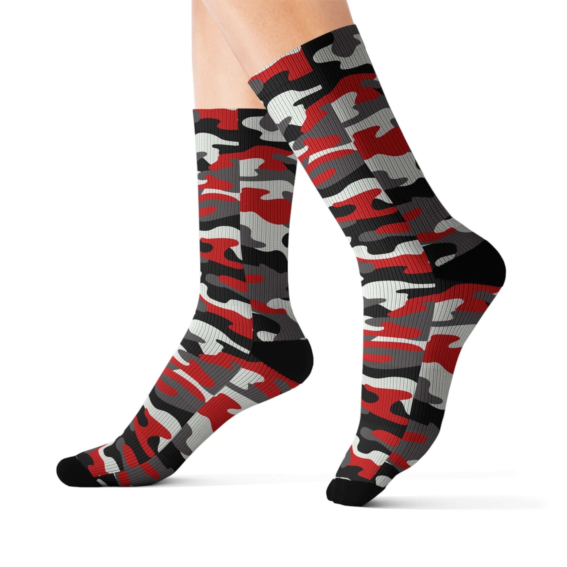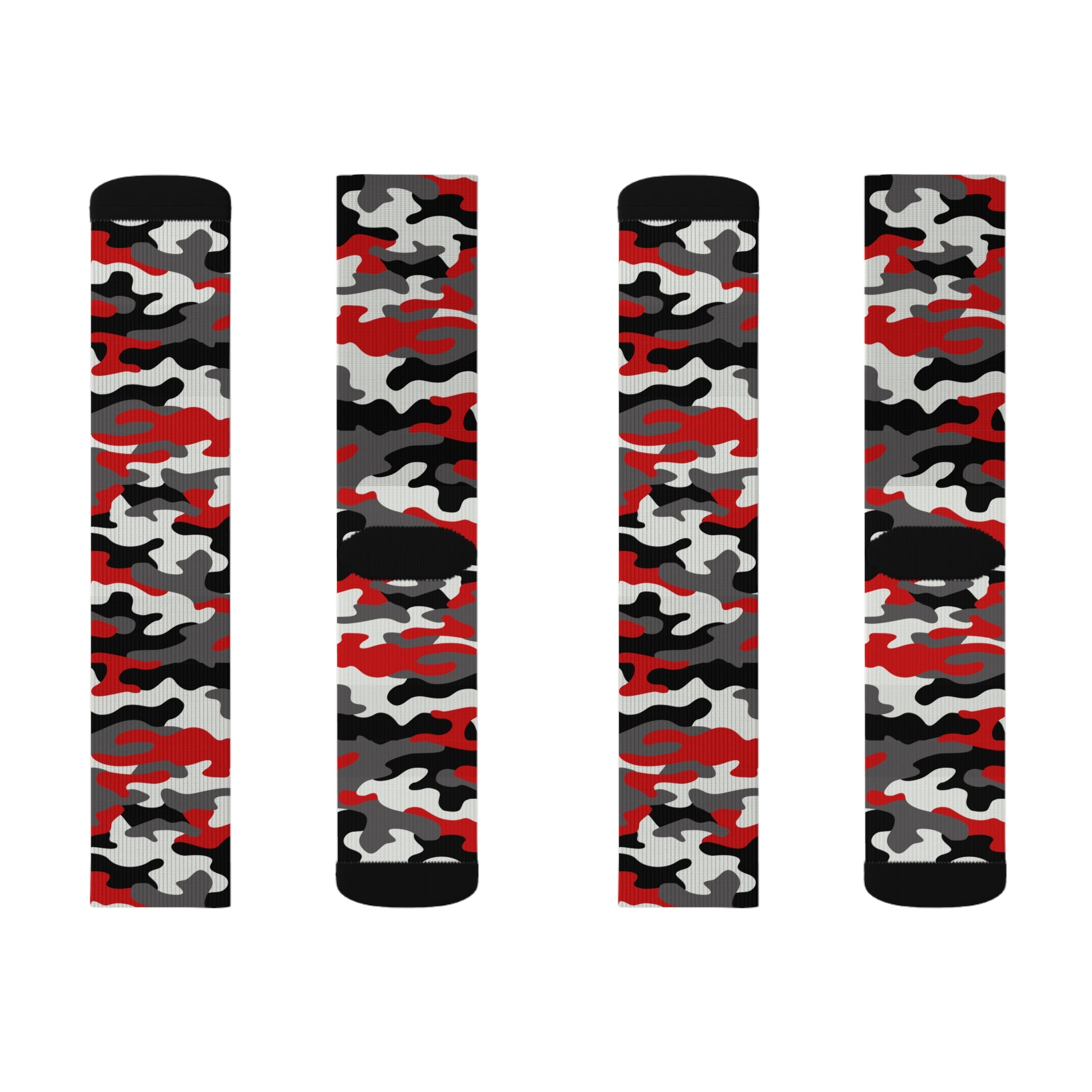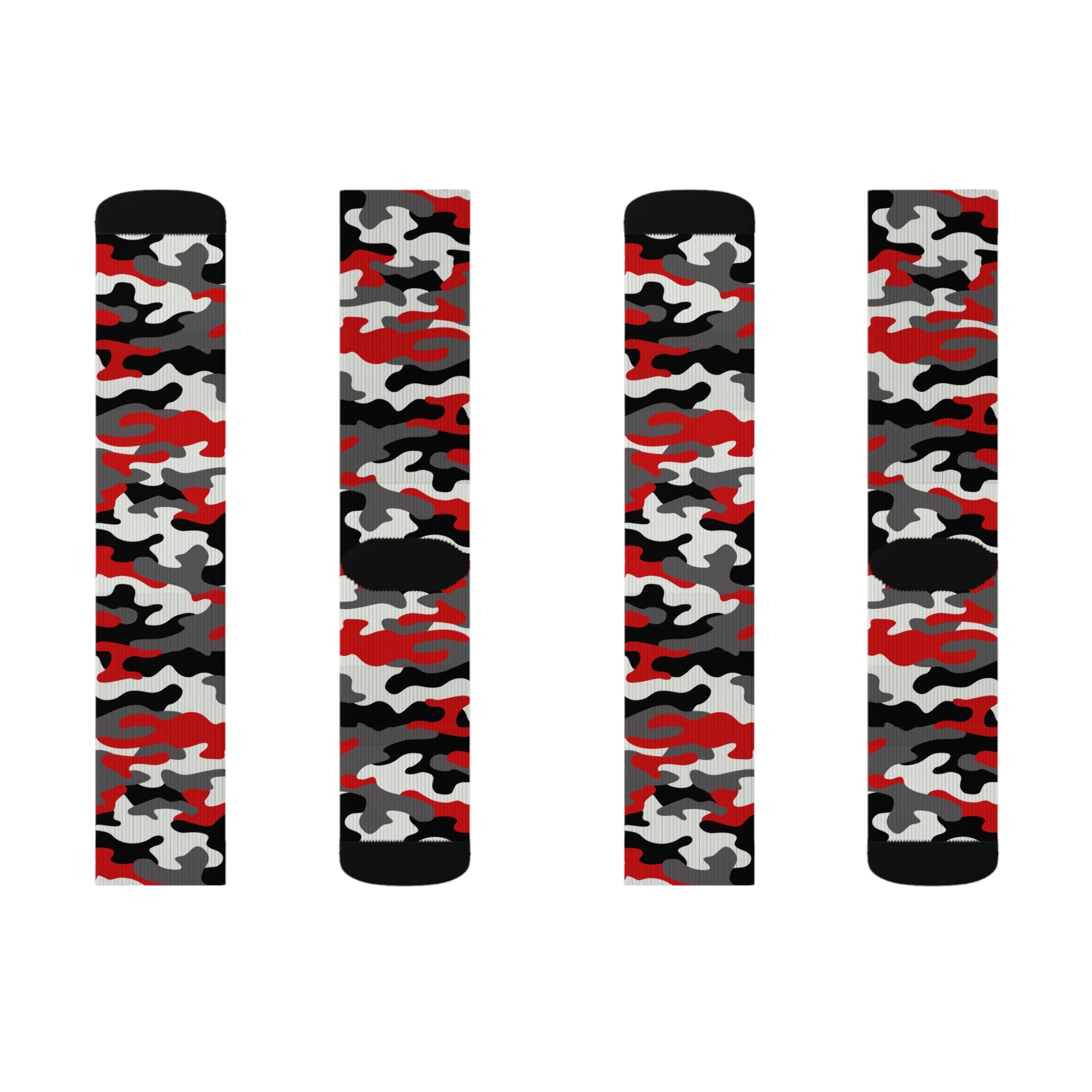 Add a touch of style to your outfit with our Camo Socks. The striking red, black, and white camouflage design will turn heads while the comfortable fit ensures all-day wear. Stand out while staying comfortable with these must-have socks.