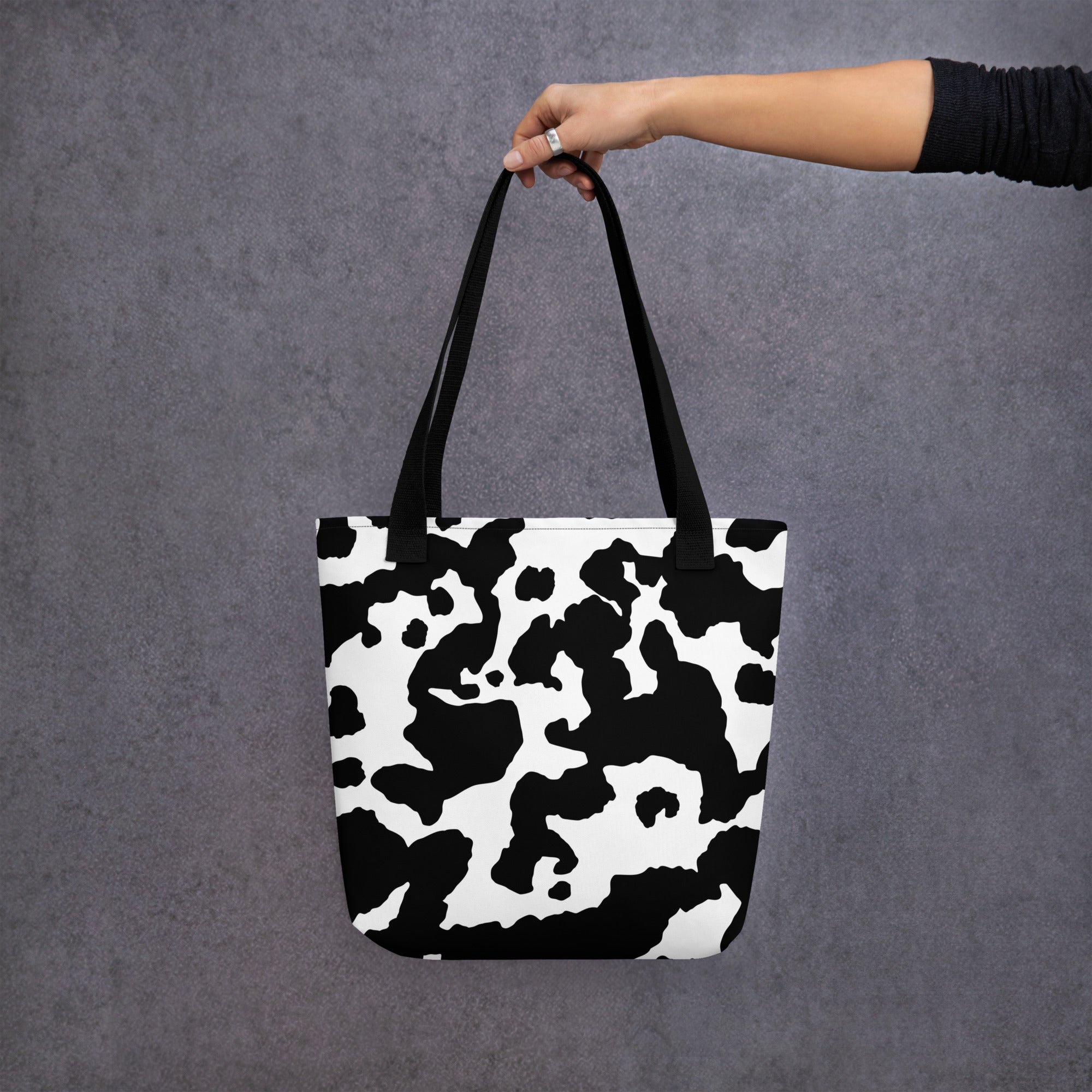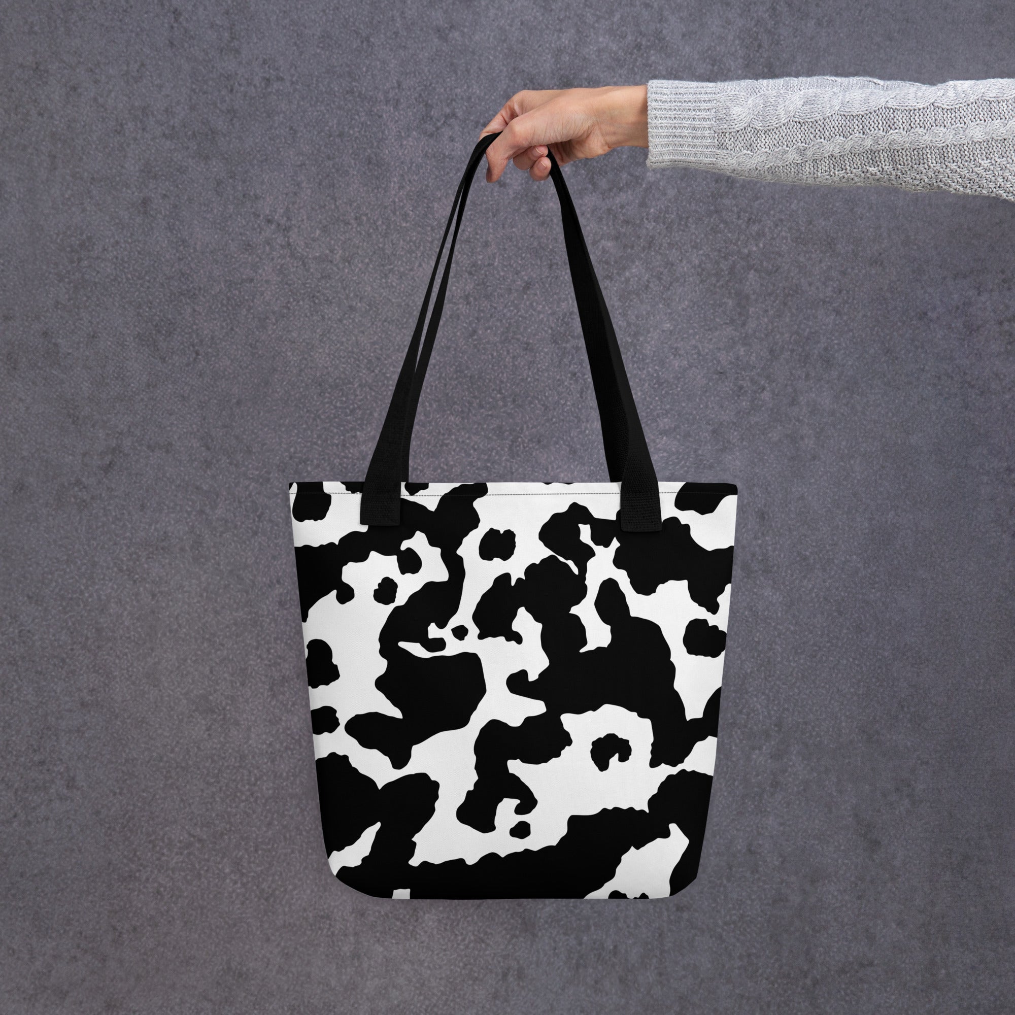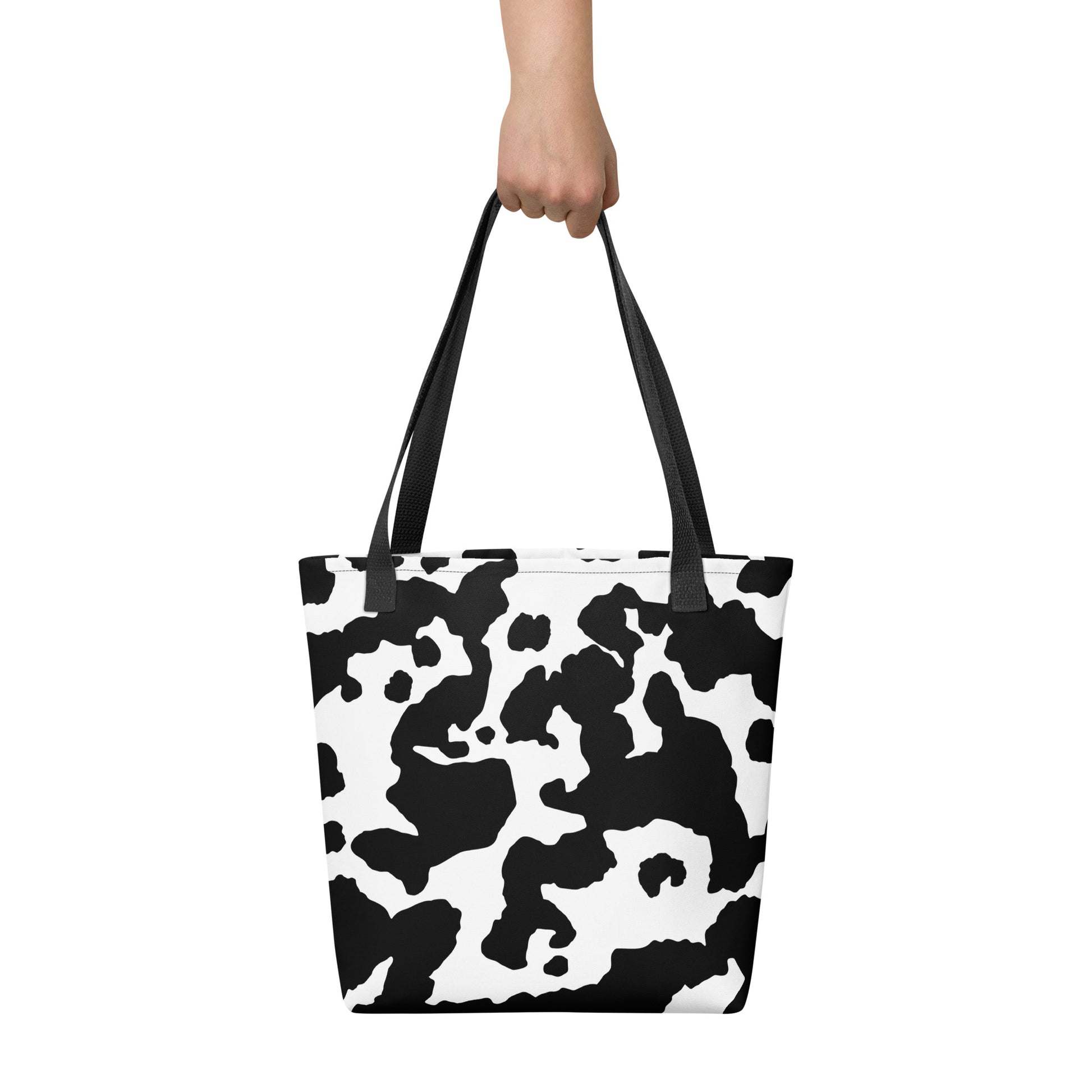 Introducing our versatile Camo Tote Bag. The perfect accessory for the stylish yet practical individual. Crafted with a unique Black & White Cow Camouflage design, this bag will not only make a statement but also provide ample storage space. Embrace the trend and elevate your everyday style.