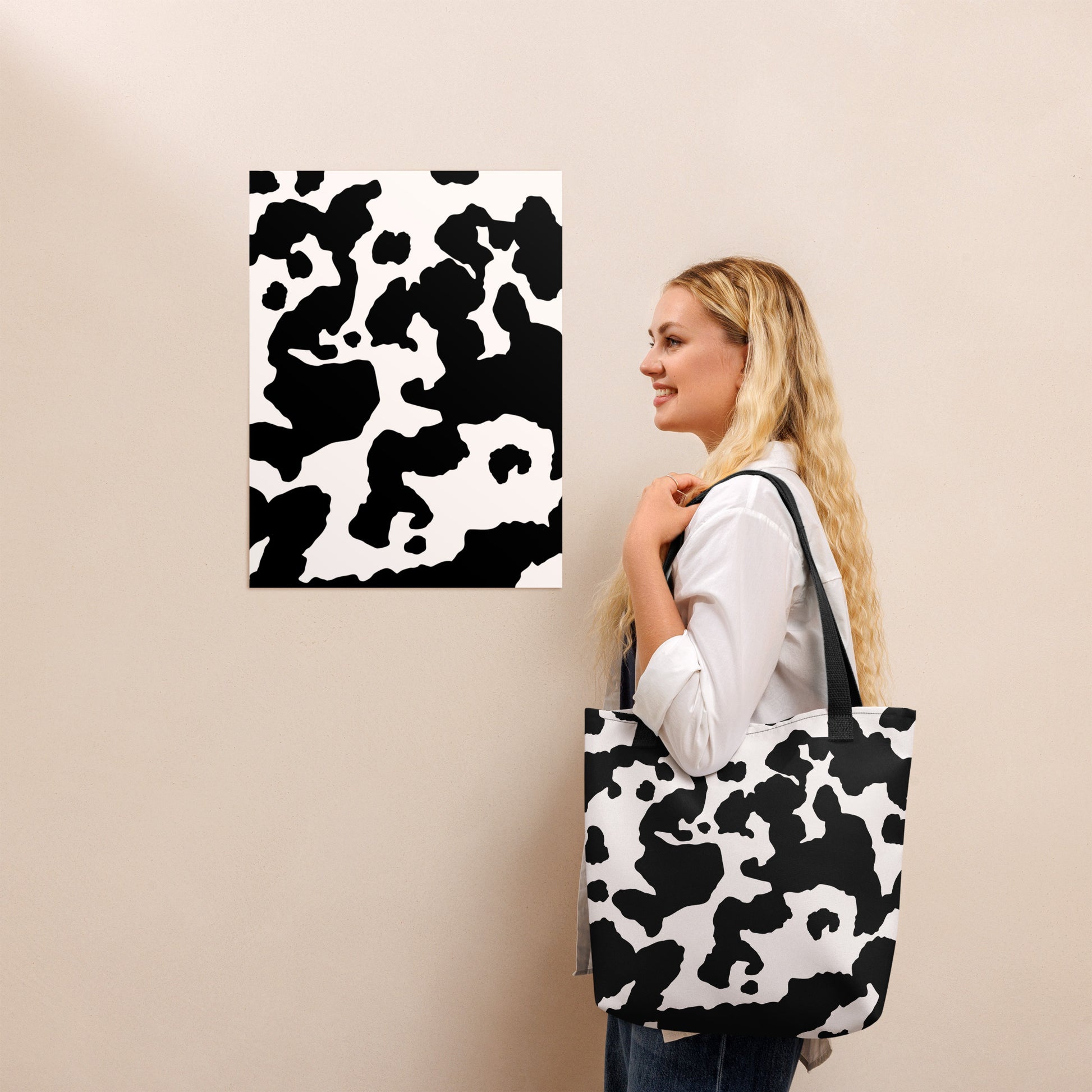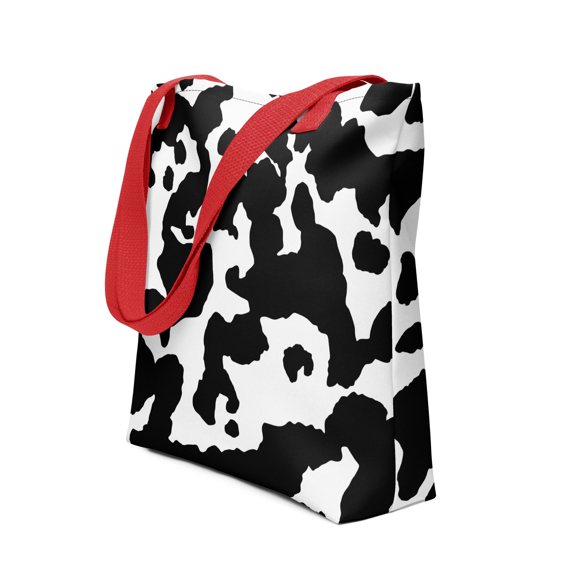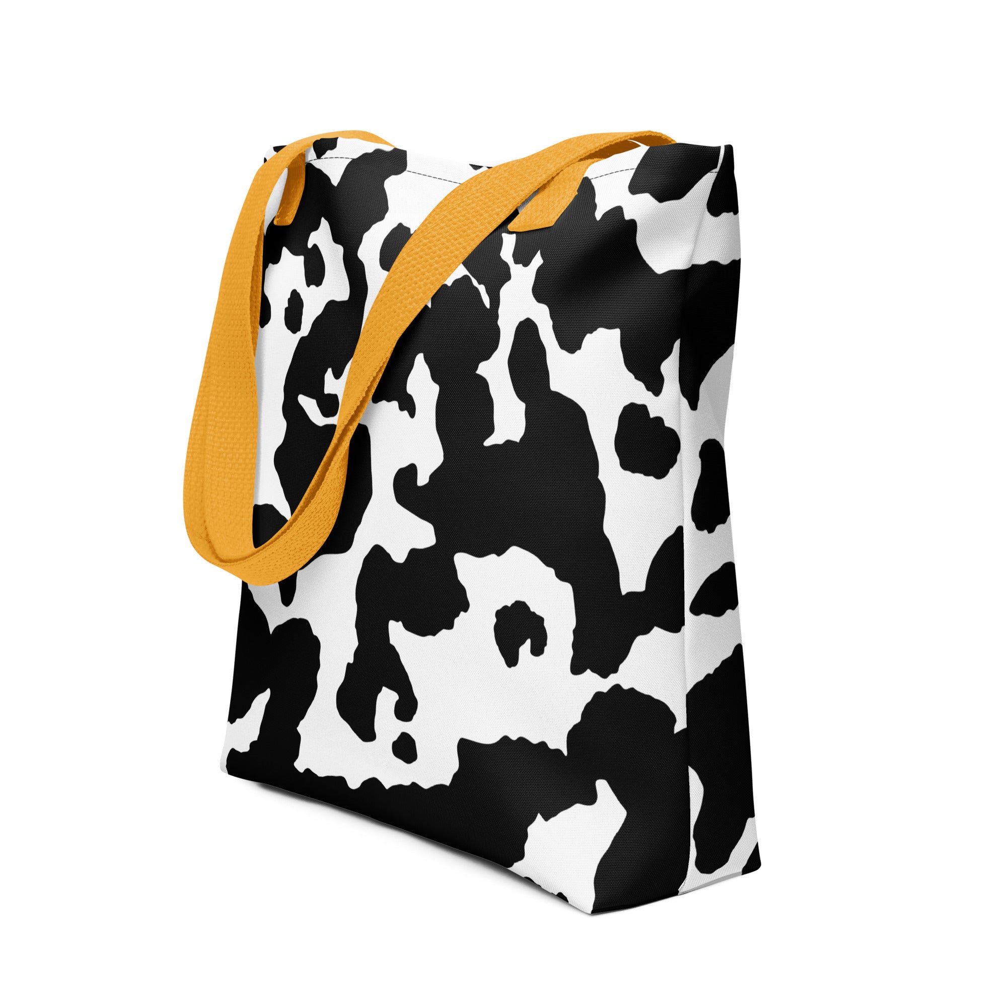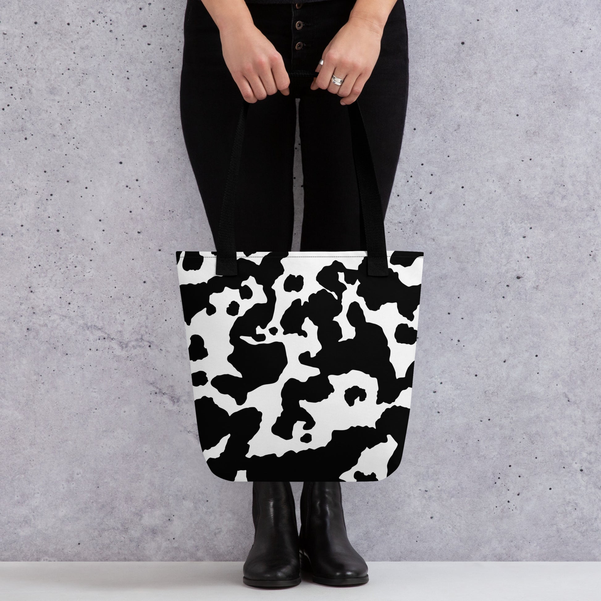 Introducing our versatile Camo Tote Bag. The perfect accessory for the stylish yet practical individual. Crafted with a unique Black & White Cow Camouflage design, this bag will not only make a statement but also provide ample storage space. Embrace the trend and elevate your everyday style.