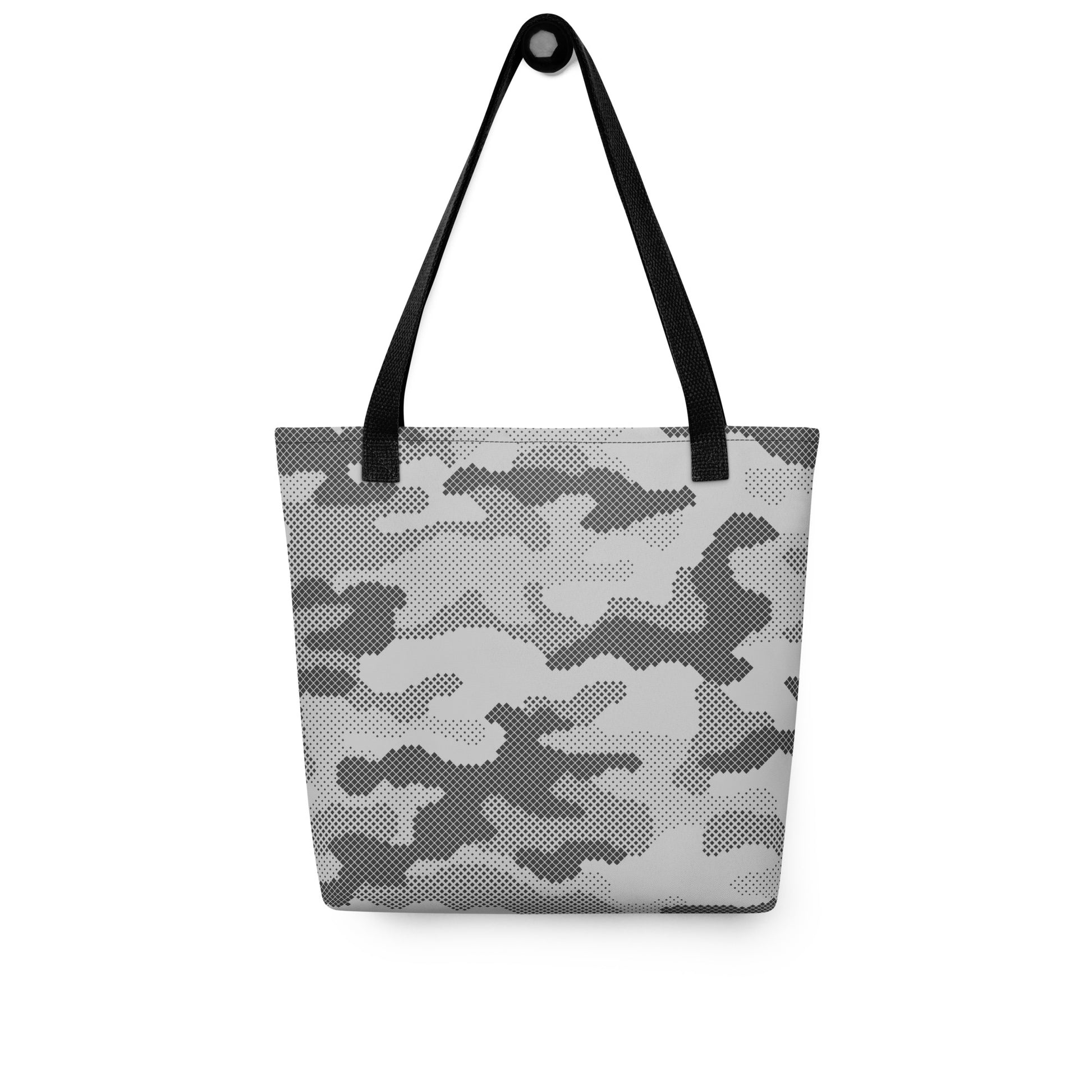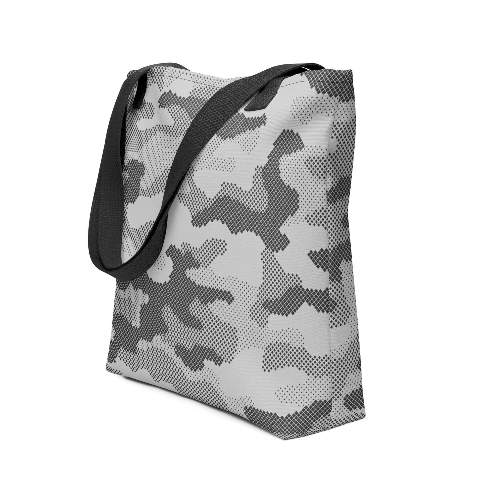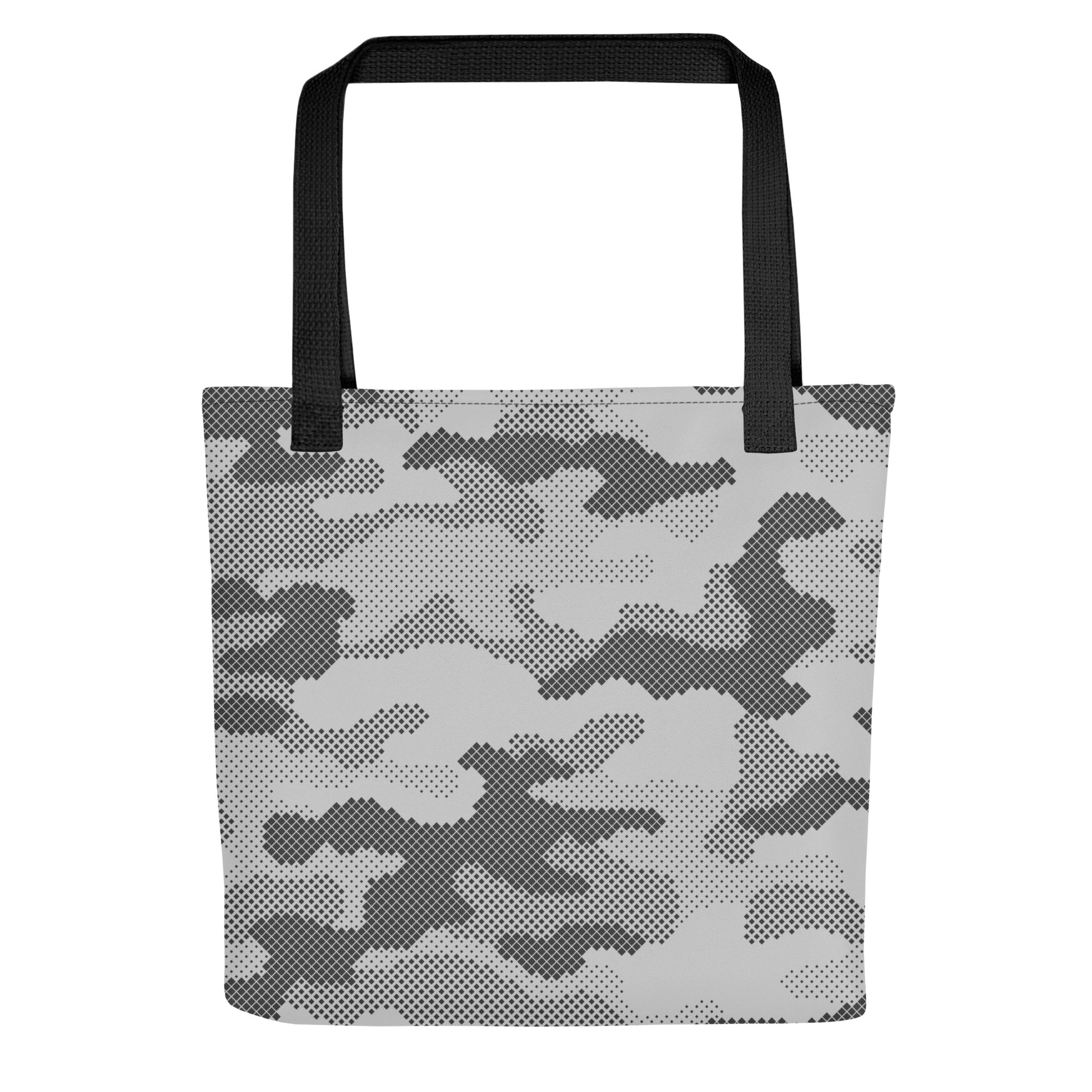 This Camo Tote Bag features a unique gray digital camouflage design, perfect for those looking to make a statement. Made with high-quality materials, this bag is durable and practical for everyday use. Add a touch of style to your wardrobe with this stylish and modern tote bag.