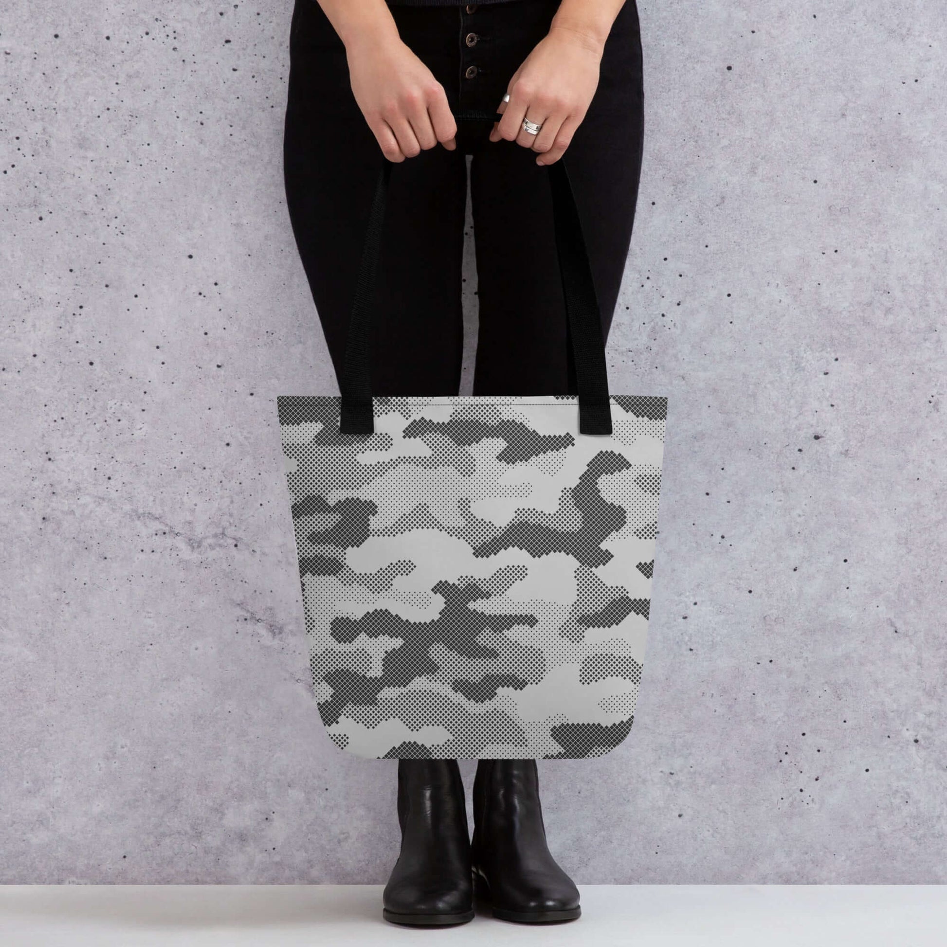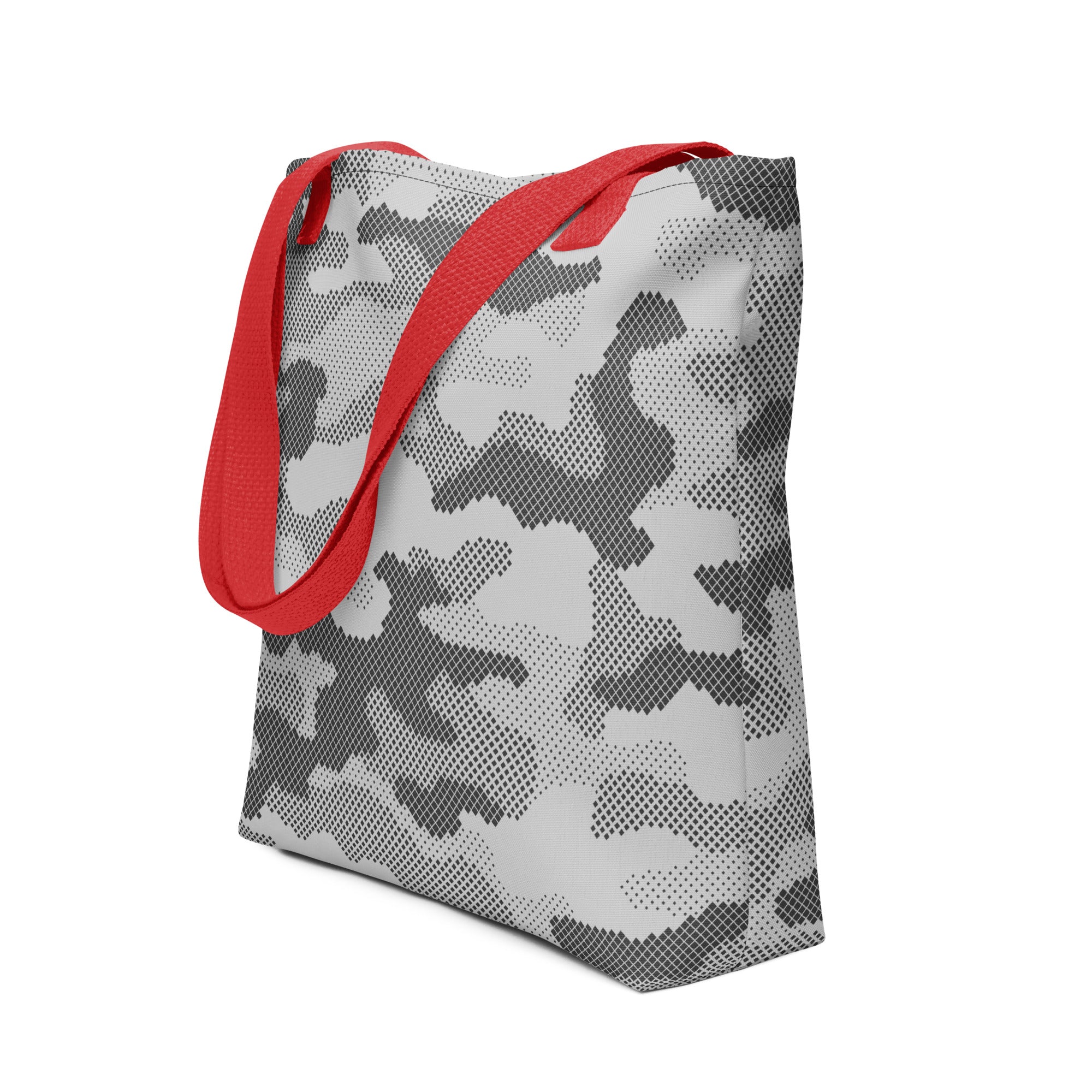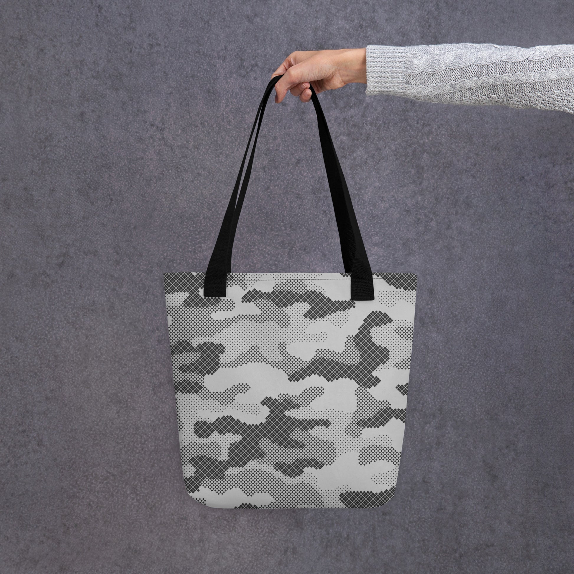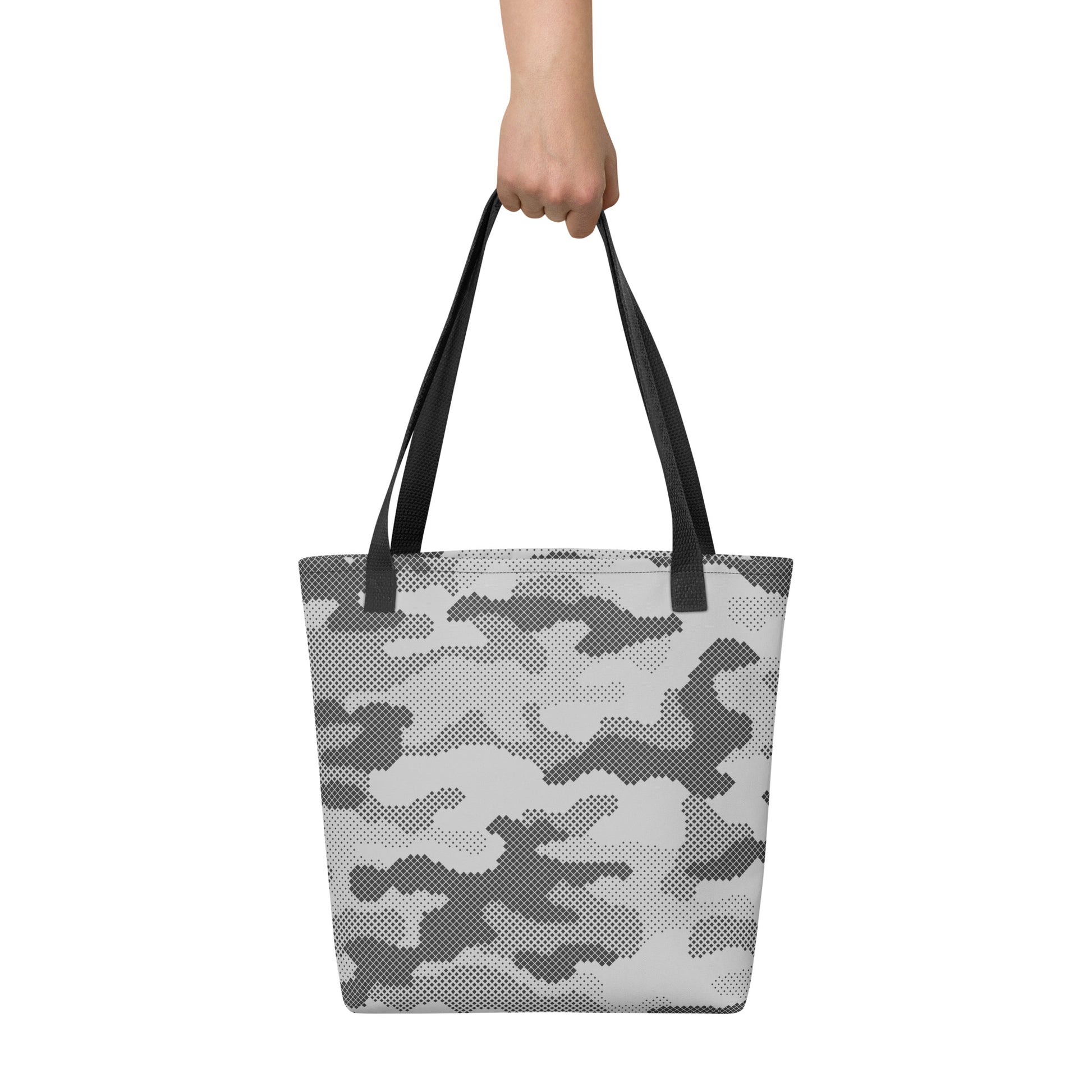 This Camo Tote Bag features a unique gray digital camouflage design, perfect for those looking to make a statement. Made with high-quality materials, this bag is durable and practical for everyday use. Add a touch of style to your wardrobe with this stylish and modern tote bag.