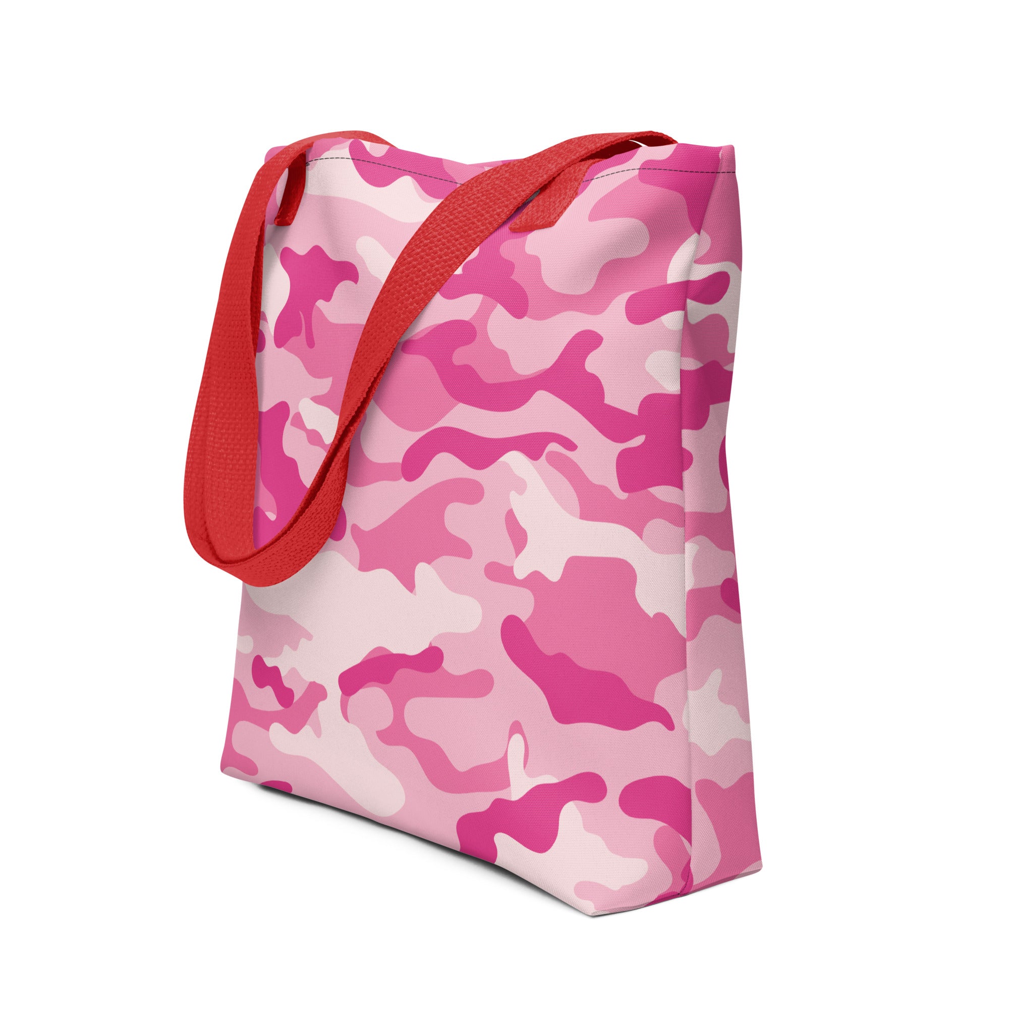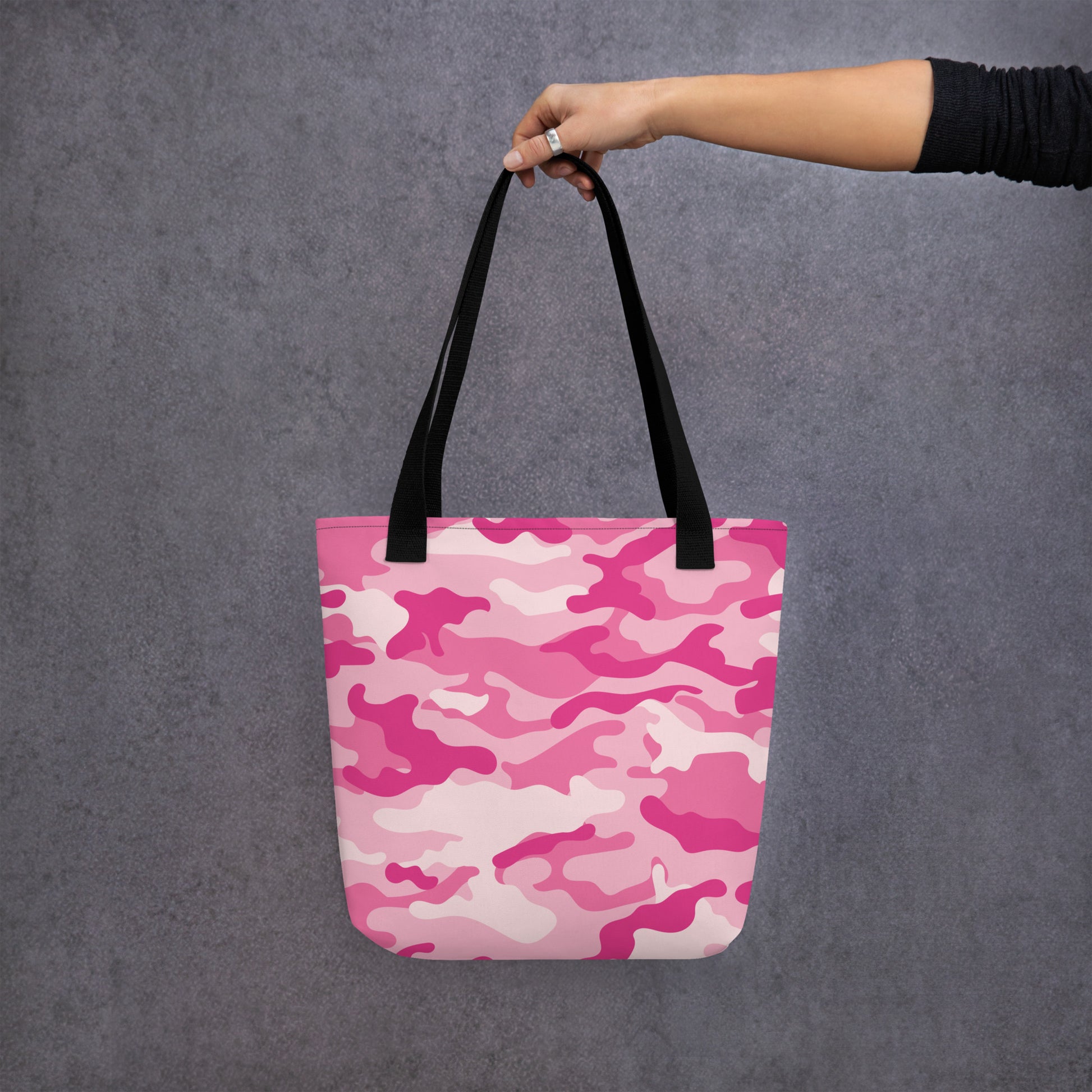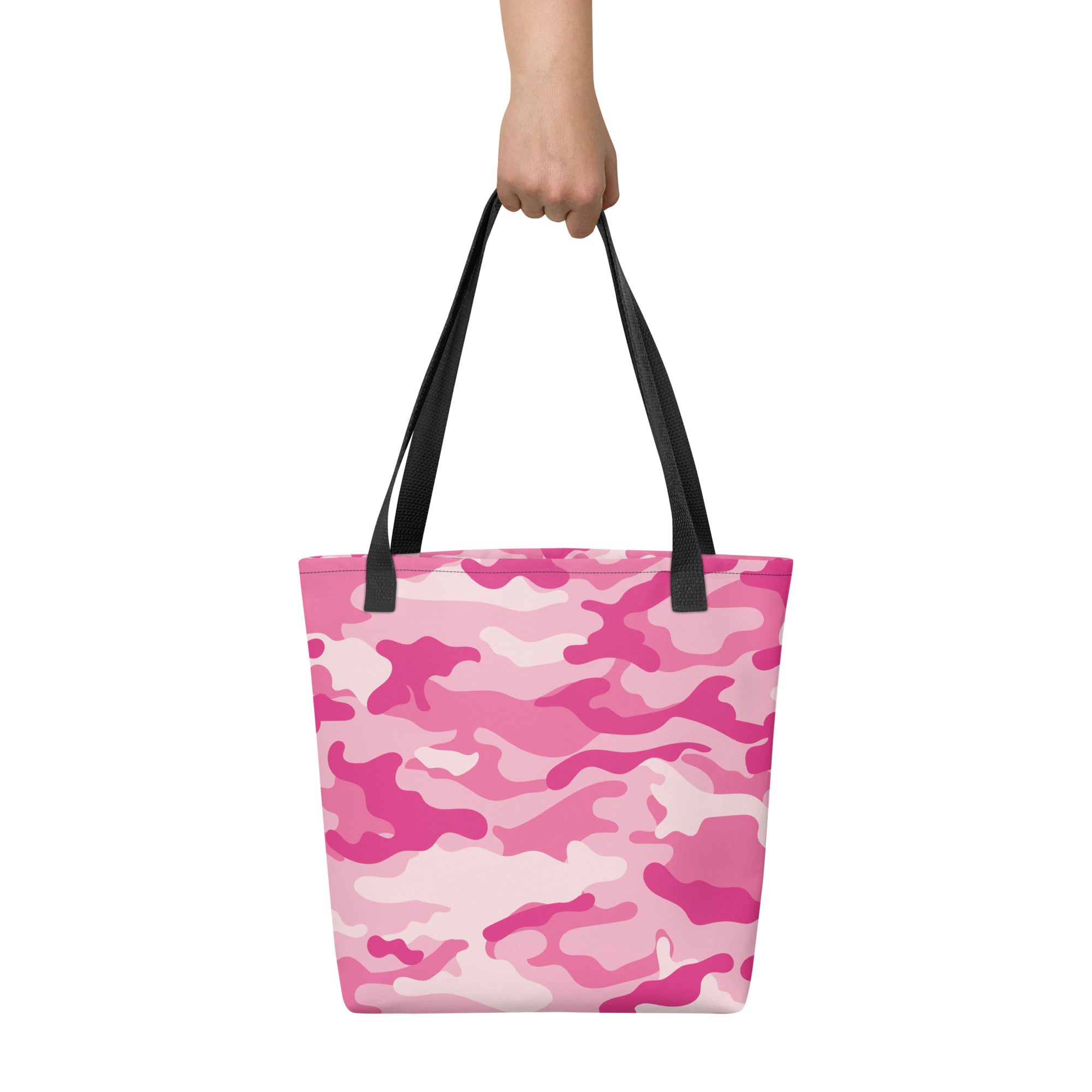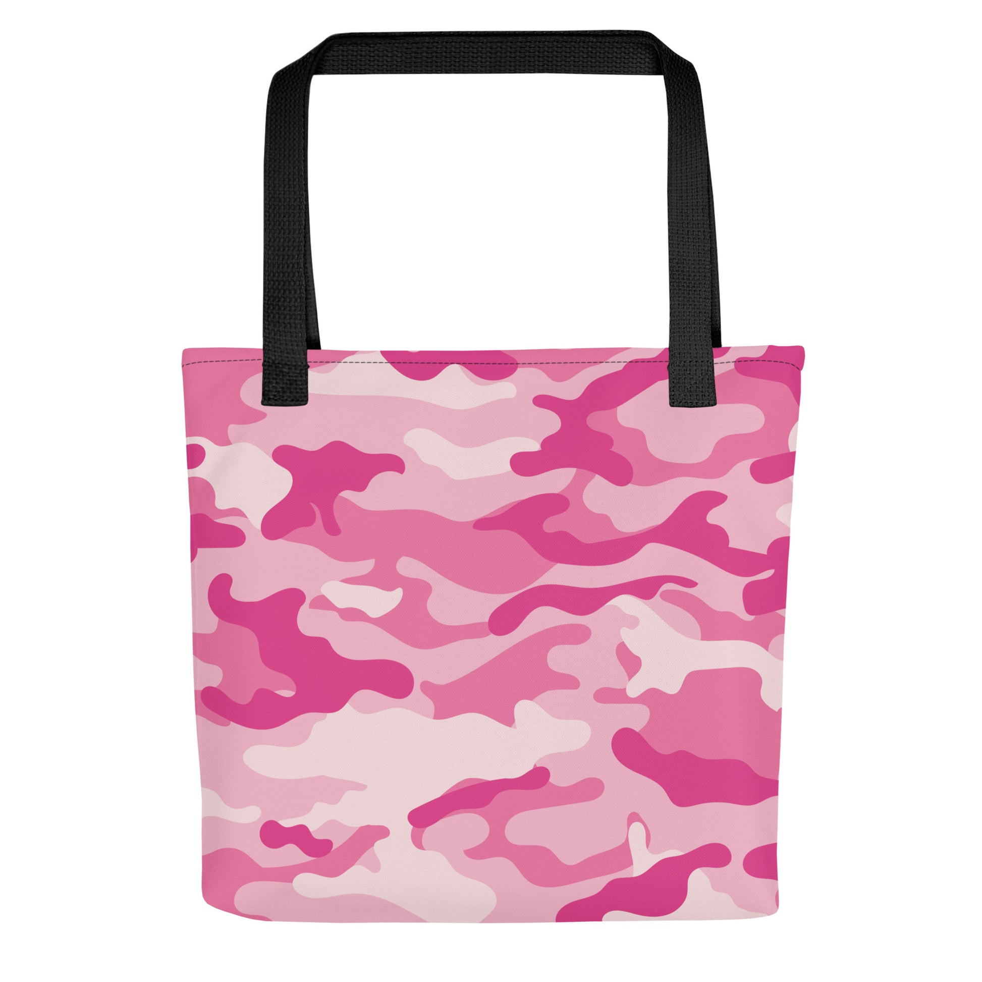 This Camo Tote Bag features a unique Lavender Pink Camouflage design. Its spacious interior is perfect for carrying all your essentials. Made from durable materials, it provides both functionality and style. Stand out with this fashionable and practical tote bag.