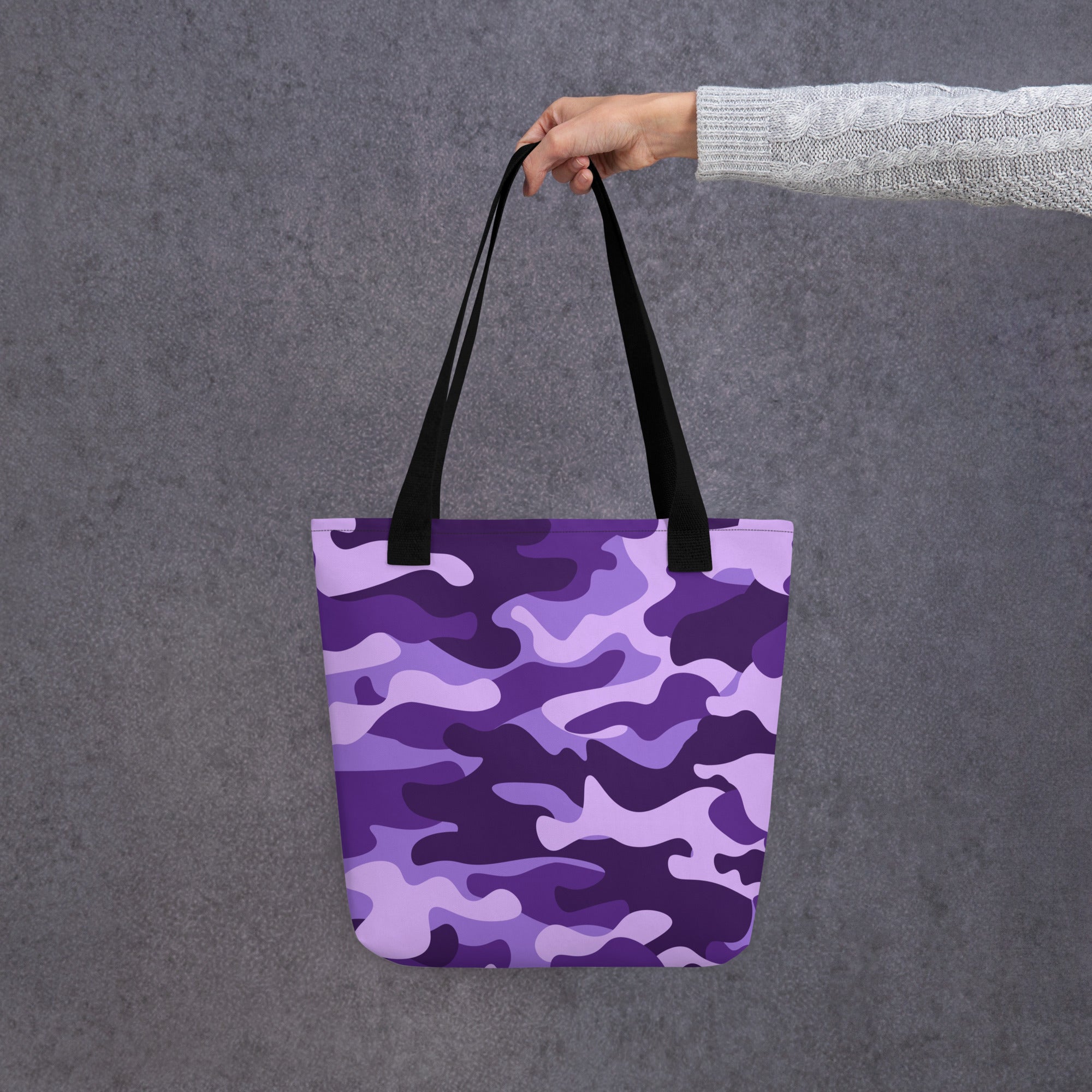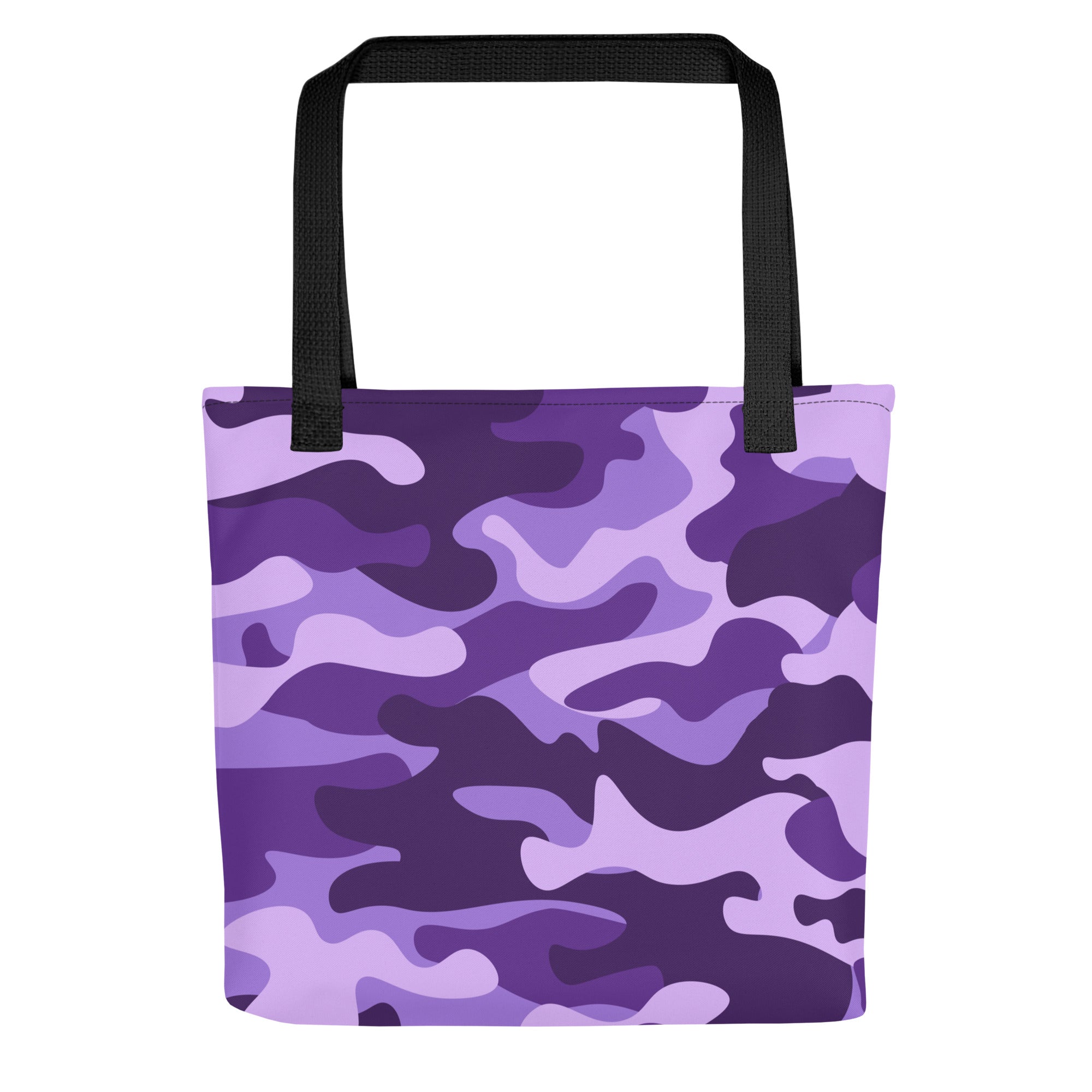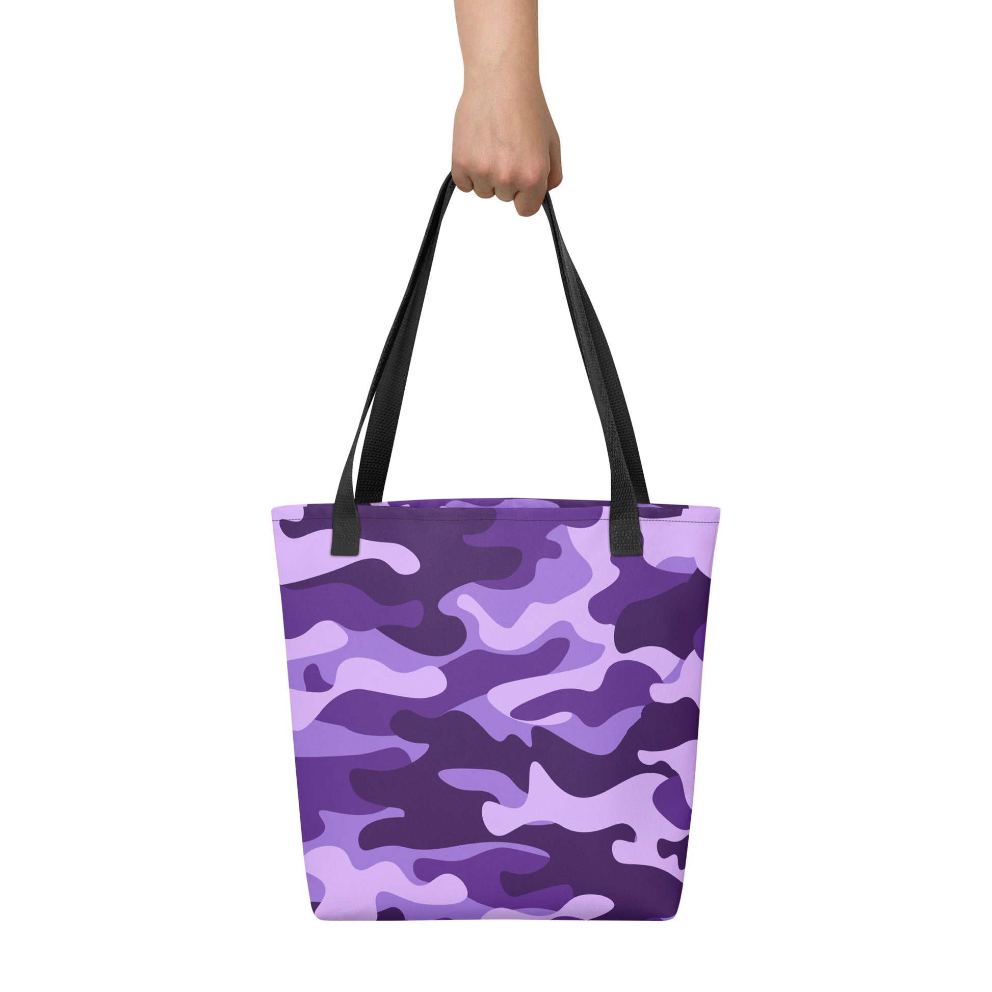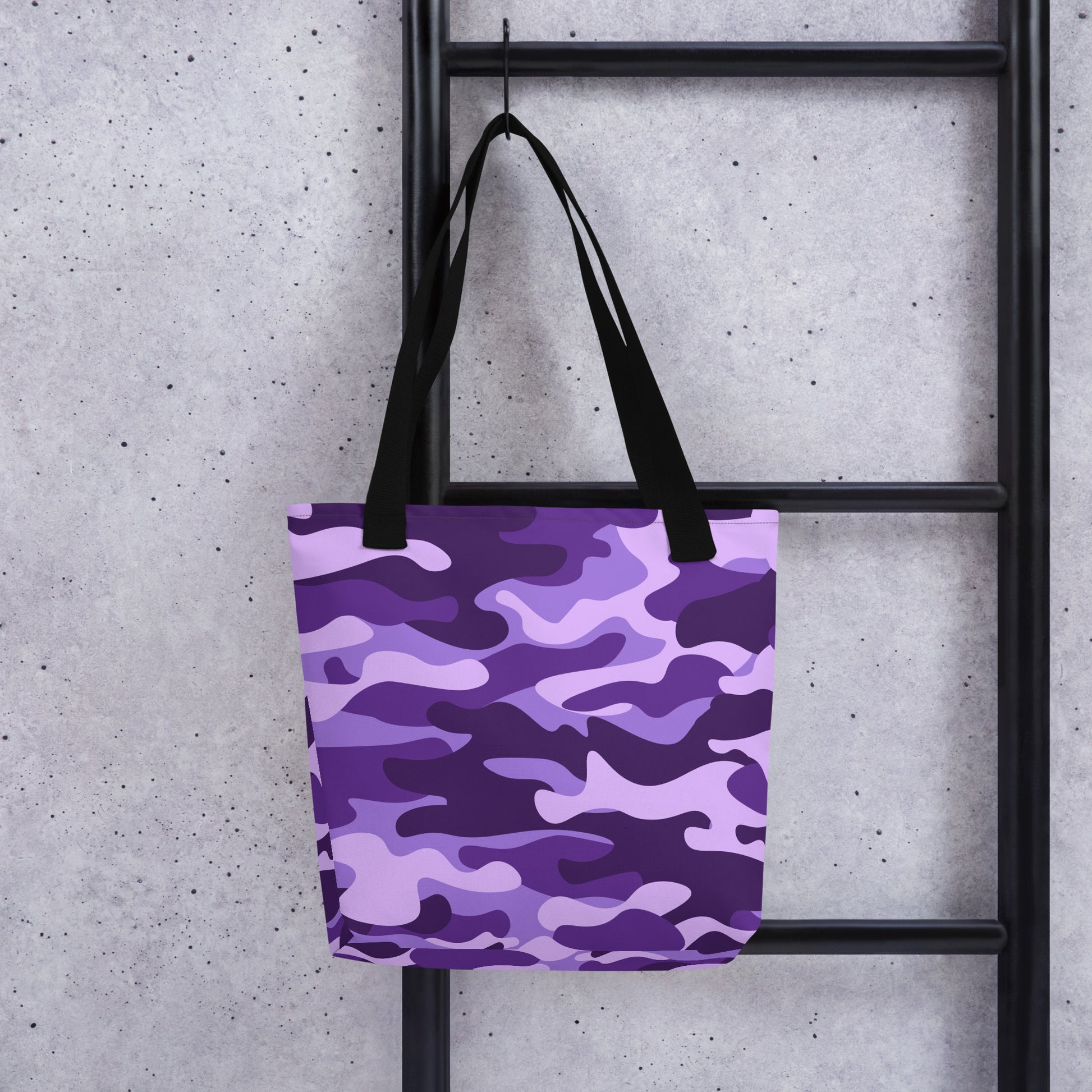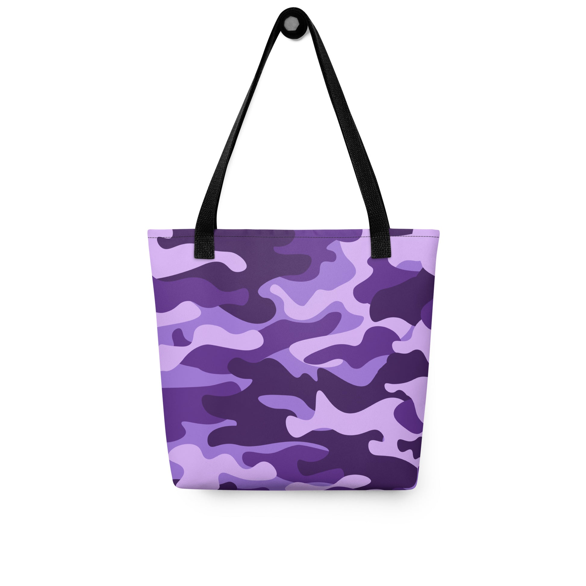 This versatile Camo Tote Bag in Purple, Blue, and Mauve Camouflage adds a touch of style to any outfit. With its spacious interior and durable construction, this bag is perfect for everyday use. Its unique camouflage pattern will make a bold statement while keeping all your belongings organized.
