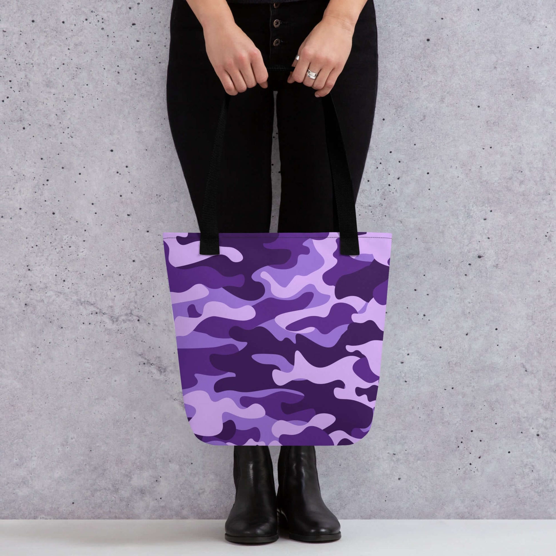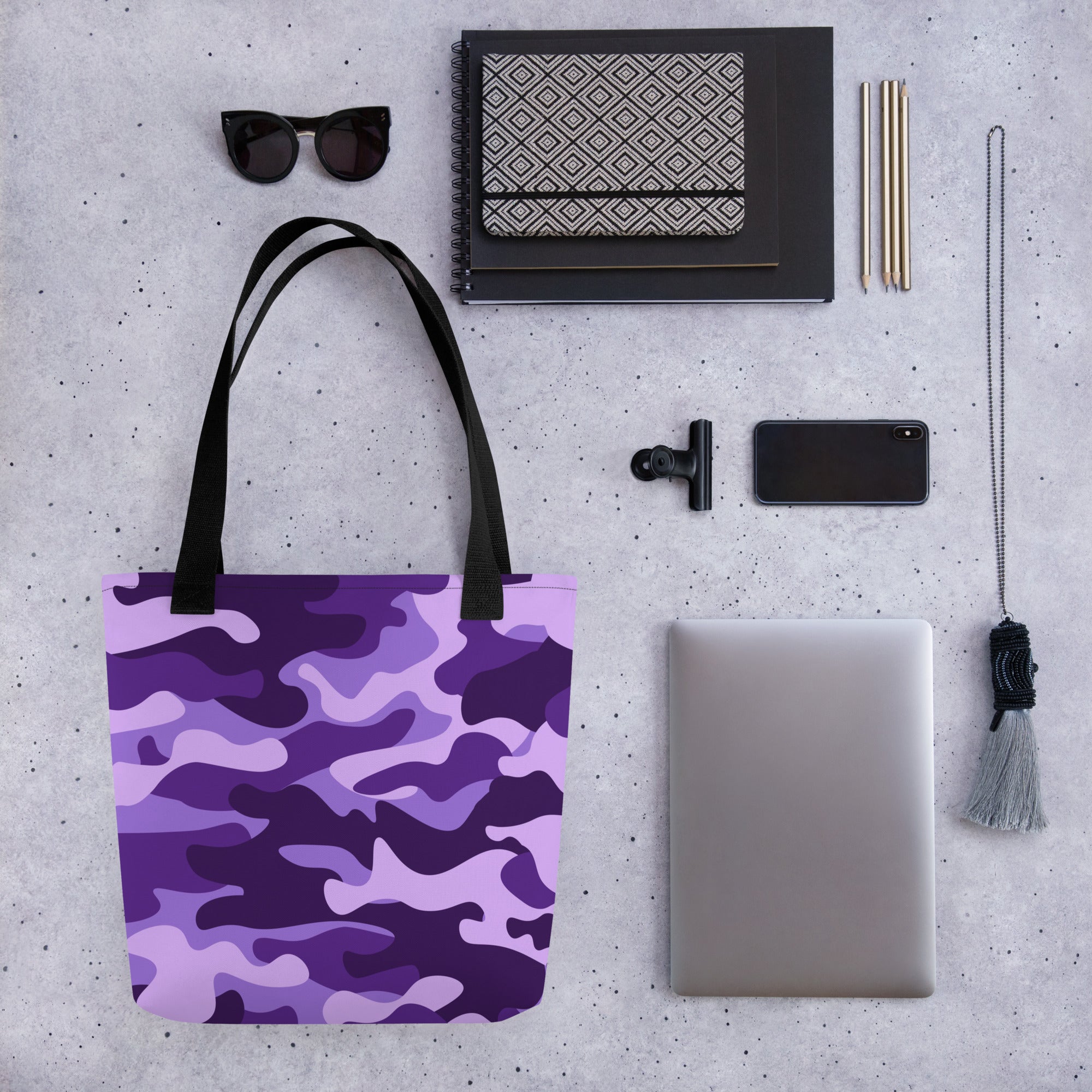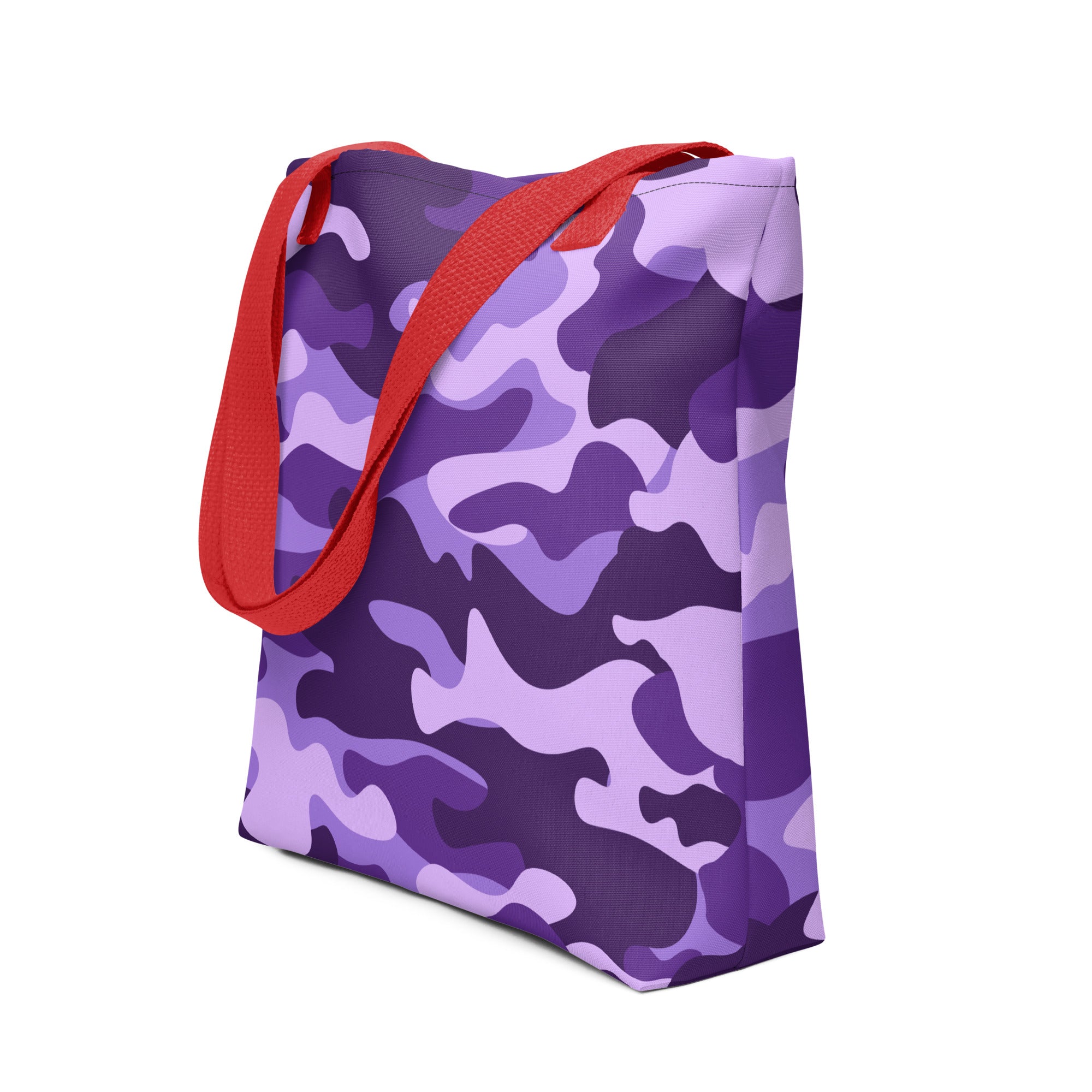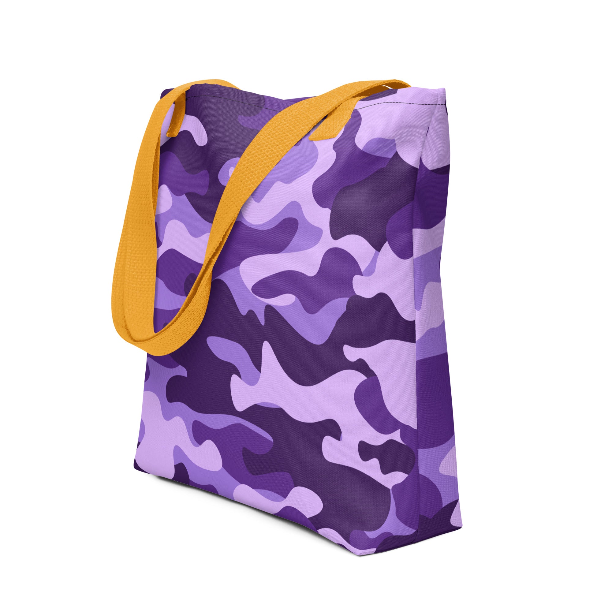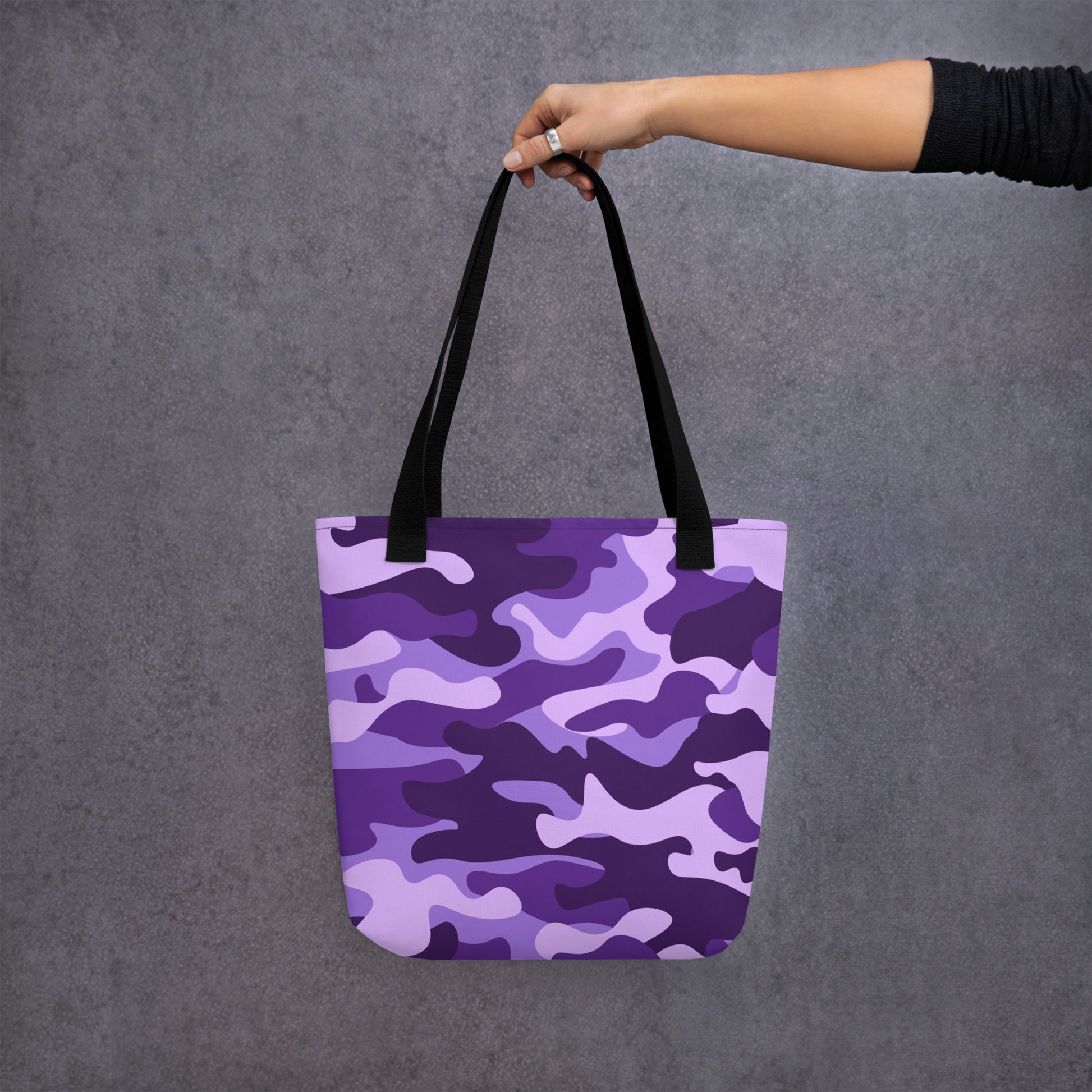 This versatile Camo Tote Bag in Purple, Blue, and Mauve Camouflage adds a touch of style to any outfit. With its spacious interior and durable construction, this bag is perfect for everyday use. Its unique camouflage pattern will make a bold statement while keeping all your belongings organized.