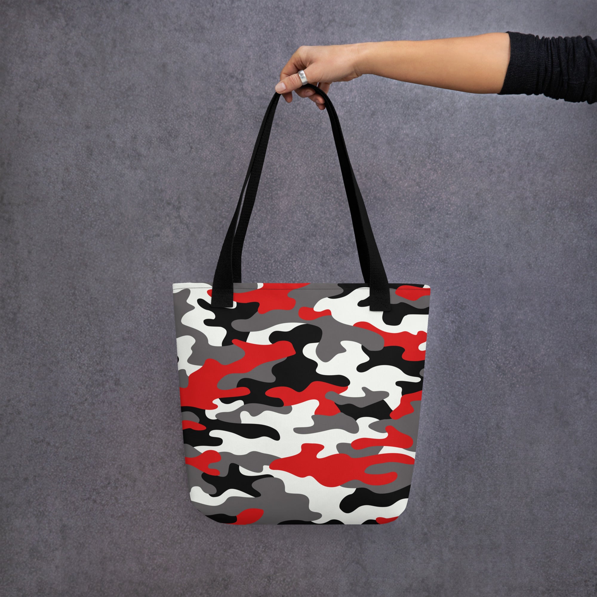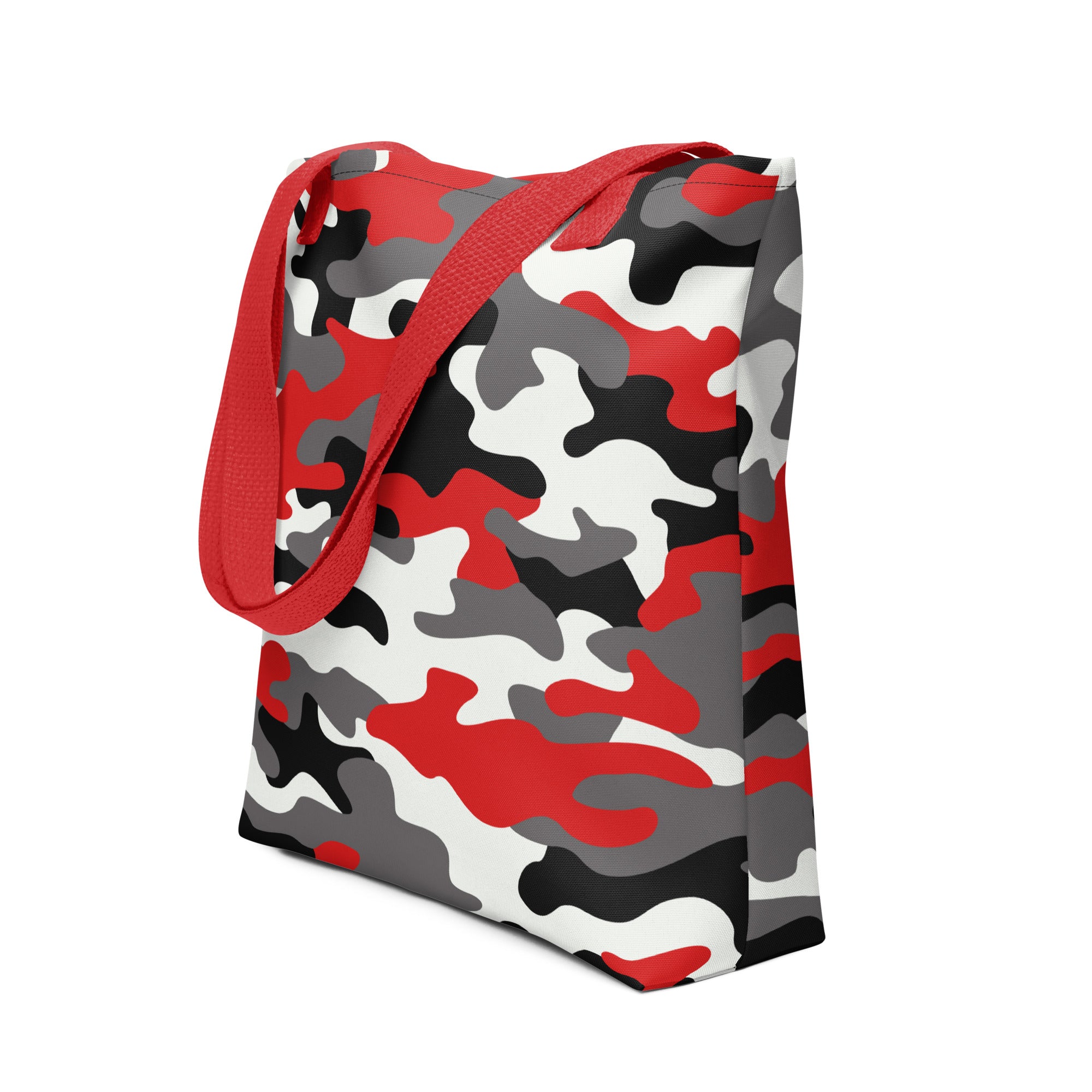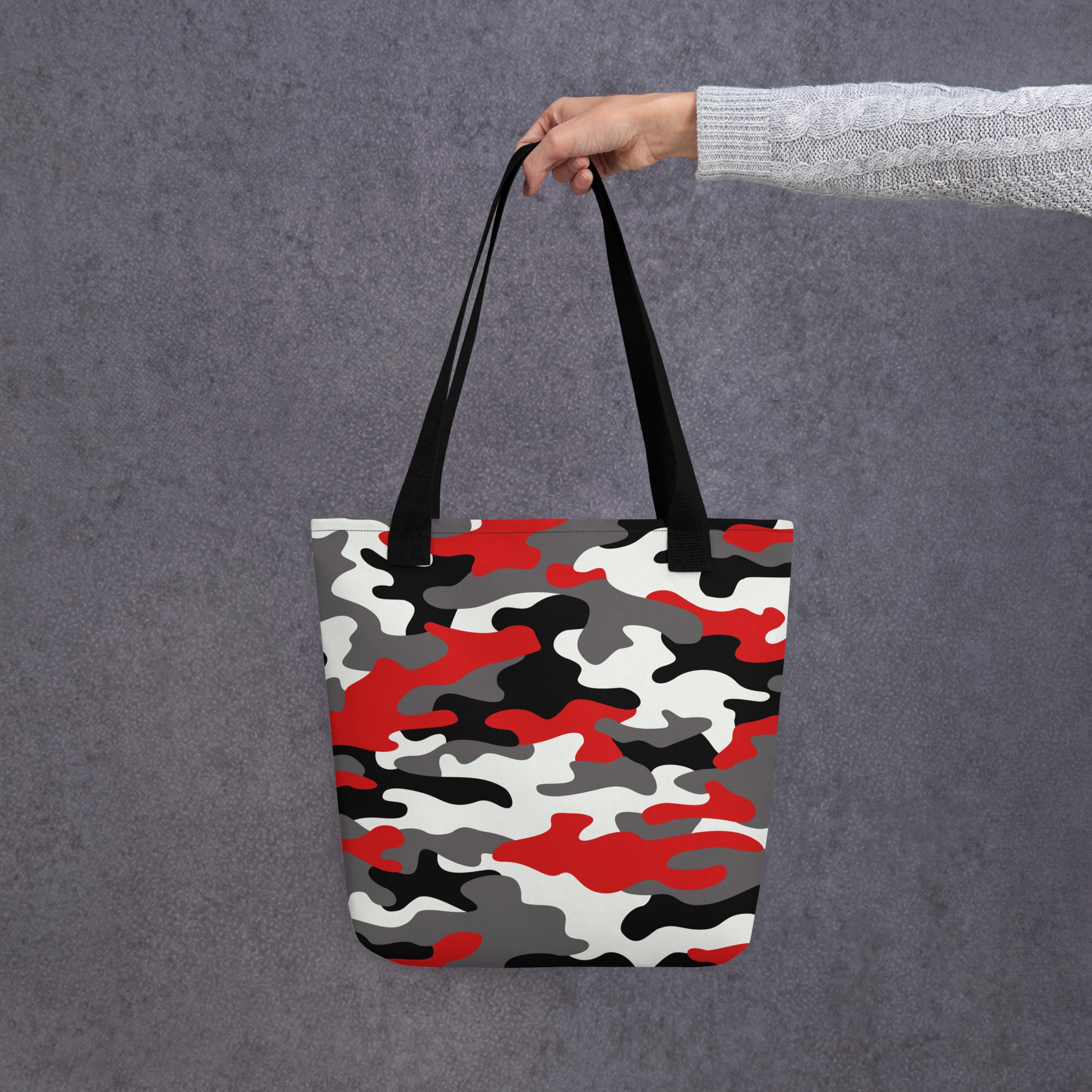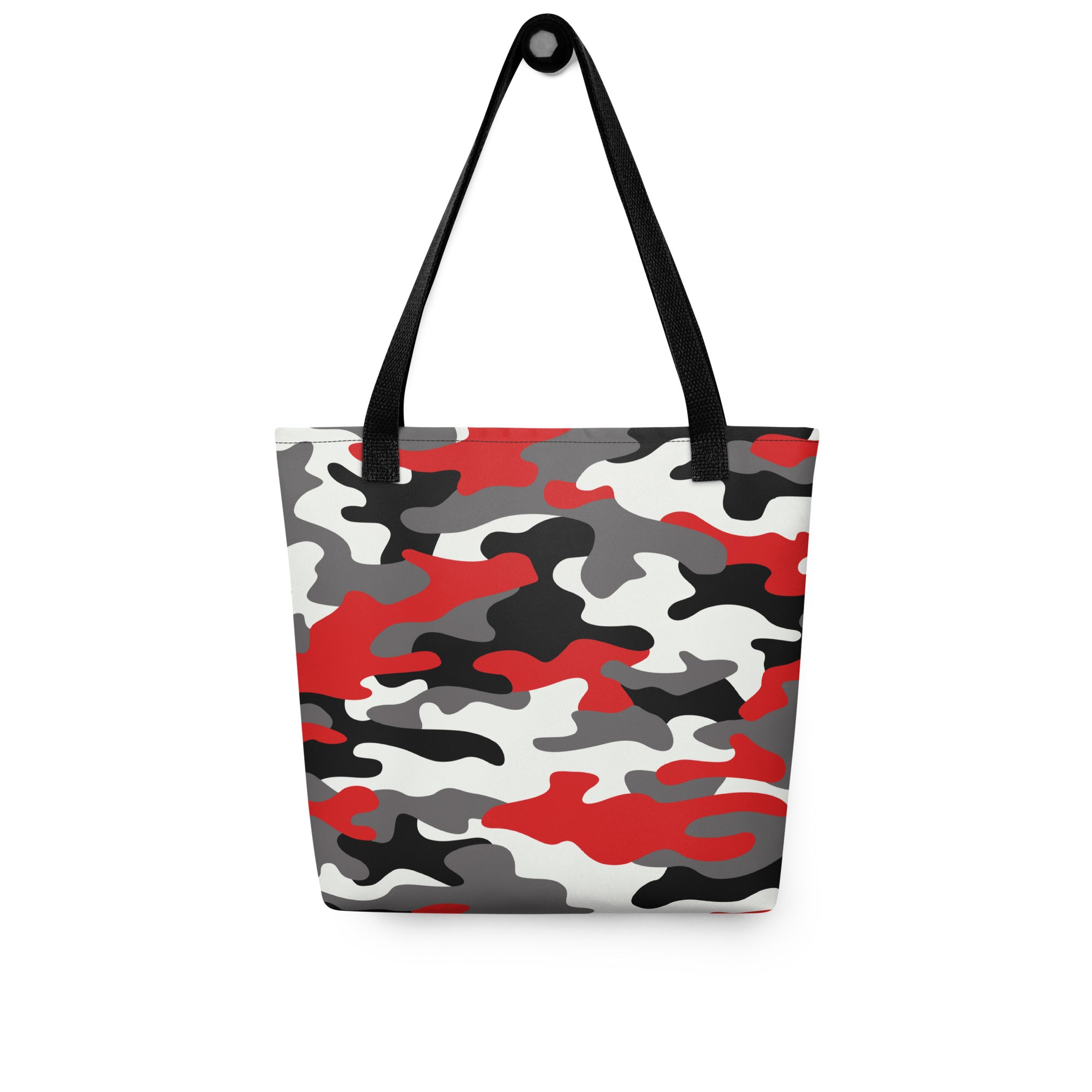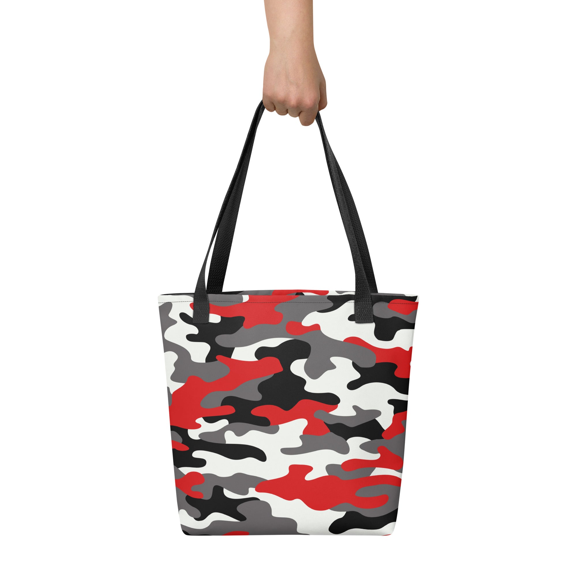 Our Camo Tote Bag features a stylish Red, Black & White Camouflage design, perfect for adding a touch of edgy style to any outfit. The durable material and spacious interior make it a versatile choice for everyday use. Stand out from the crowd with this trendy and functional tote.