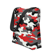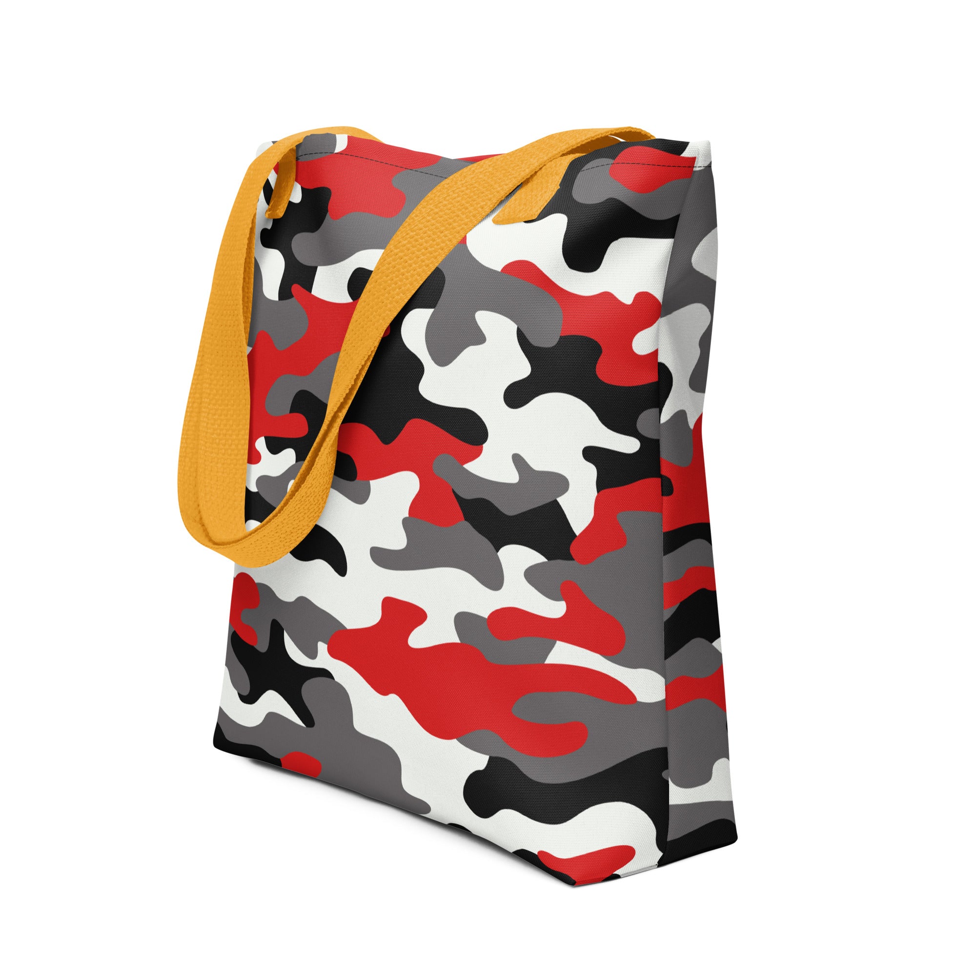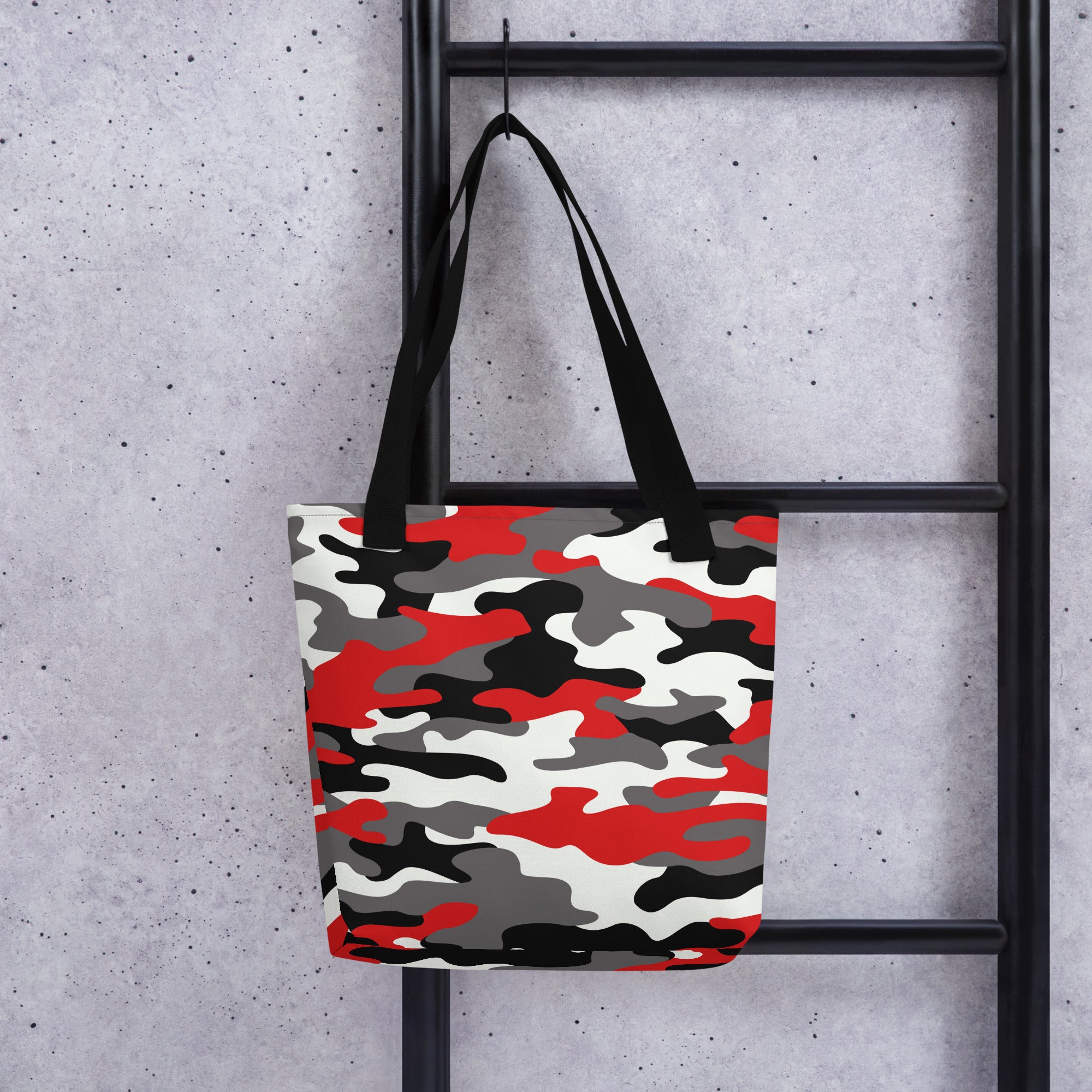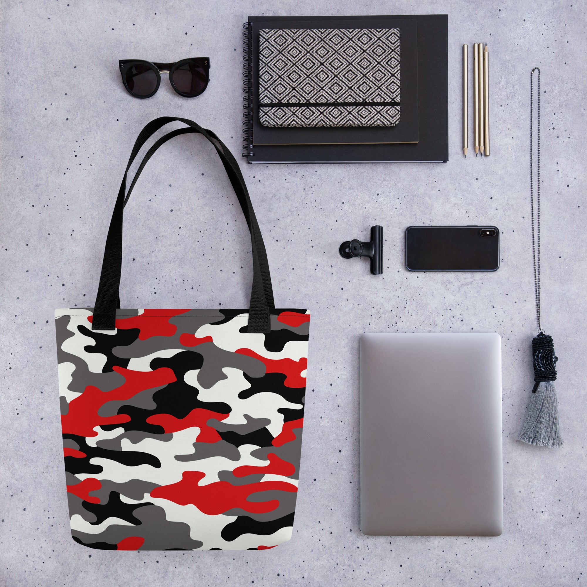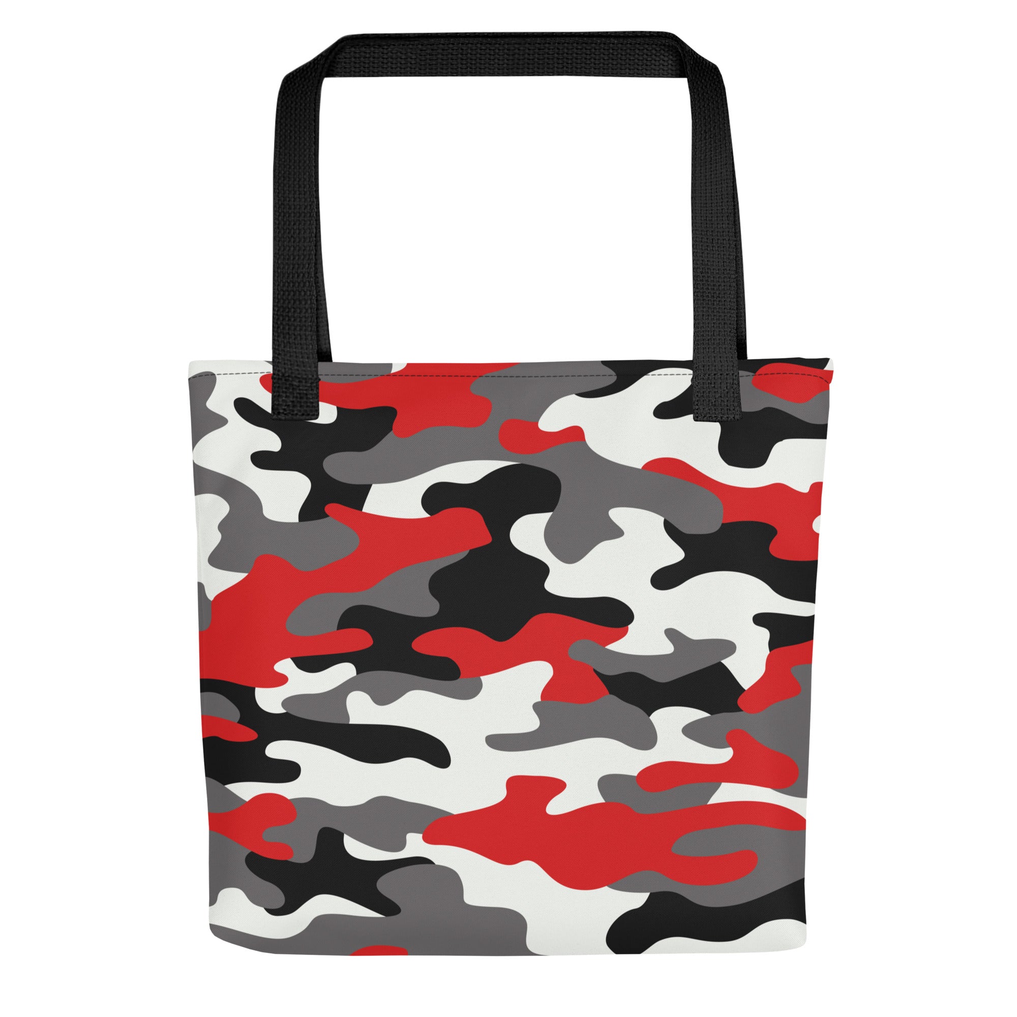 Our Camo Tote Bag features a stylish Red, Black & White Camouflage design, perfect for adding a touch of edgy style to any outfit. The durable material and spacious interior make it a versatile choice for everyday use. Stand out from the crowd with this trendy and functional tote.