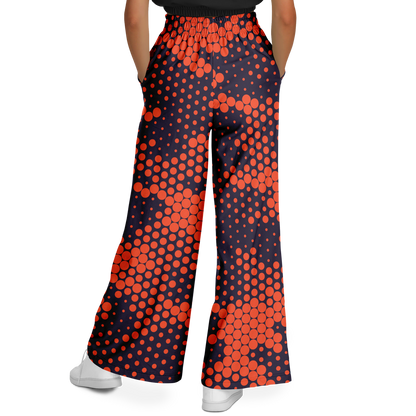 Stay on trend with these Camo Wide Leg Pants in the bold and eye-catching Orange & Blue Digital Camouflage design. Made with high-quality fabric, these pants provide both style and comfort. Perfect for adding a touch of edginess to your wardrobe.