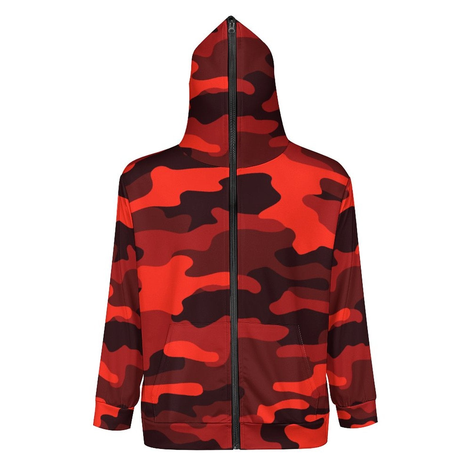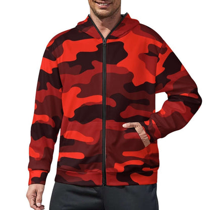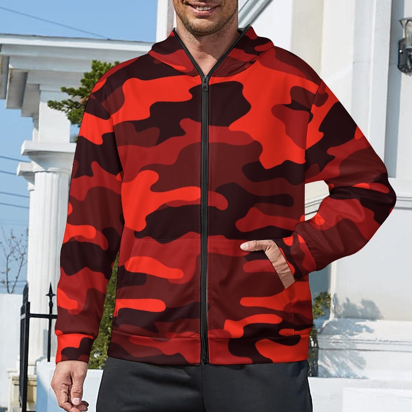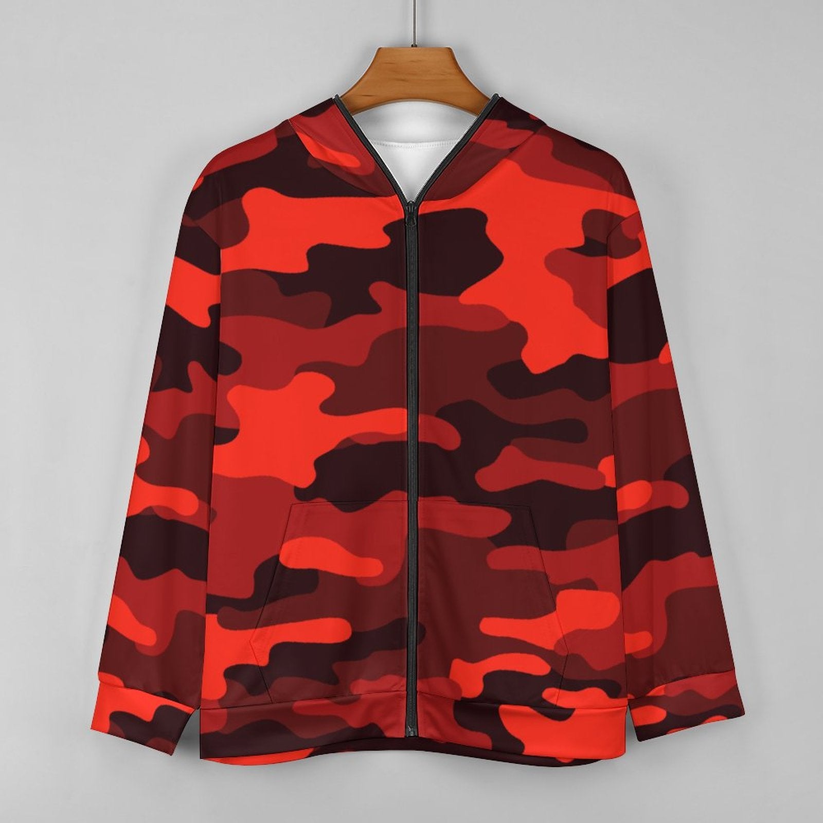 Stay warm and stylish with our Zip up Camo Hoodie in Scarlet Red & Black Camouflage. Featuring a convenient zip up design and trendy camouflage print, this hoodie will keep you comfortable in any weather. Perfect for outdoor activities or just lounging, grab one now!