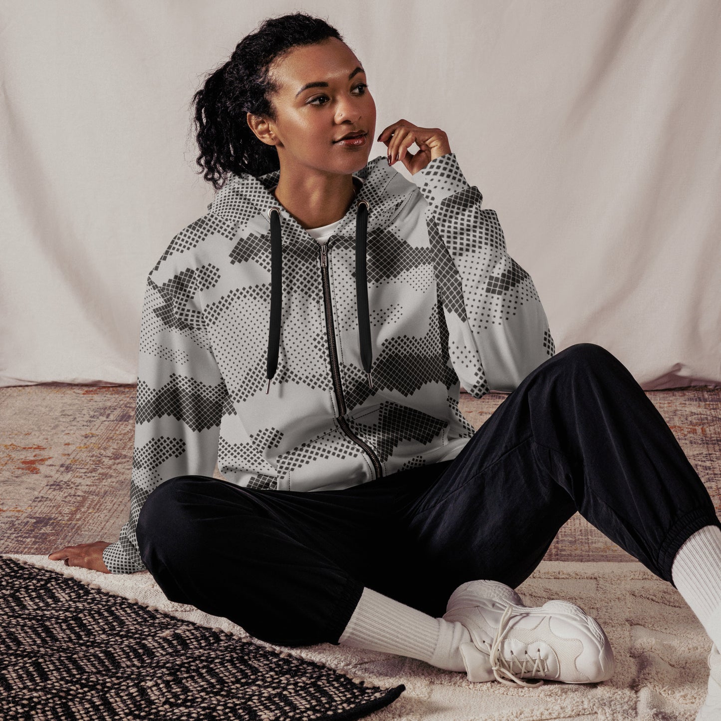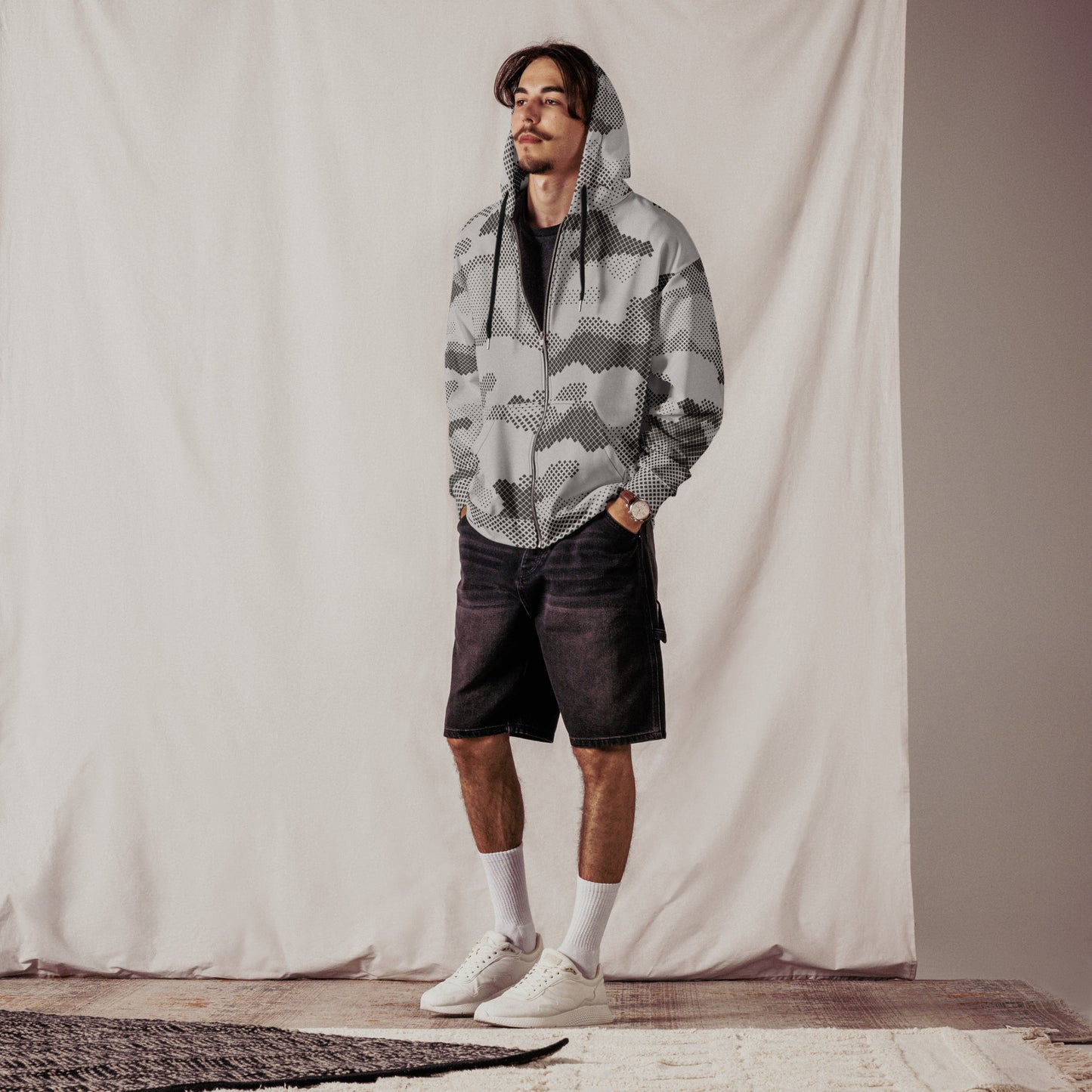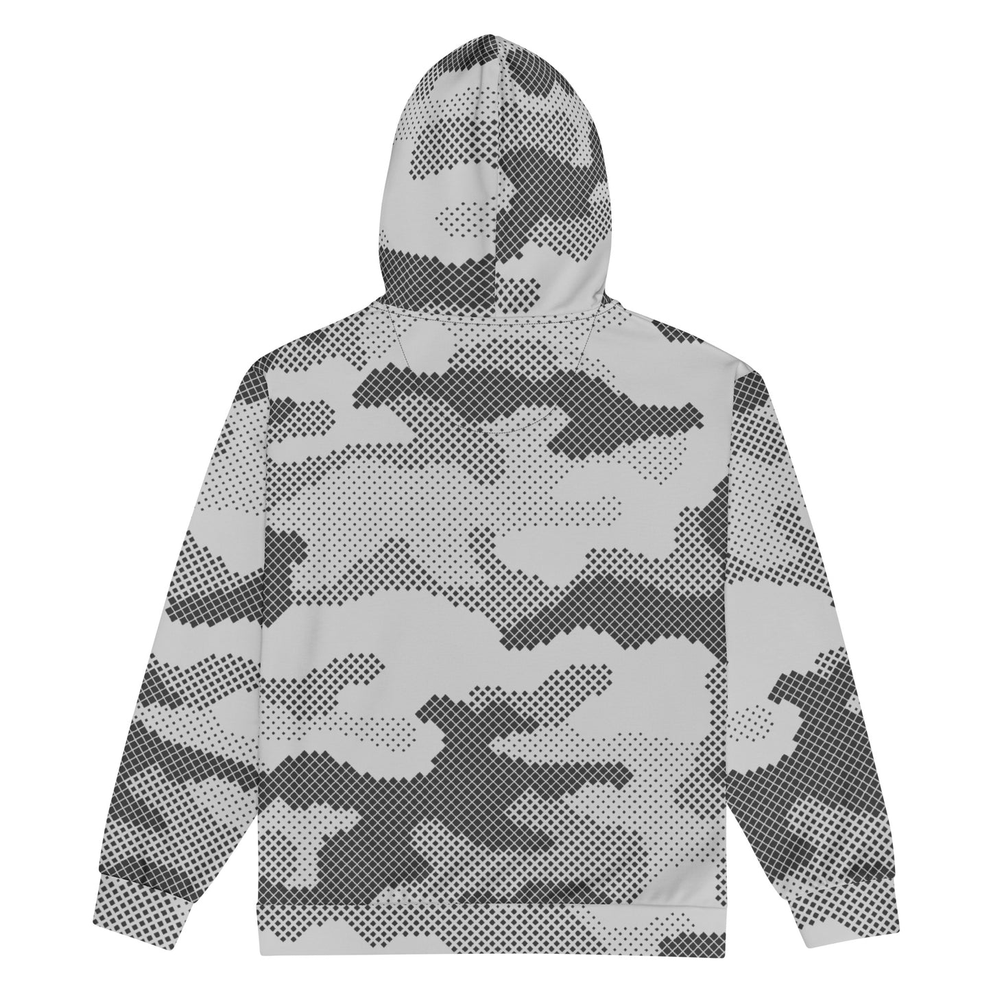 Stay comfortable and blend into your surroundings with our Camo Zip Hoodie. The grey digital street camo pattern offers a sleek and modern look, while the zippered front adds convenience. Perfect for outdoor activities or casual wear.