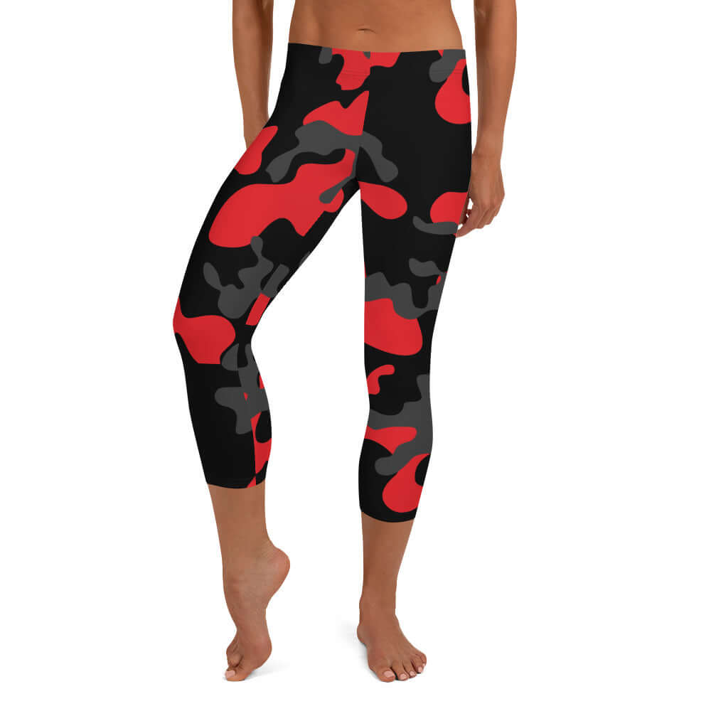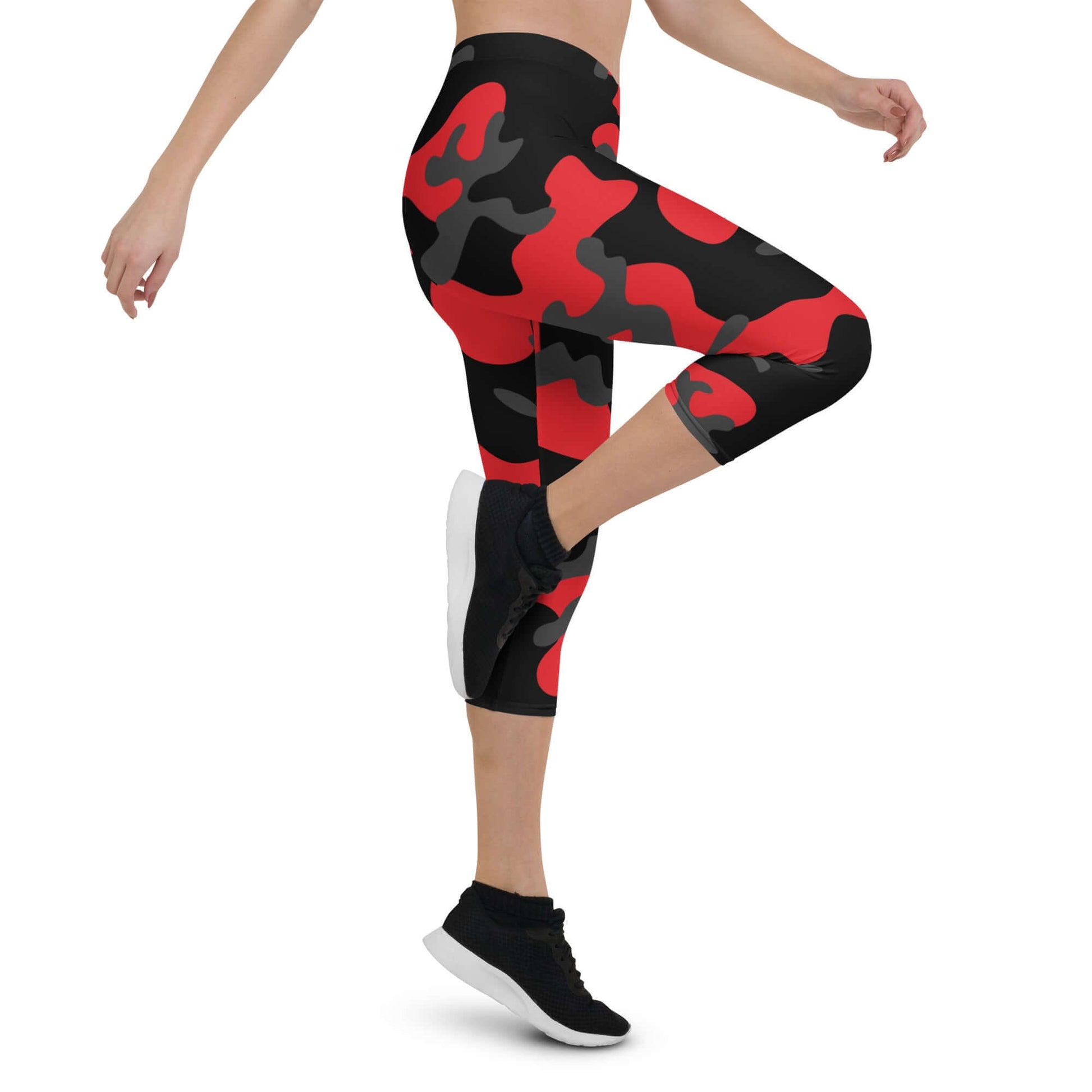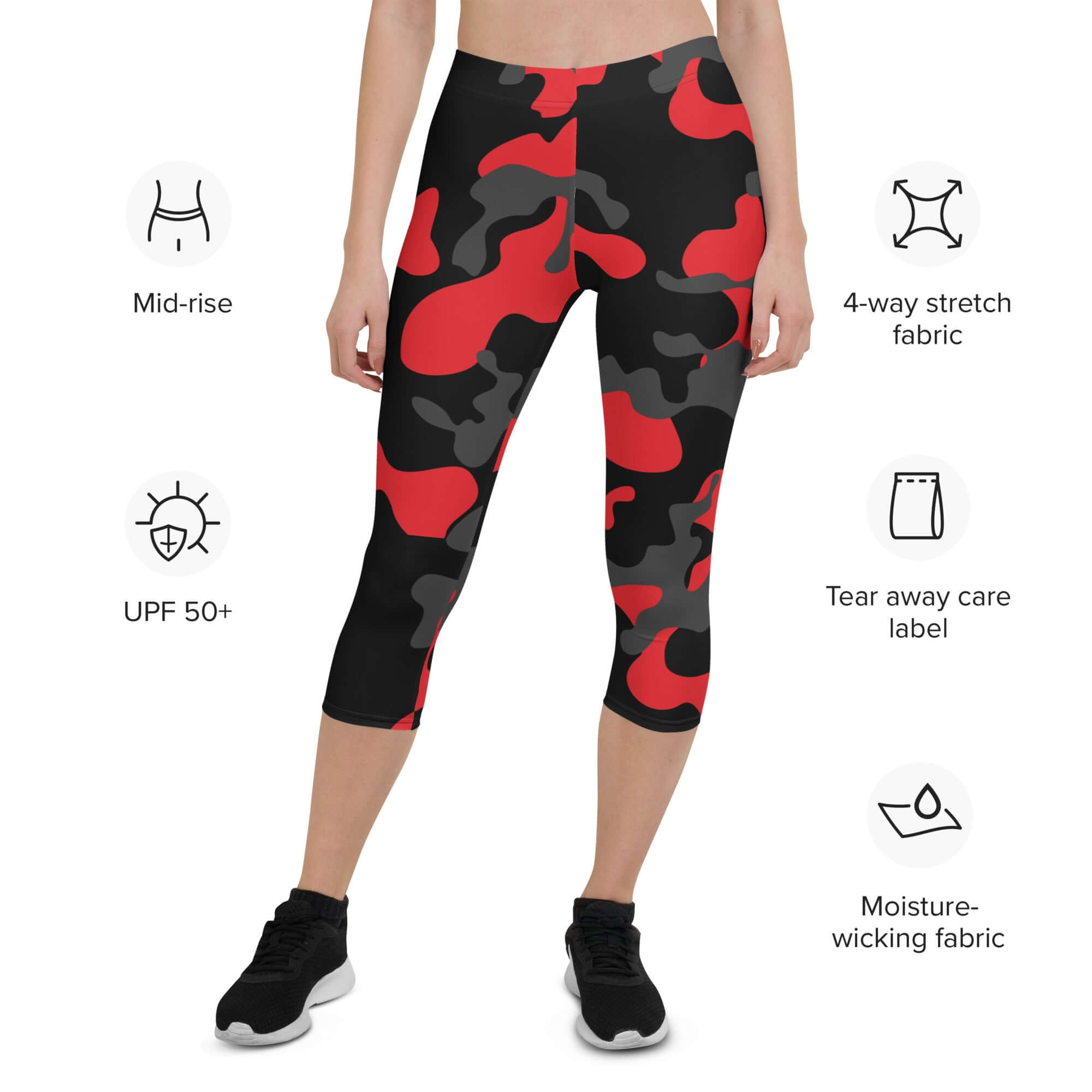 These Capri Leggings in Army Style Red & Black Camouflage are perfect for adding a unique touch to your workout or everyday wardrobe. Made with high-quality materials and a comfortable fit, these leggings provide both style and functionality. Upgrade your look with a touch of boldness and stand out from the crowd.