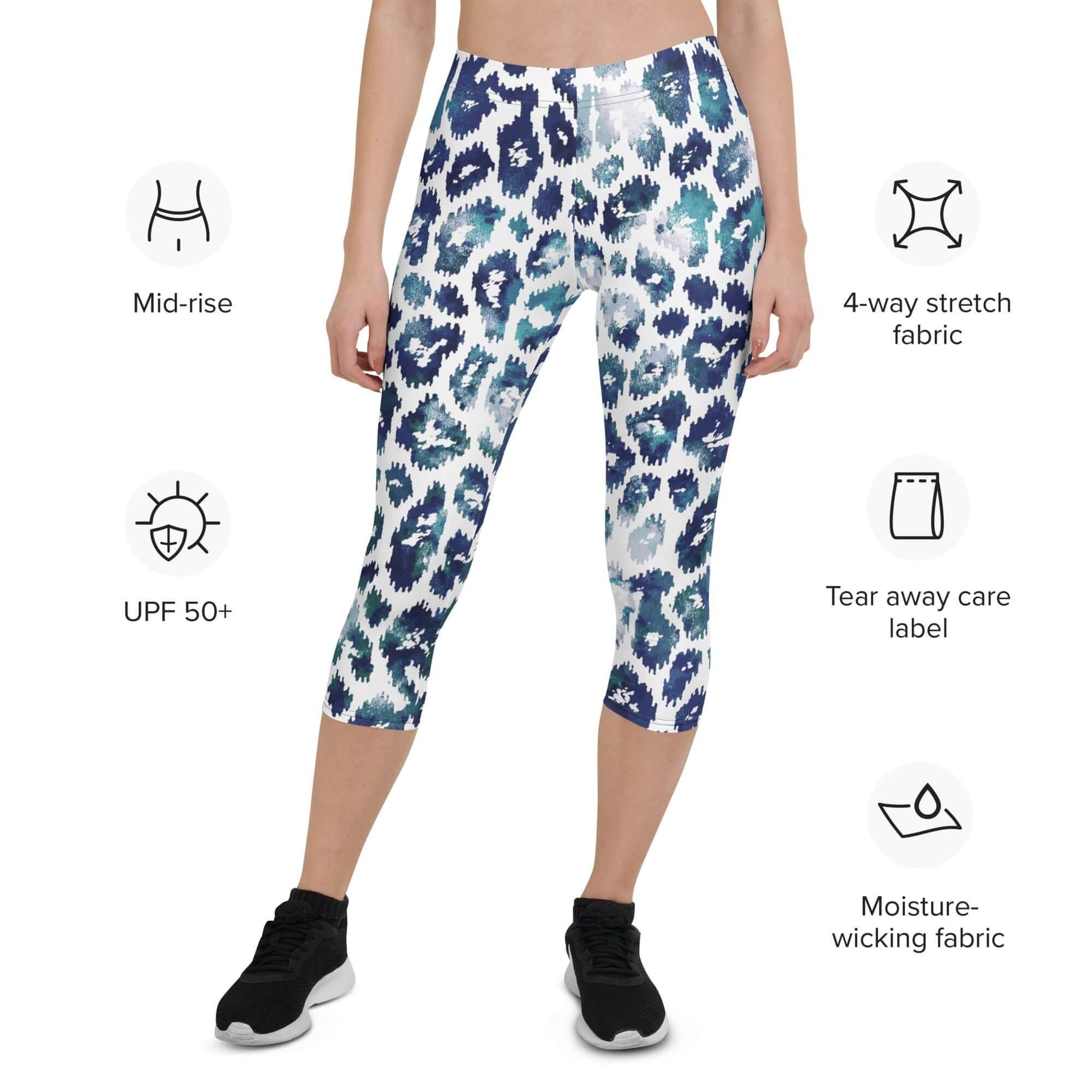Expertly designed and crafted, these Capri Leggings in Blue and White Leopard Print offer both style and comfort. The eye-catching print adds a touch of personality while the high-quality fabric provides a flattering fit and superior durability. Perfect for the fashion-forward individual who values both fashion and function.