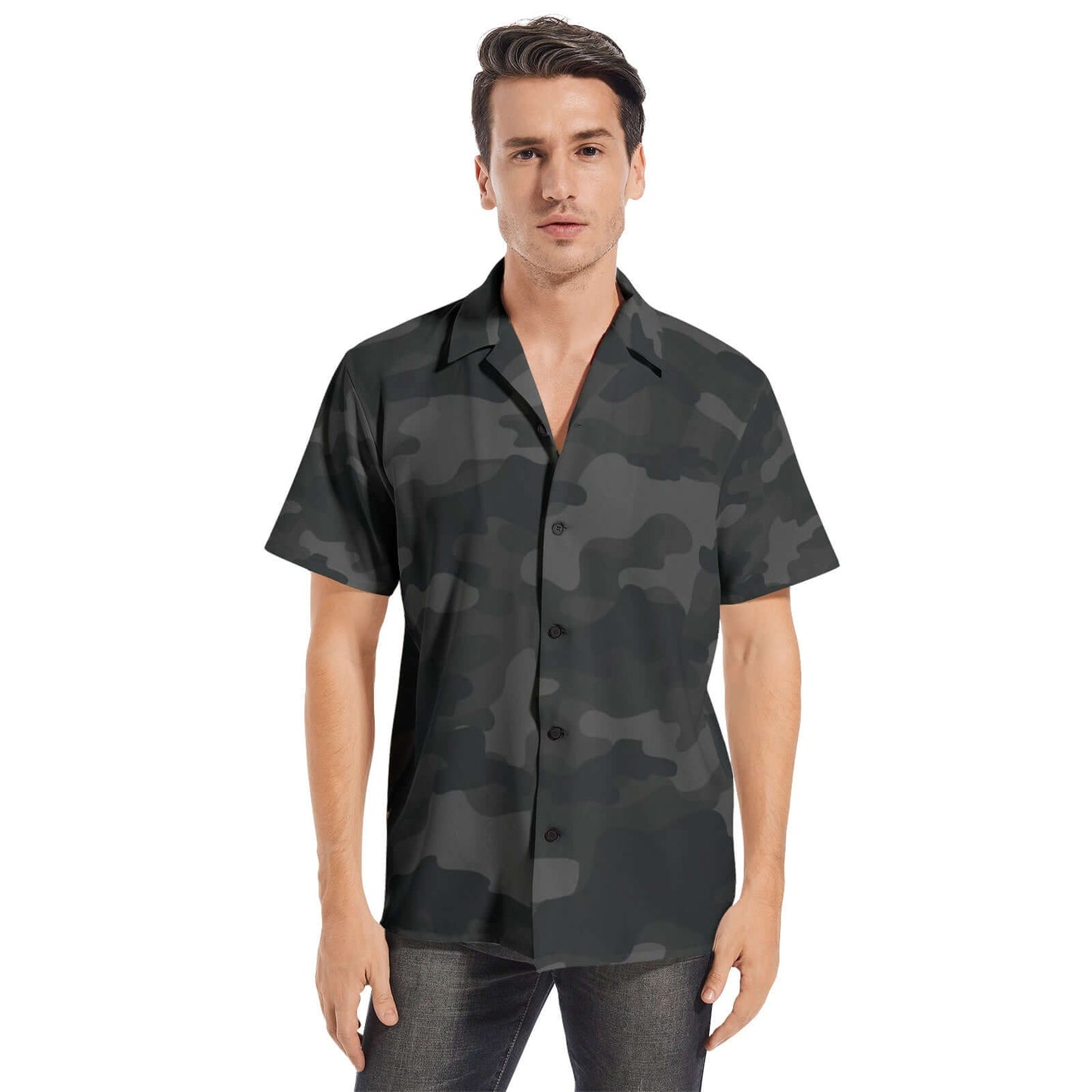Expertly crafted from 100% soft cotton, our Black Short-Sleeve Camo Shirt for Men offers both comfort and style. The classic camo print adds an edgy touch to any outfit, while the breathable fabric keeps you cool and comfortable all day long. Upgrade your wardrobe with this versatile and trendy shirt.