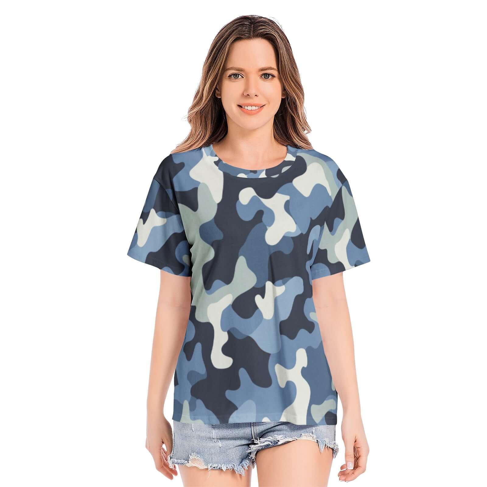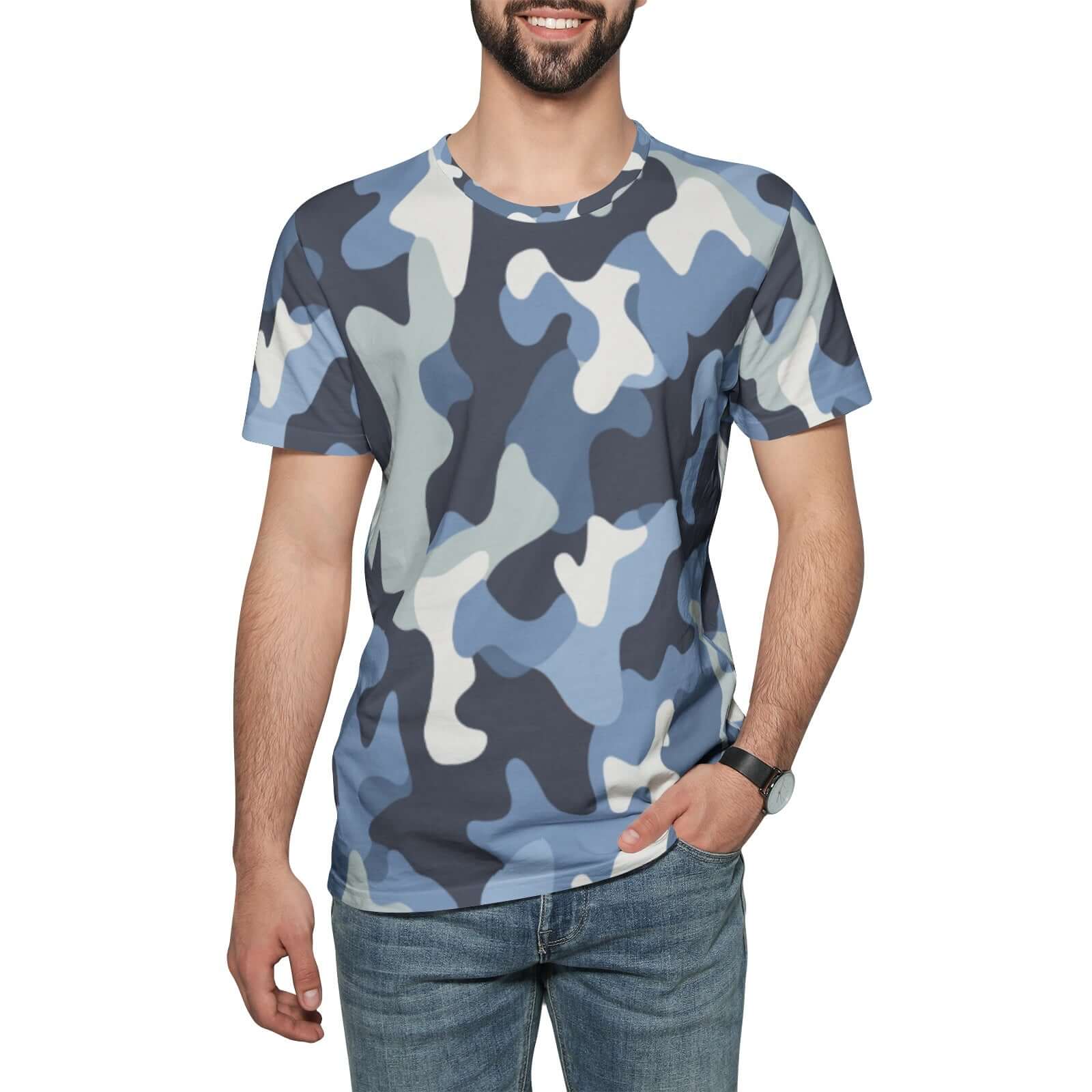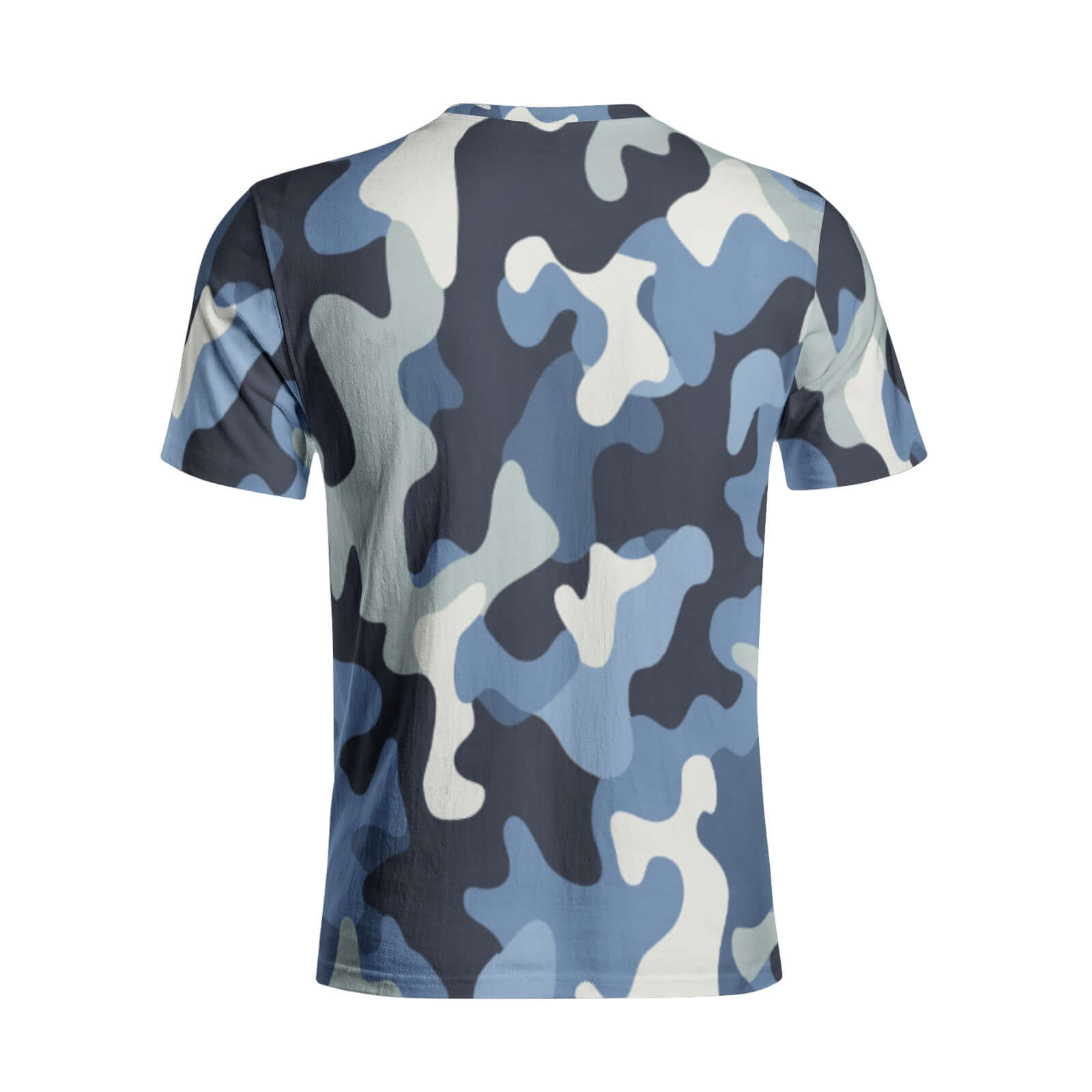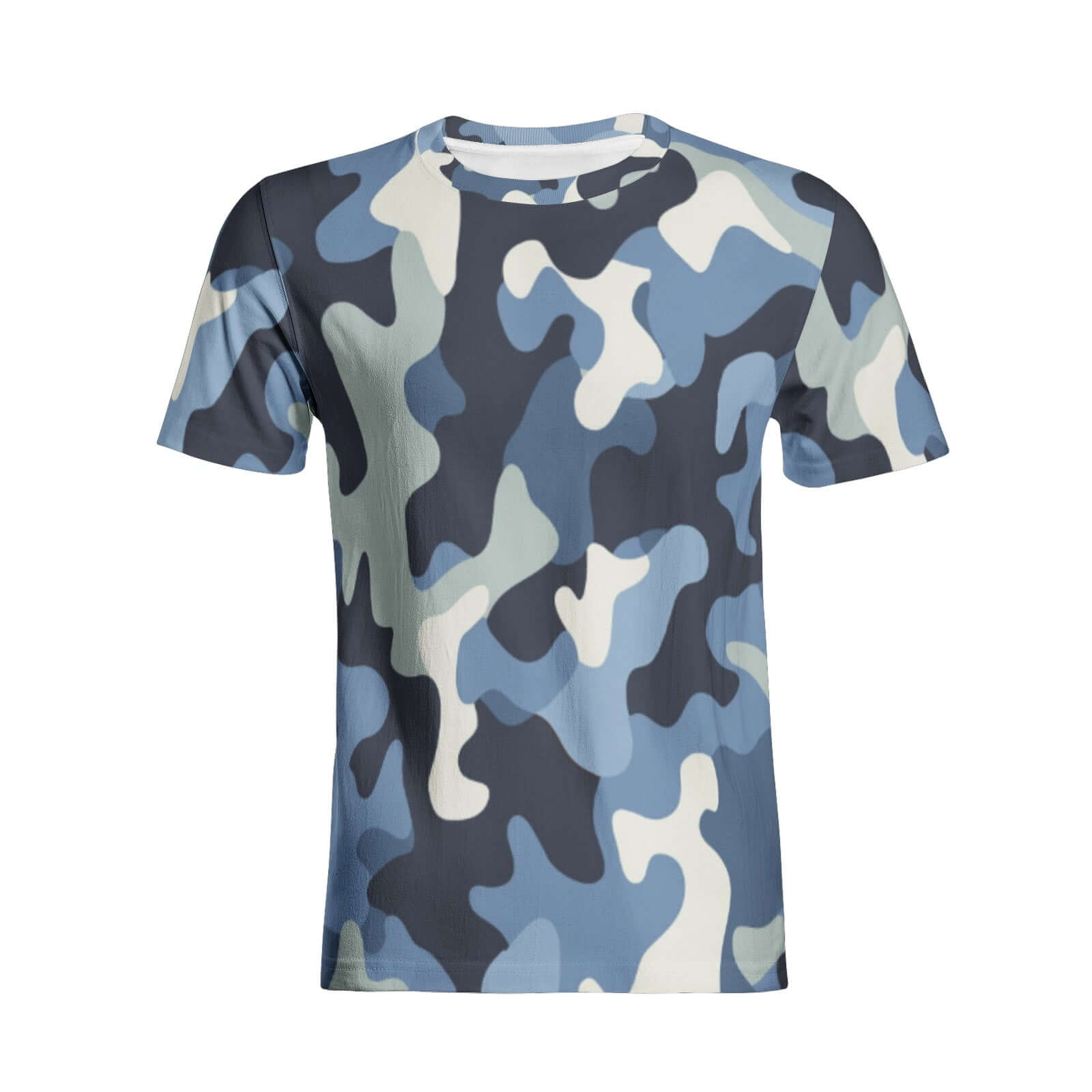 Expertly crafted from 100% ring spun cotton, this Blue and White Camouflage T-shirt offers unbeatable comfort and durability. Its double-needle sleeve and bottom hems ensure long-lasting wear, while Shaped support wrap strips provide a comfortable fit for your body. Stand out in style with this high-quality camo tee.