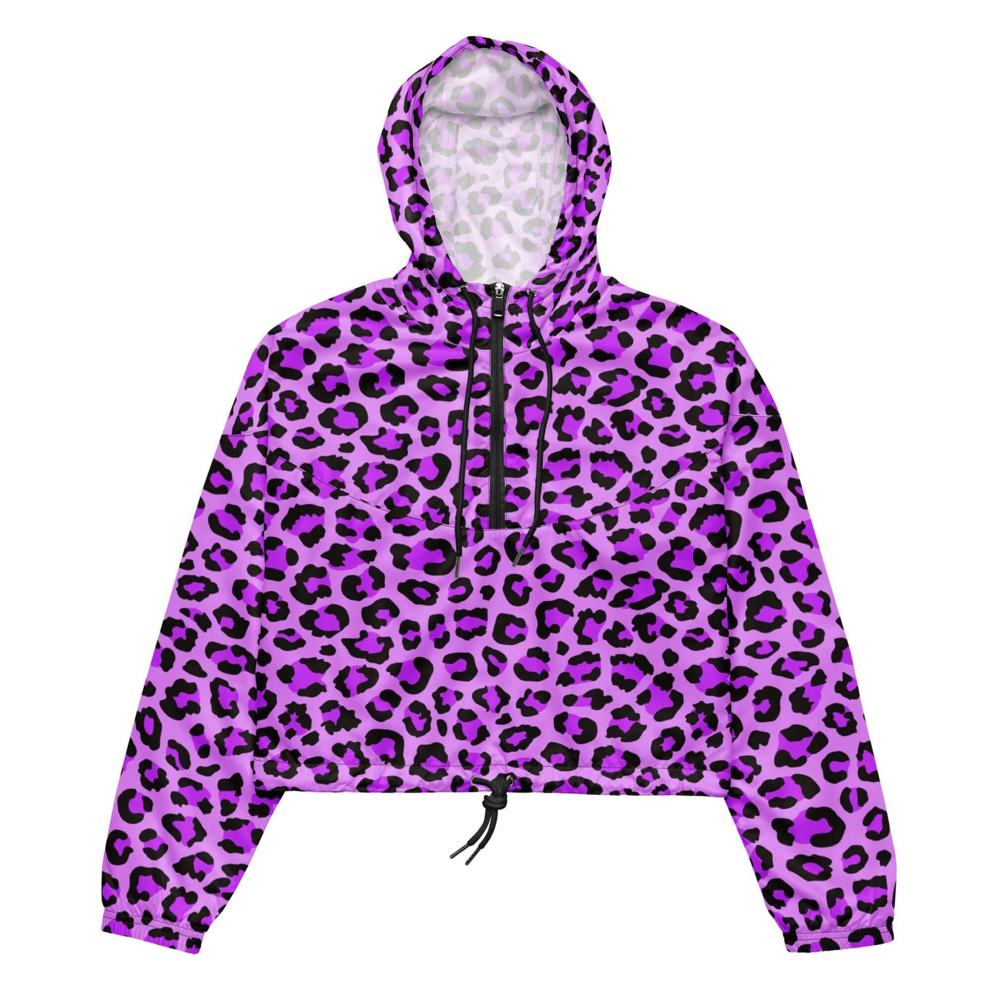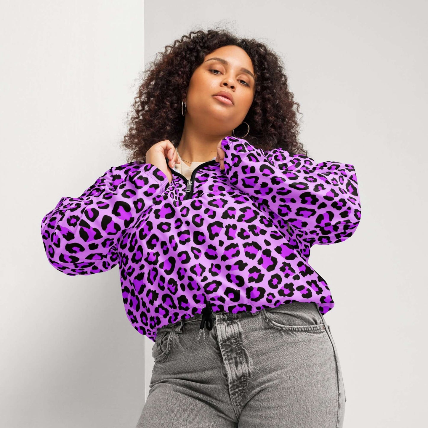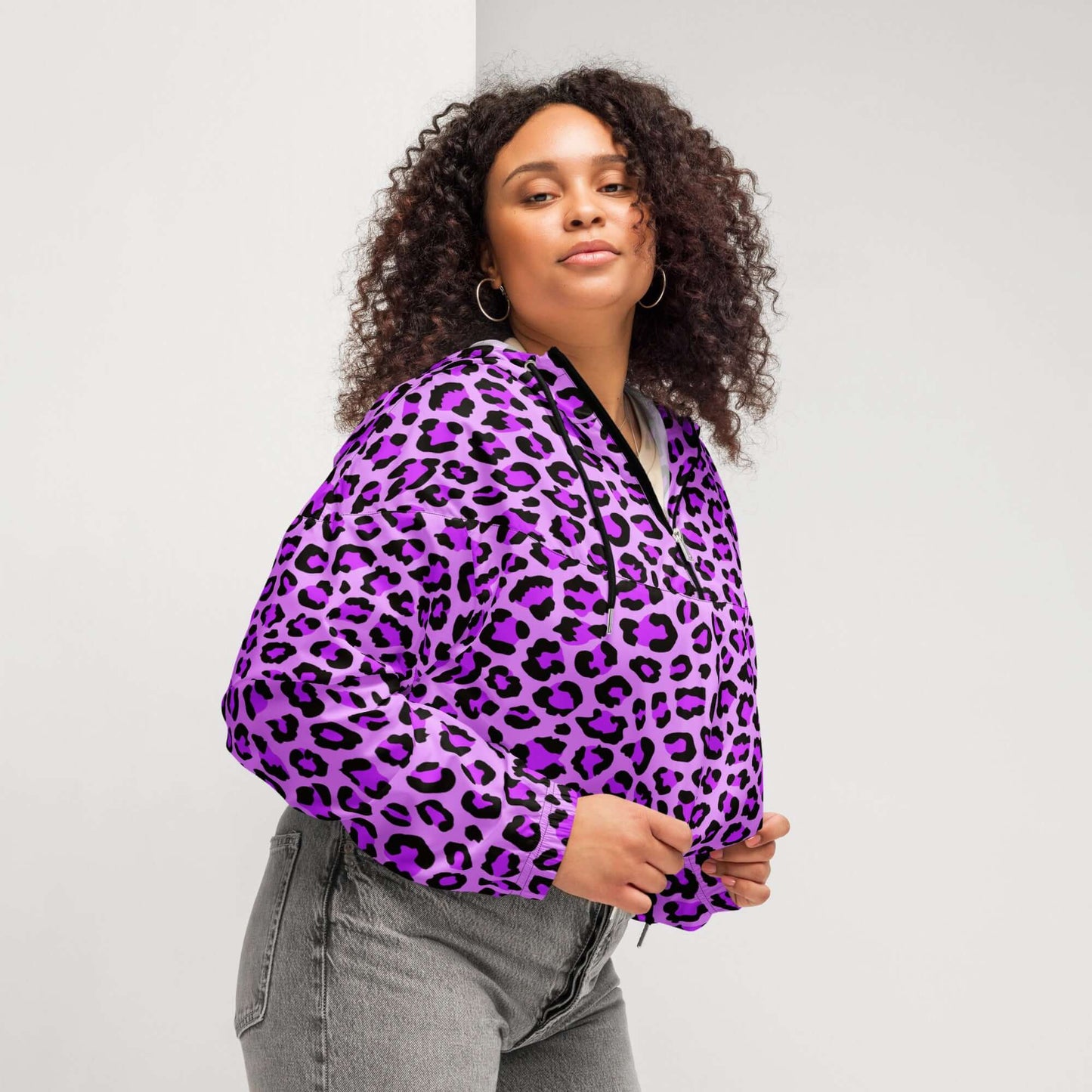 This Women's Windbreaker combines style and function with its vibrant purple, blue, and black leopard print. Lightweight and water-resistant, it's perfect for any outdoor activity. Made with high-quality materials, this windbreaker will keep you dry and comfortable. Stay on trend while staying protected from the elements with this must-have piece.