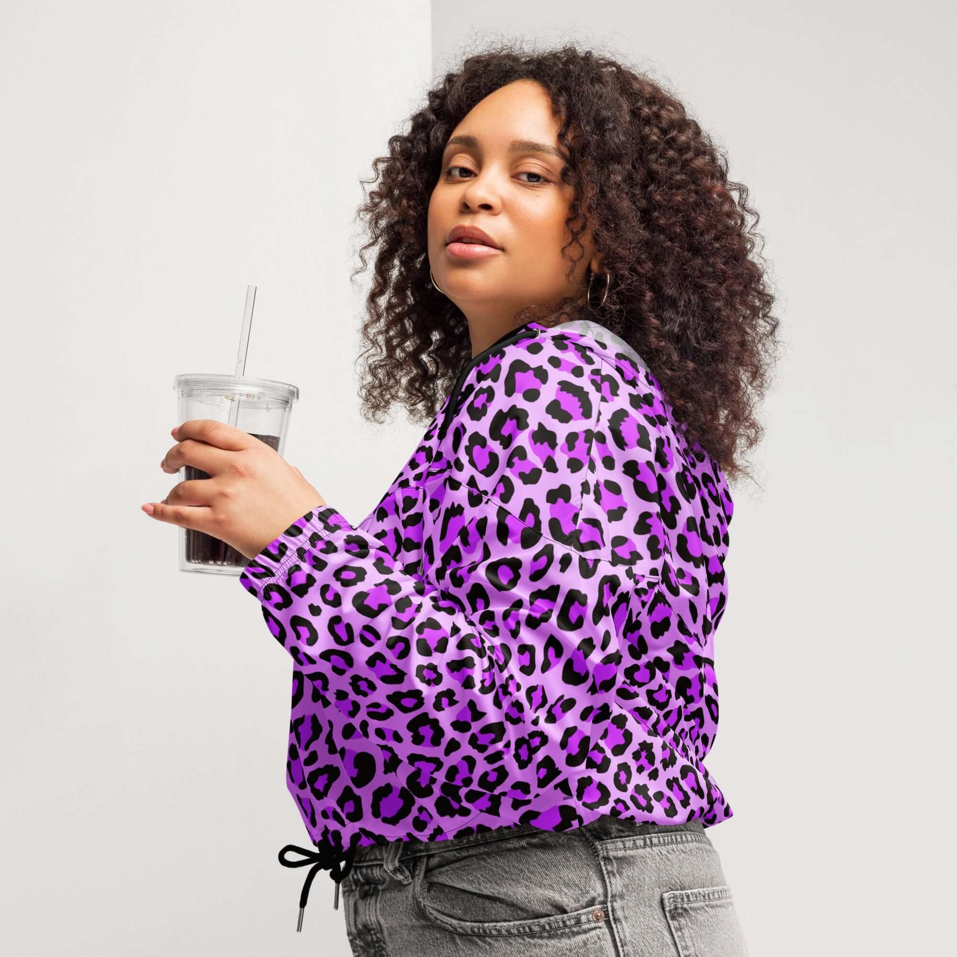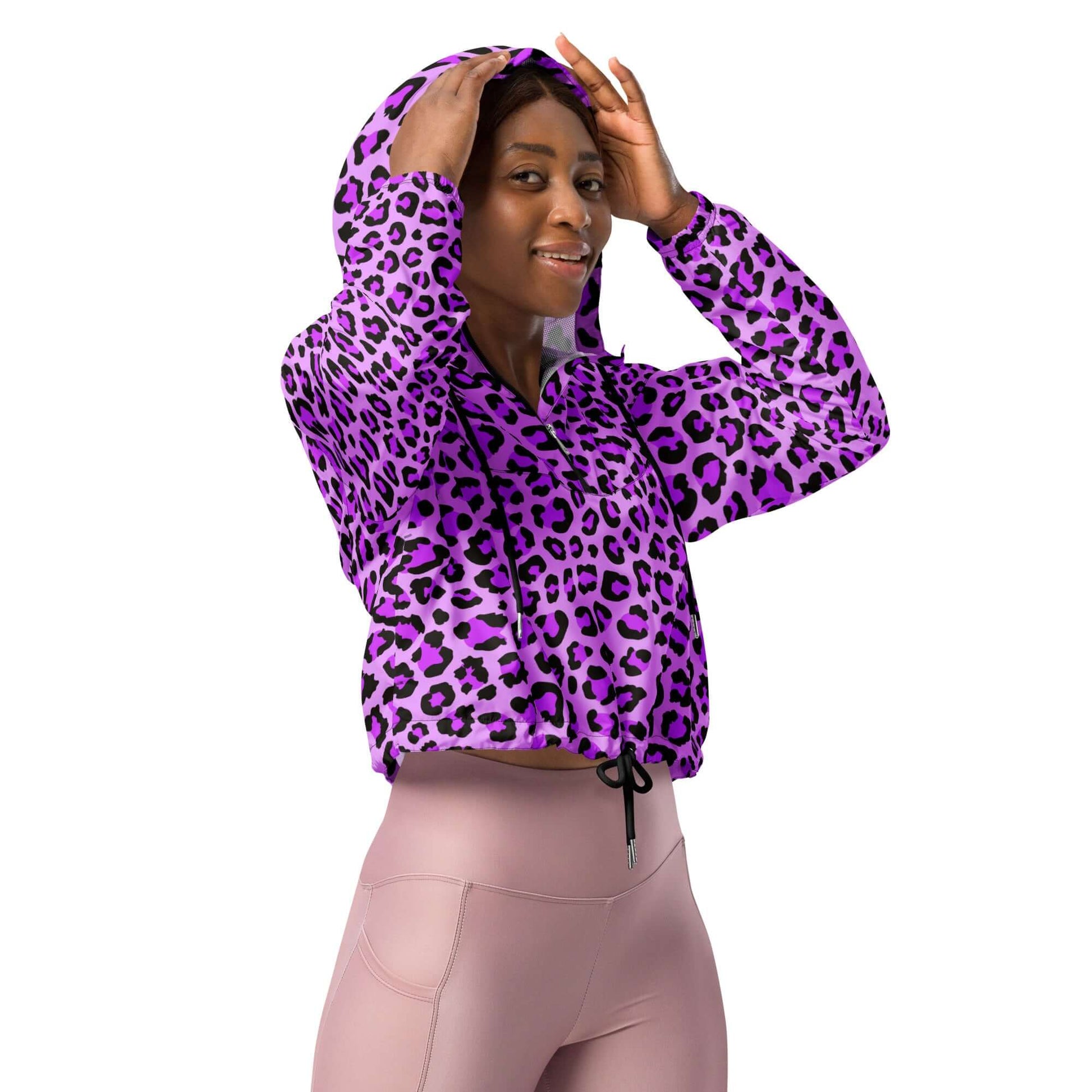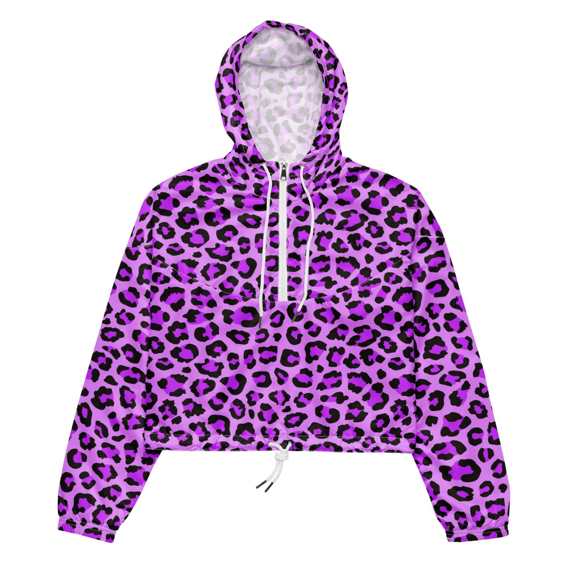 This Women's Windbreaker combines style and function with its vibrant purple, blue, and black leopard print. Lightweight and water-resistant, it's perfect for any outdoor activity. Made with high-quality materials, this windbreaker will keep you dry and comfortable. Stay on trend while staying protected from the elements with this must-have piece.
