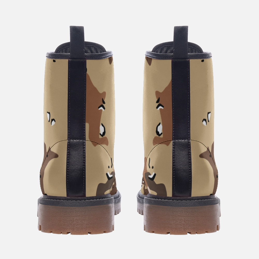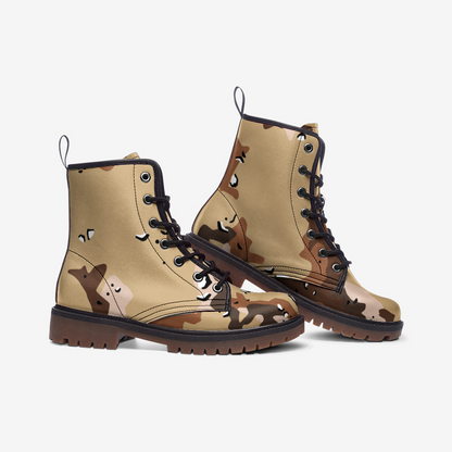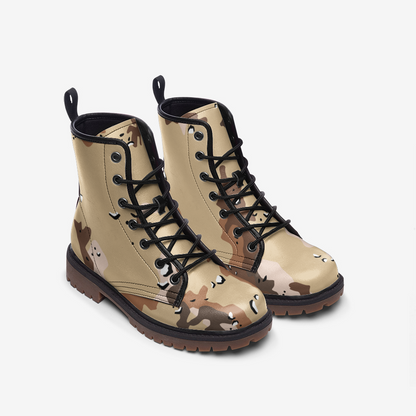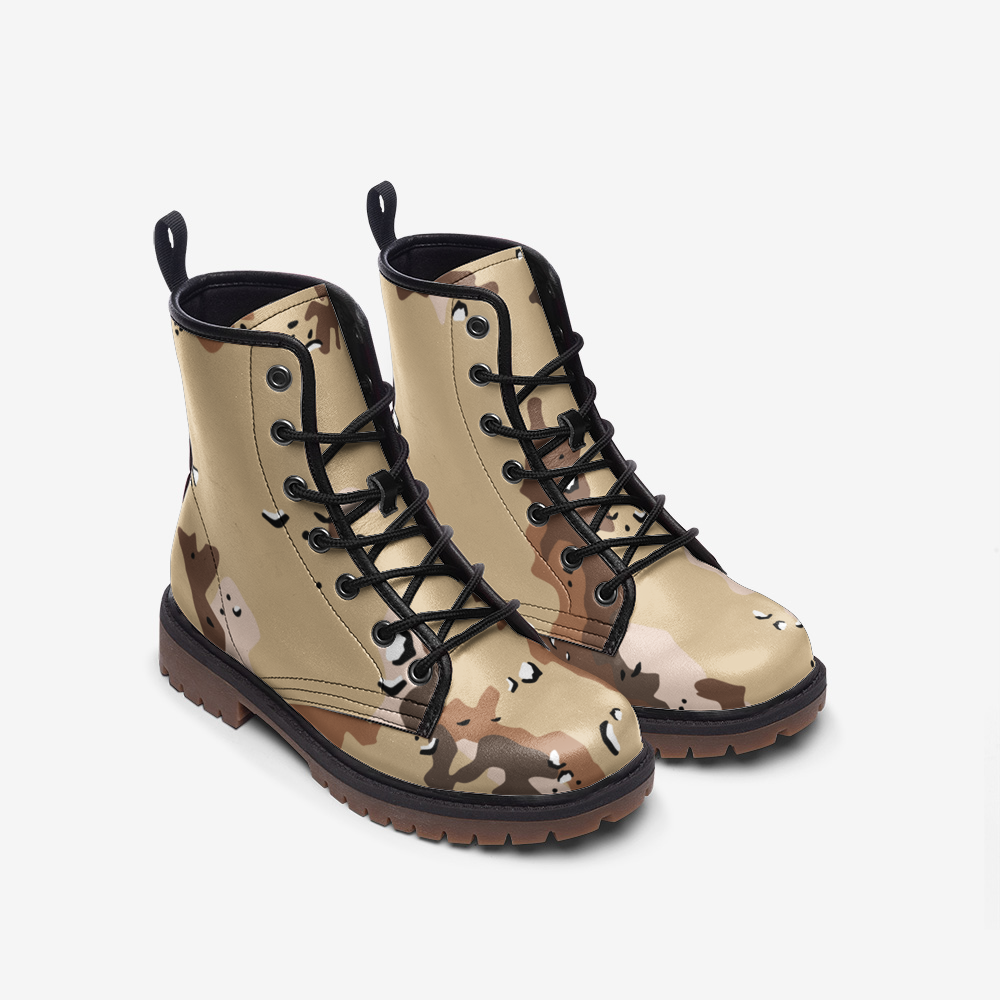 These Desert Brown Camo Boots are designed with a lightweight leather material perfect for long excursions. The camo pattern blends seamlessly into desert environments, making it ideal for military use. With a Marines Uniform design, these boots provide both comfort and functionality for any outdoor mission or adventure.
