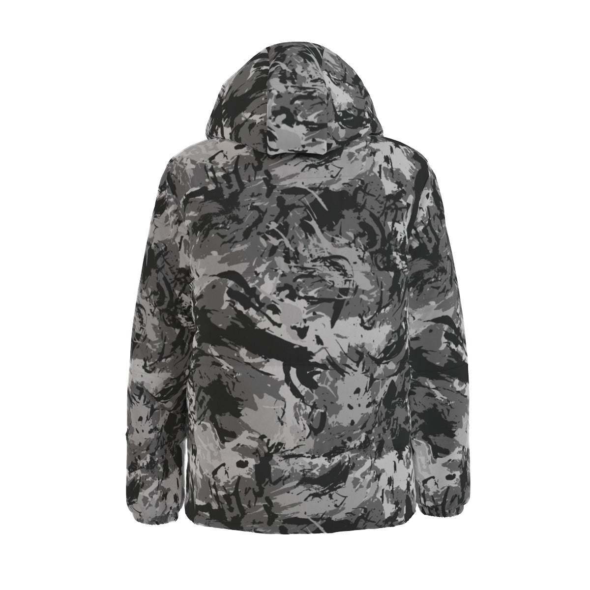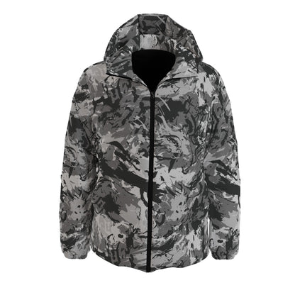Stay warm and stylish with our Down Jacket in Urban Camo design. Featuring a unique Grunge Brush pattern in Gray & Black, this hooded jacket is perfect for any fashion-forward individual. With a cozy down filling, you'll be protected from the cold while making a statement.