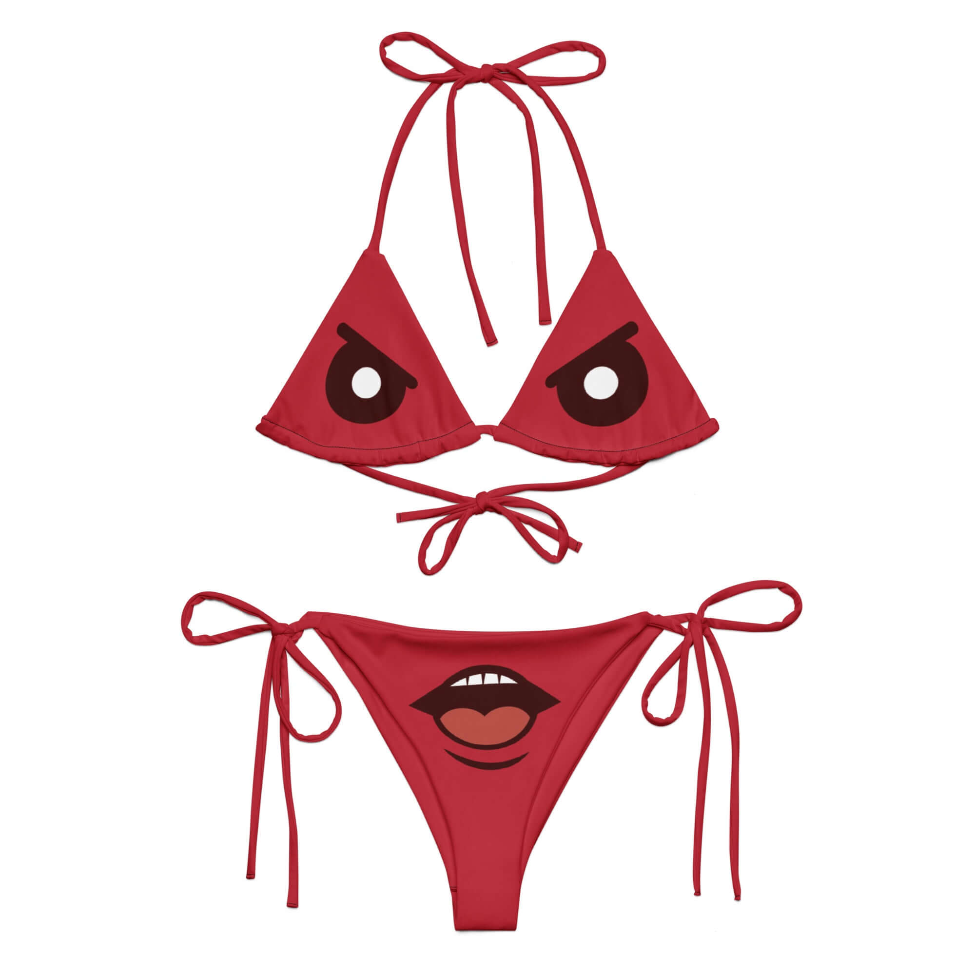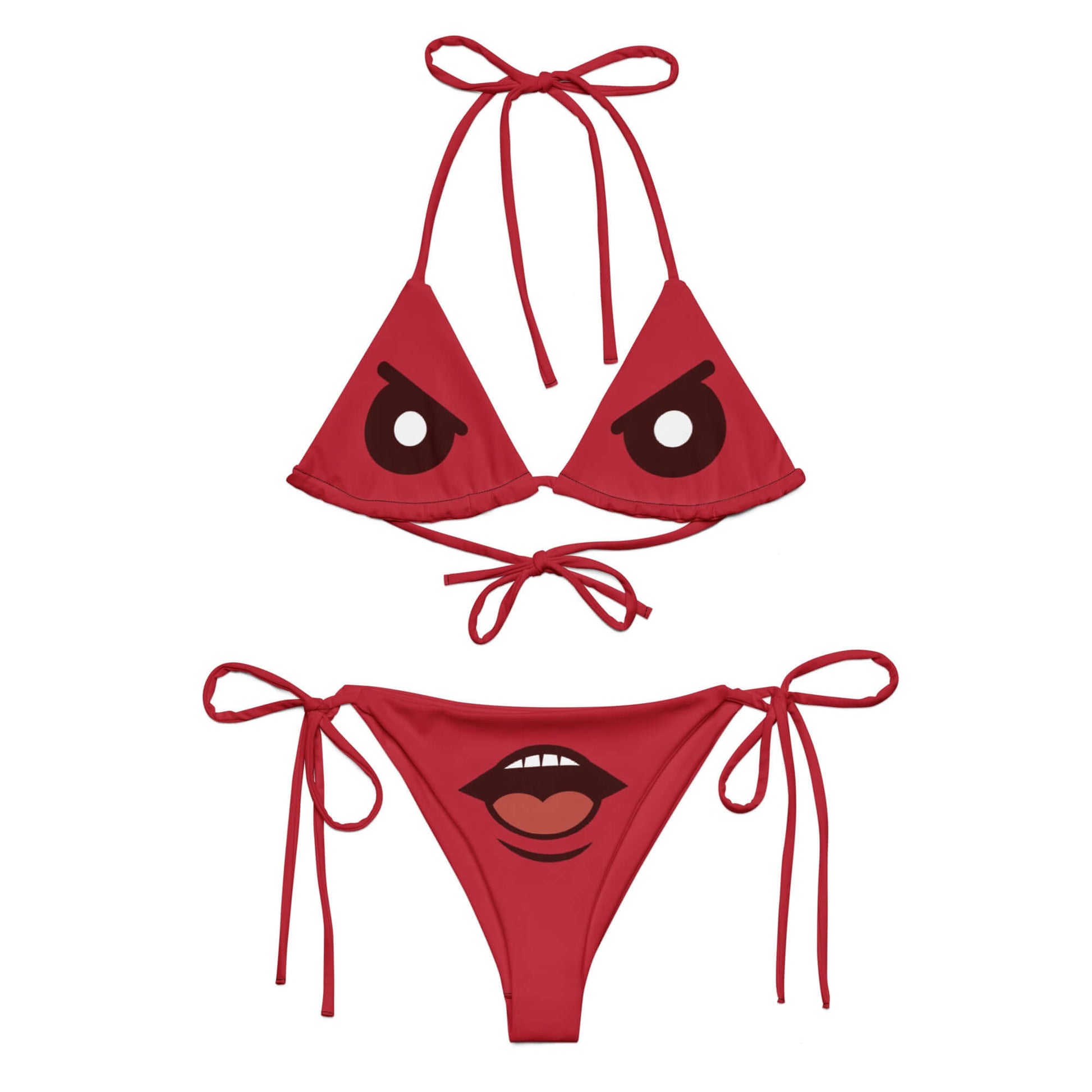 Unleash your inner diva with the Fierce Mood Monster Bikini, a fiery red two-piece that’s all sass and zero apologies. Featuring a bold monster face with angry eyes on the top and a cheeky open-mouth graphic on the bottom, this limited-edition set makes waves—literally and figuratively. Crafted from eco-friendly recycled materials, this bikini ties at the neck, back, and hips for a custom, flattering fit. Whether you're lounging poolside or strutting the boardwalk, this piece brings serious attitude to your summer style.