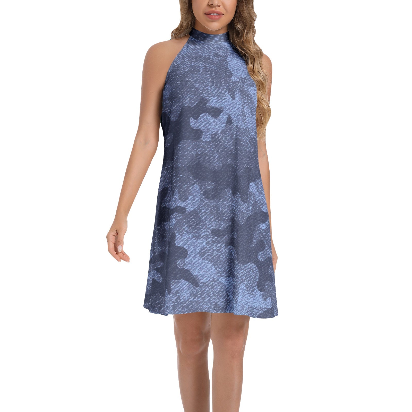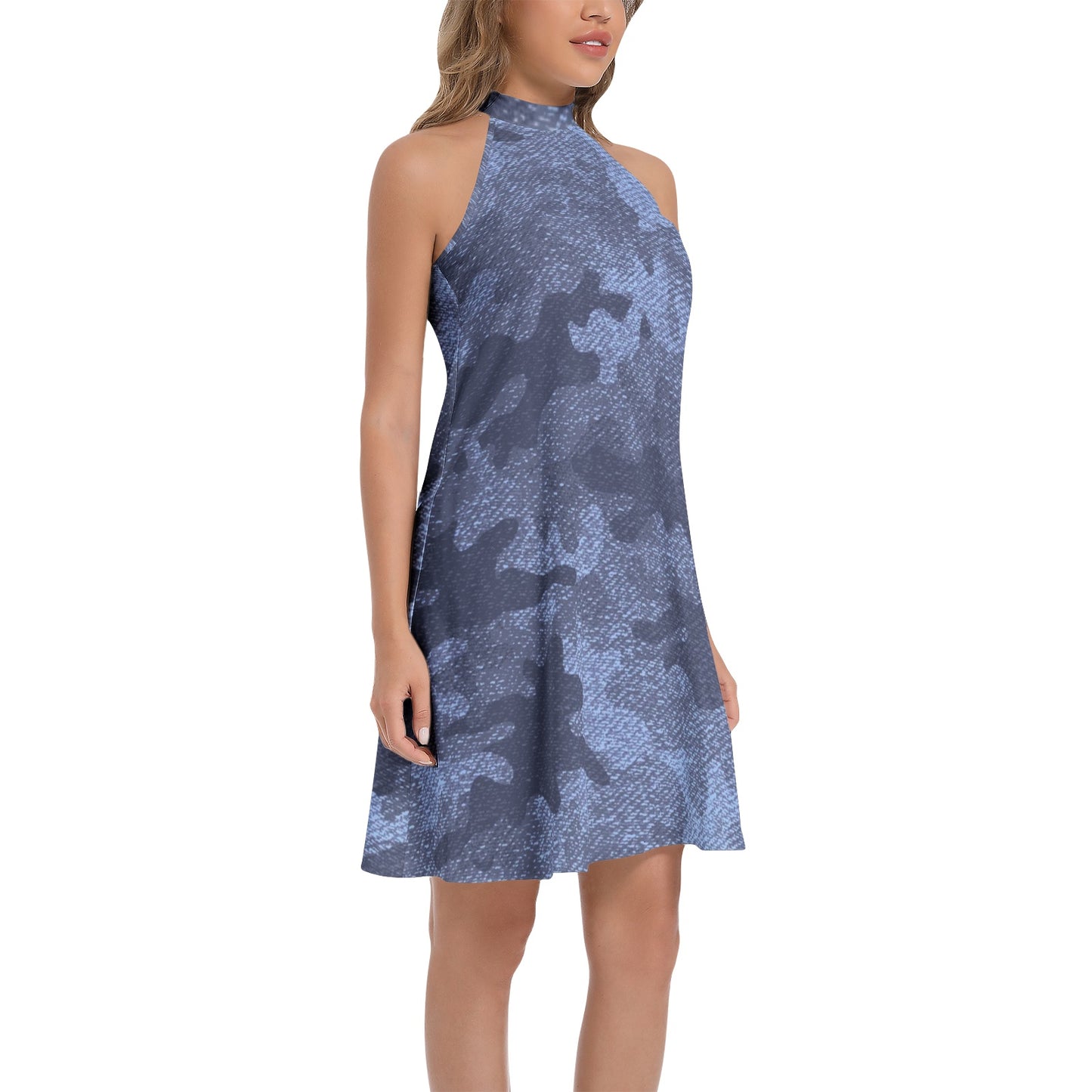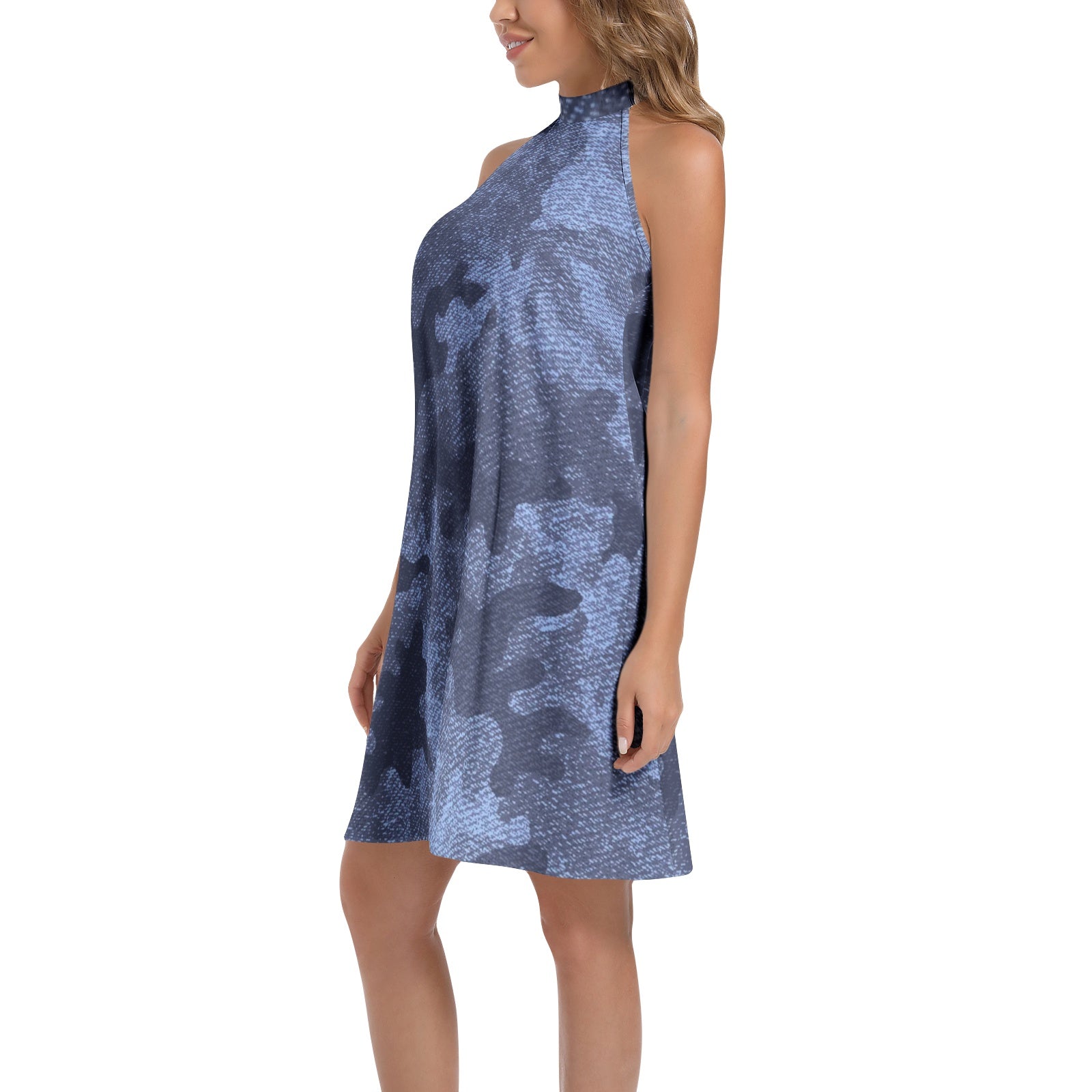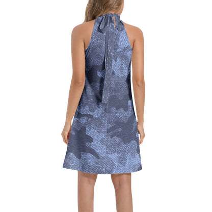 Flared Camo Dress | Halter Neck | Denim Blue Camouflage