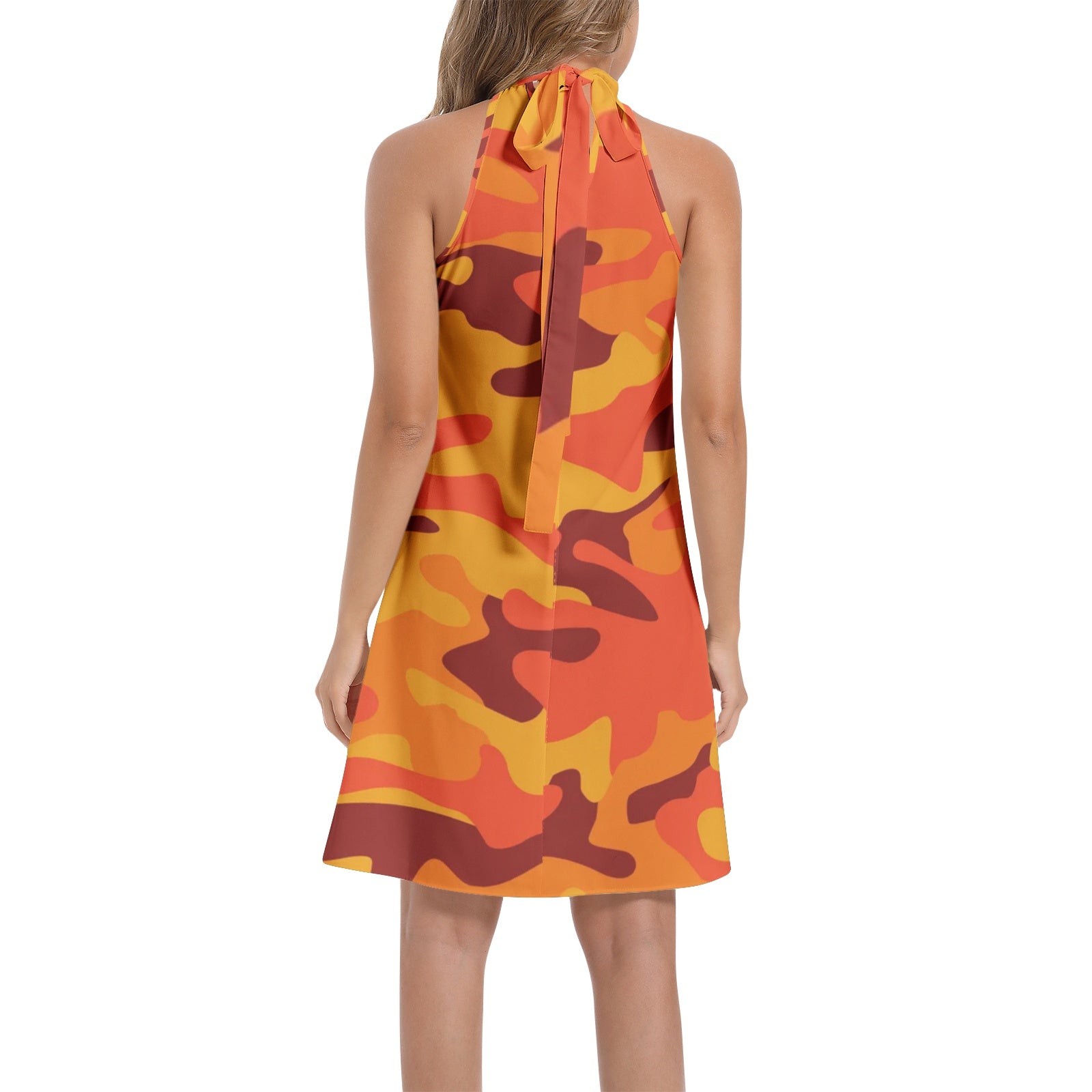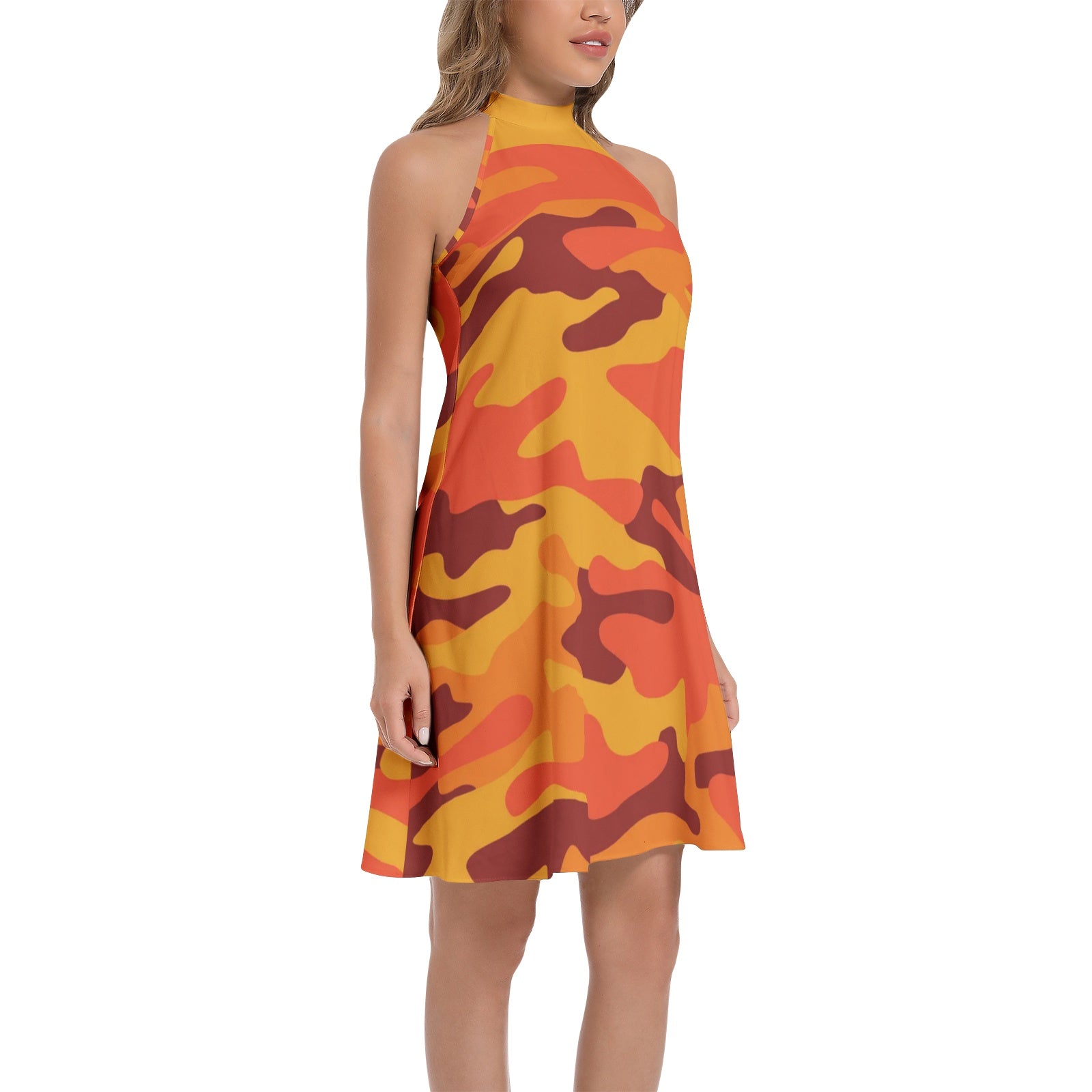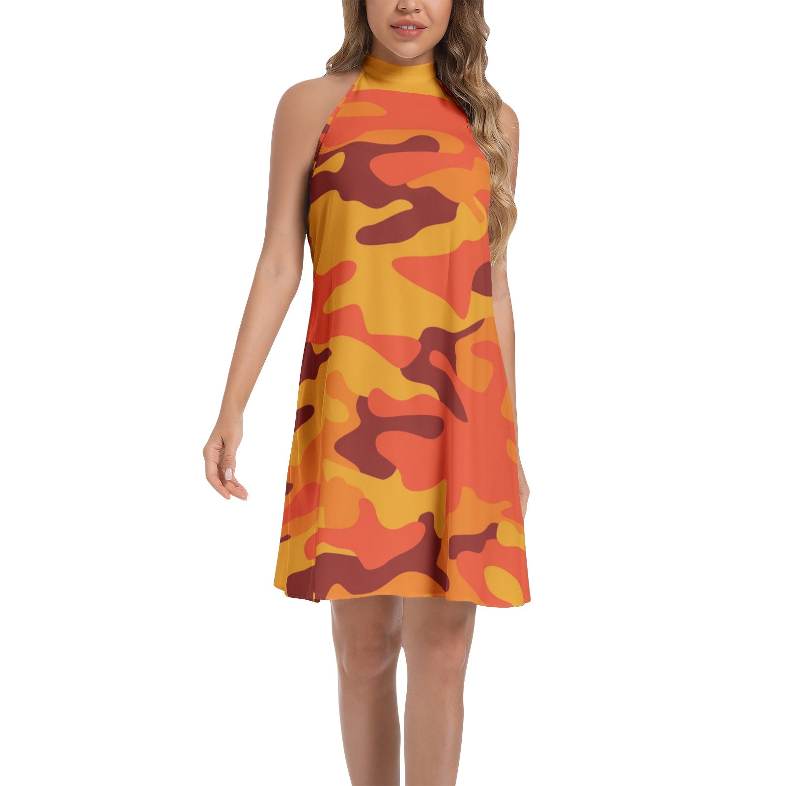 Elevate your style with our Flared Camo Dress. Featuring a halter neck and bold orange and red camouflage design, this dress adds a touch of edginess to your wardrobe. Made with quality material, it offers comfort and style all in one. Perfect for any occasion, stand out and make a statement with this versatile dress.