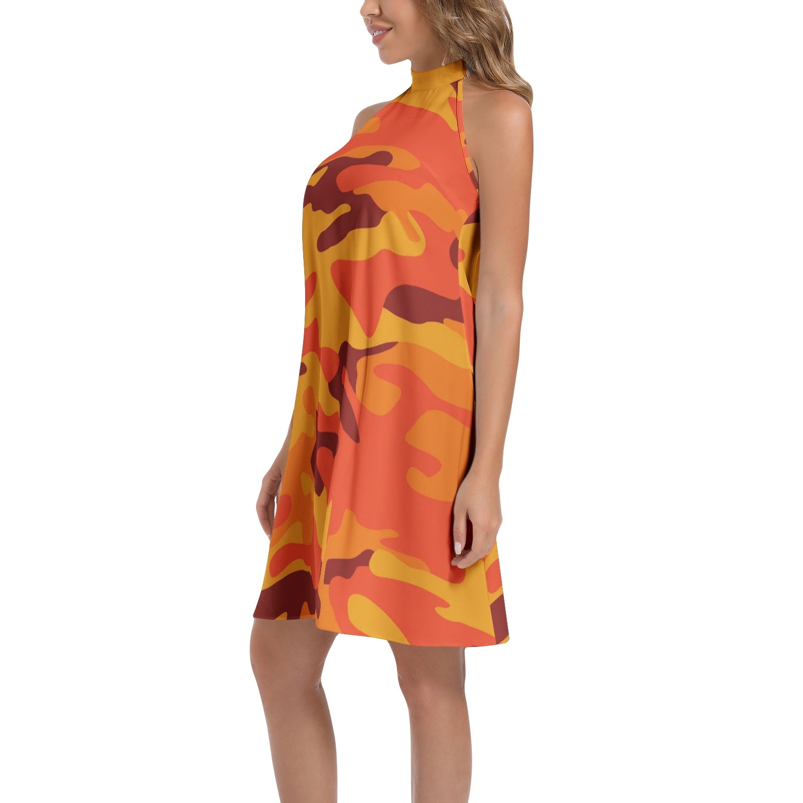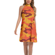 Flared Camo Dress | Halter Neck | Orange and Red Camouflage