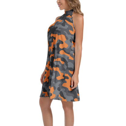 Flared Camo Dress | Halter Neck | Orange, Black, and Gray