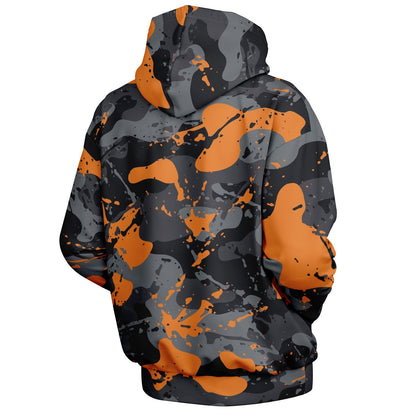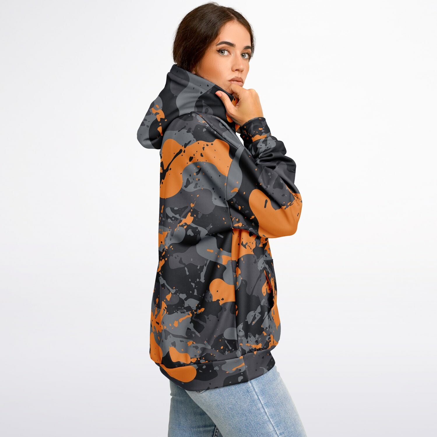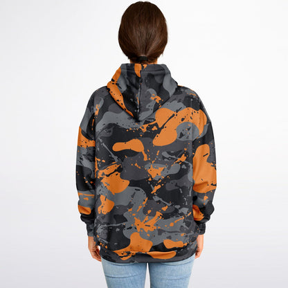 Elevate your streetwear with this Grunge Camouflage oversized hoodie, featuring a modern black and gray camouflage base splashed with vivid orange accents. The paint-splatter effect adds an artistic touch, making this a statement piece for any casual or urban outfit.