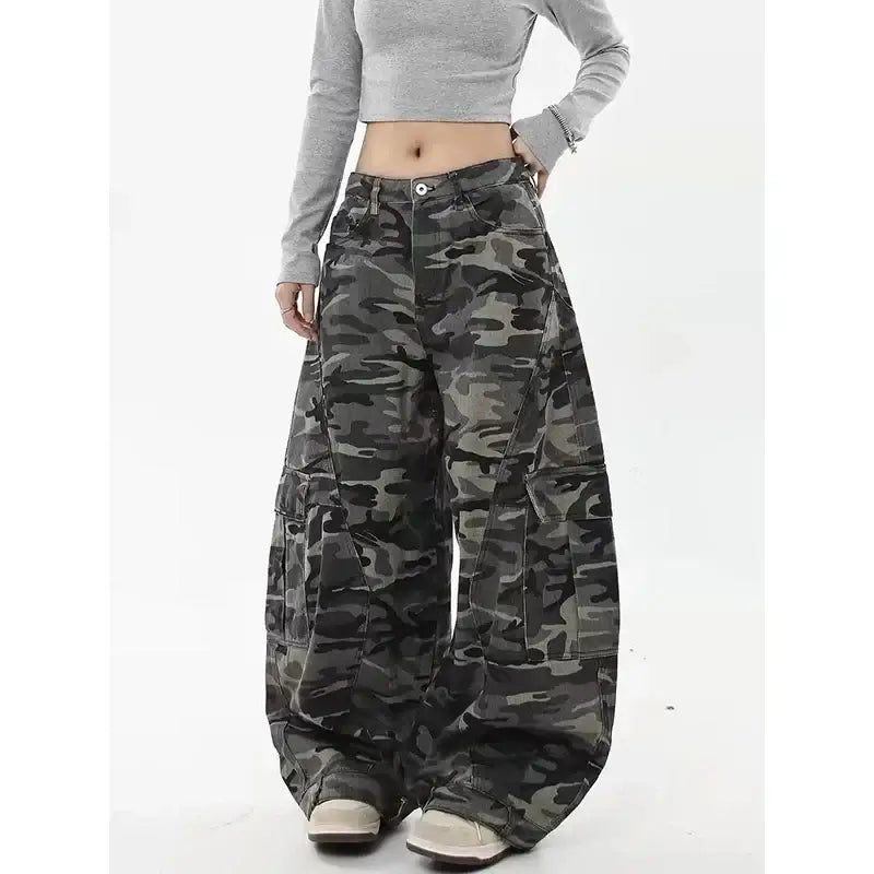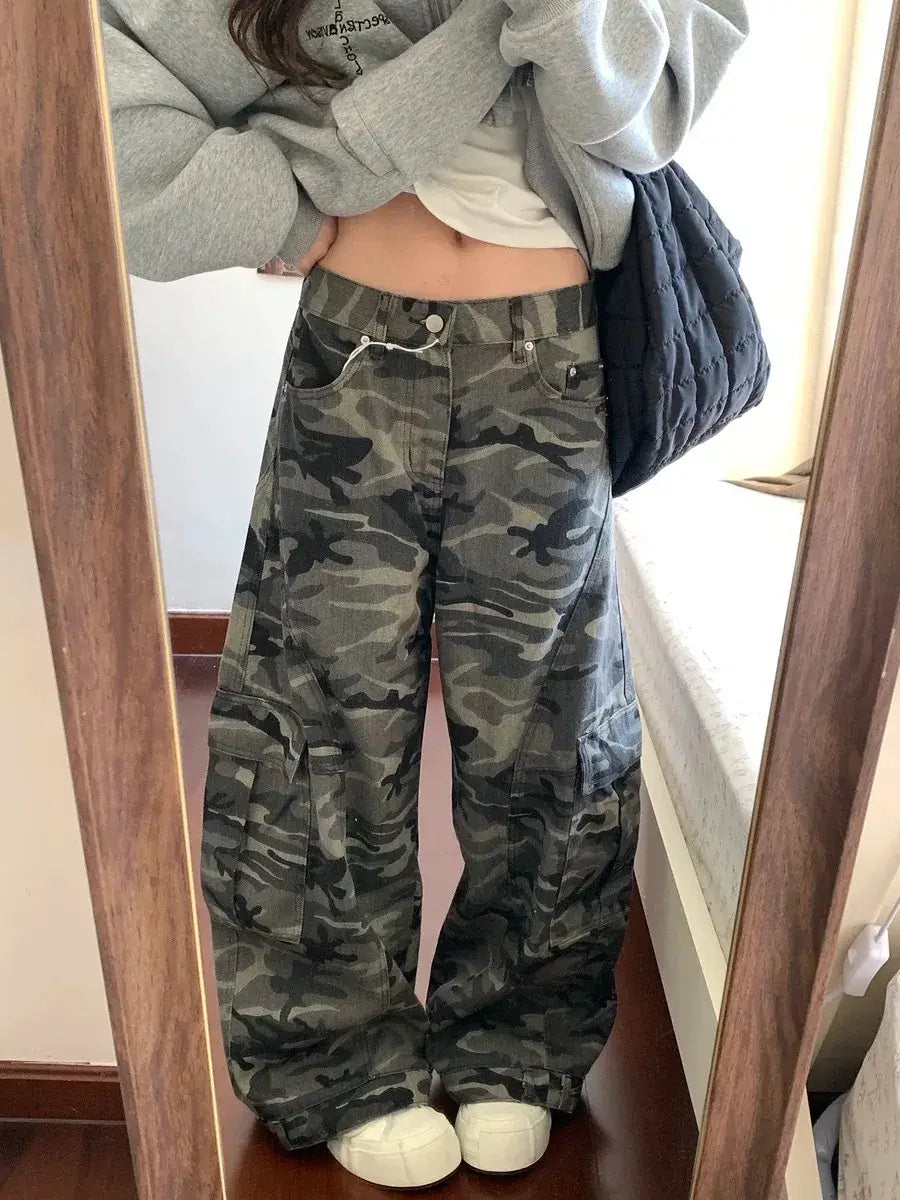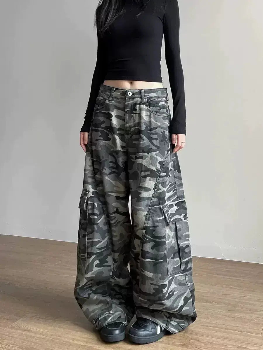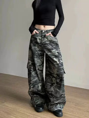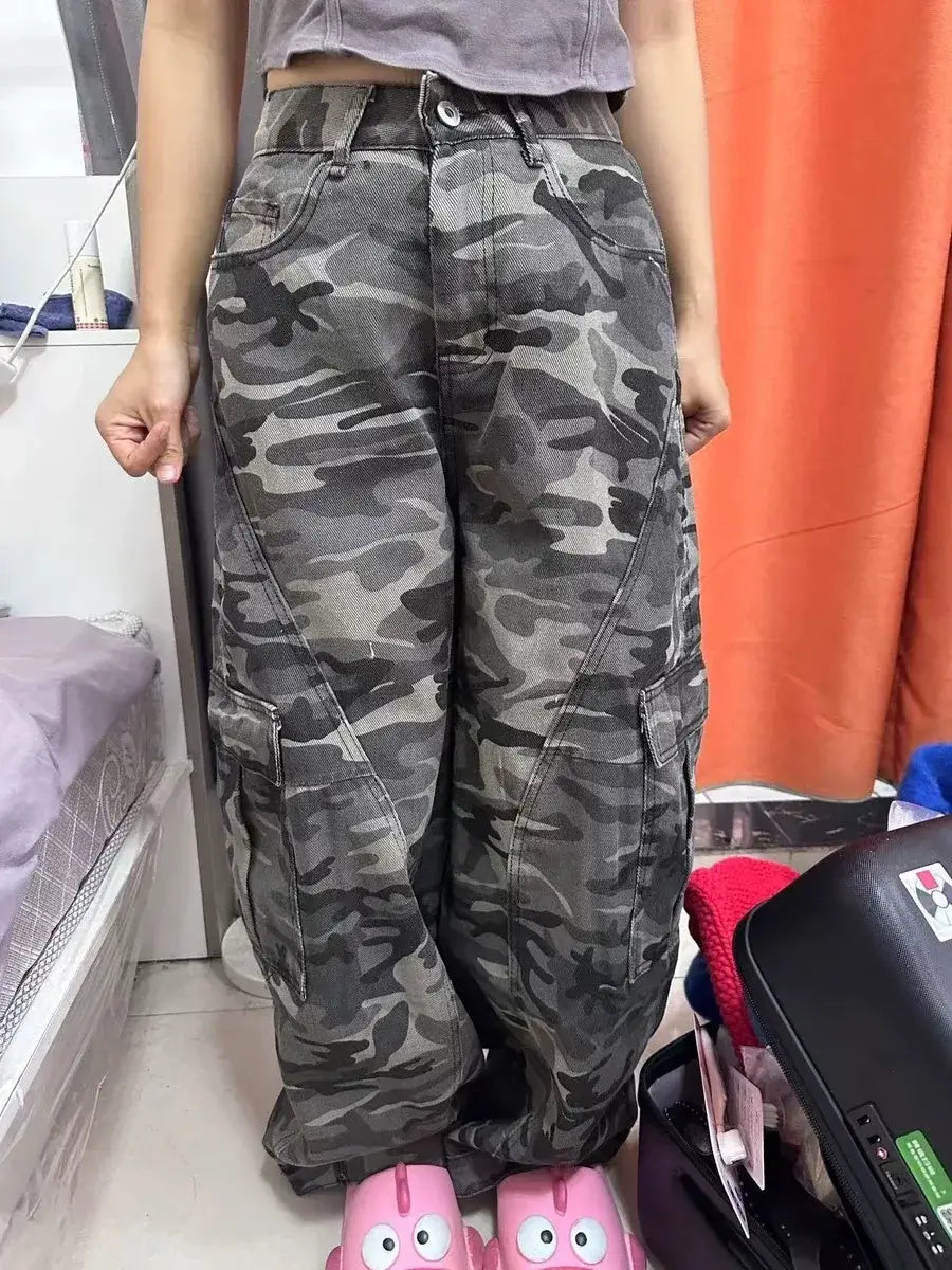Hip Hop Vintage Mutil Pockets Camouflage Jeans Women High Waist 2000s Baggy Y2K Denim Pants American Retro Wide Leg Trousers