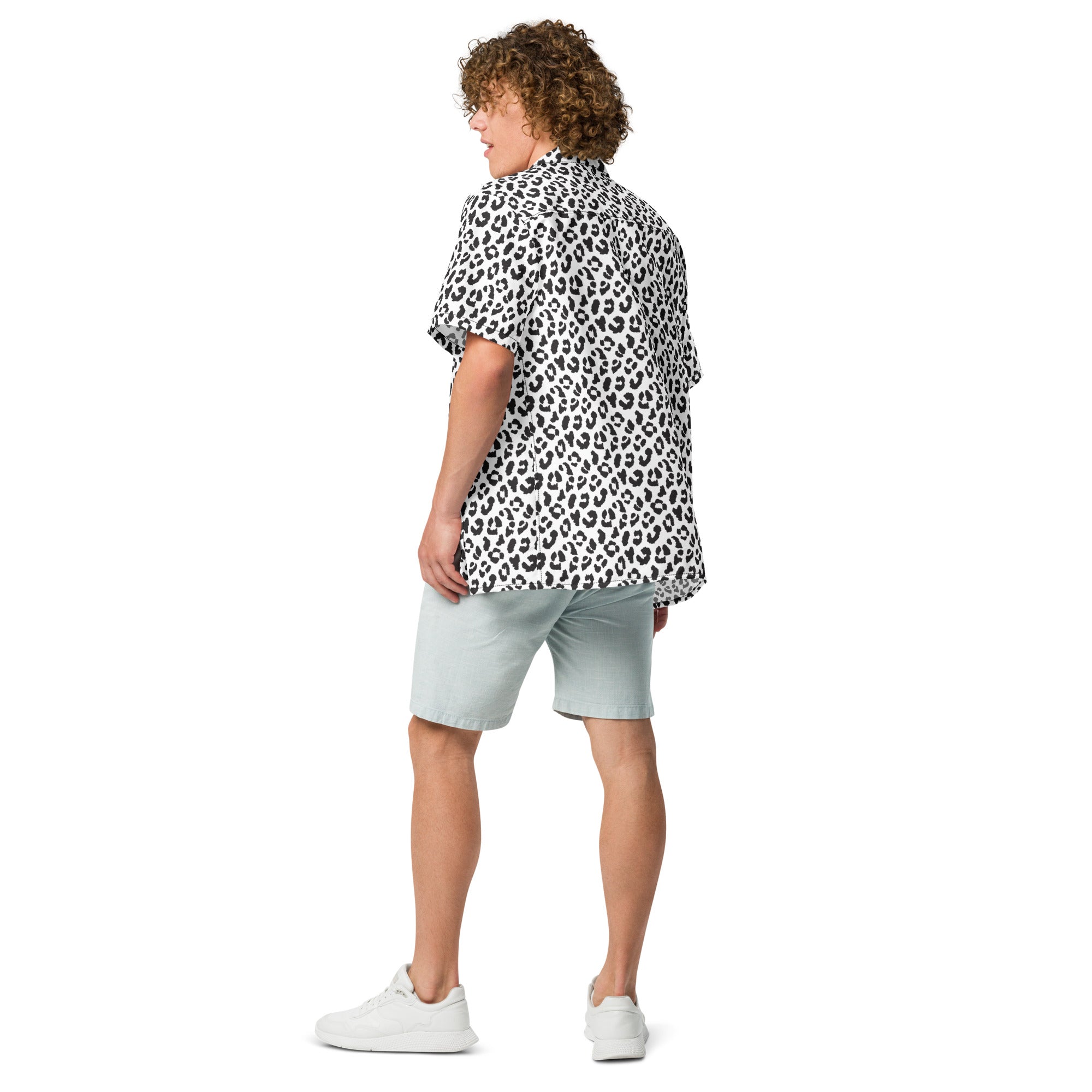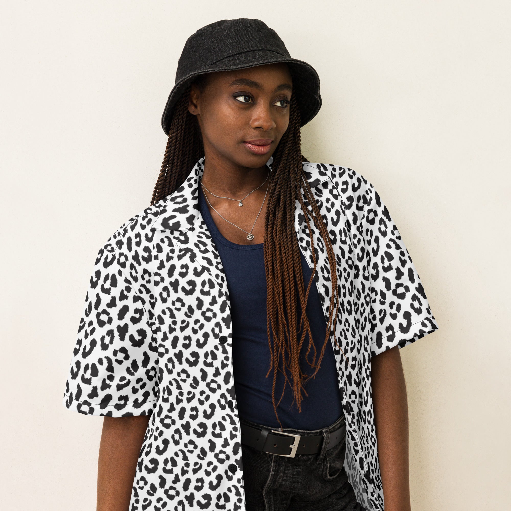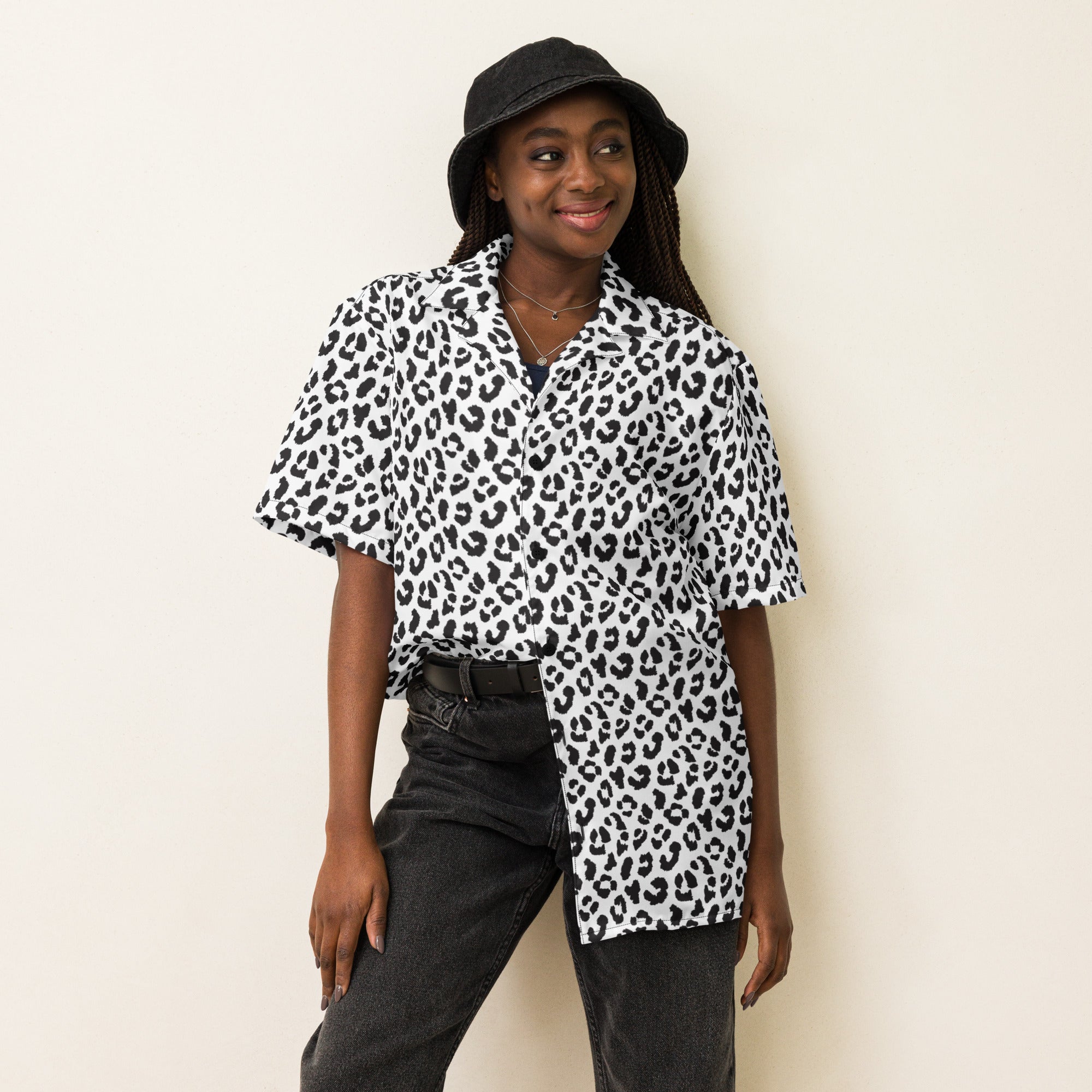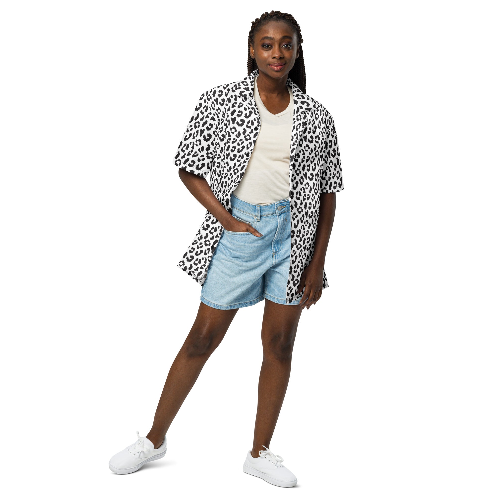 Elevate your style with our Leopard Button Up Shirt. Featuring an oversized fit and a striking black on white leopard print, this shirt will make a bold statement wherever you go. Perfect for adding a touch of edginess to your wardrobe, while still maintaining a professional and polished look. Unisex.