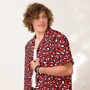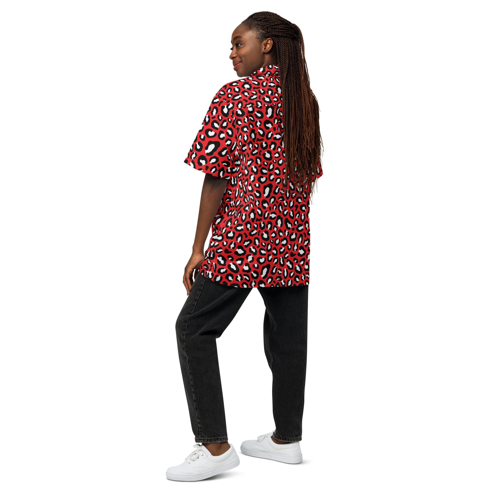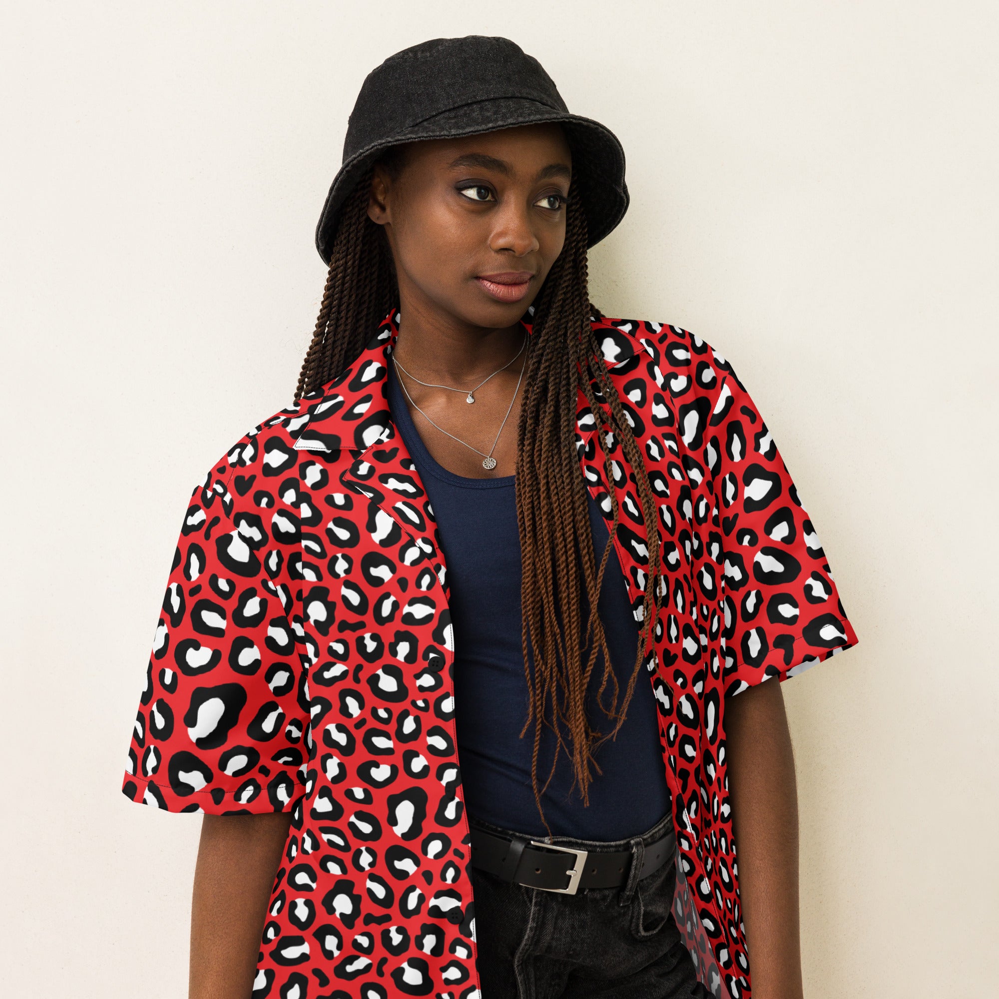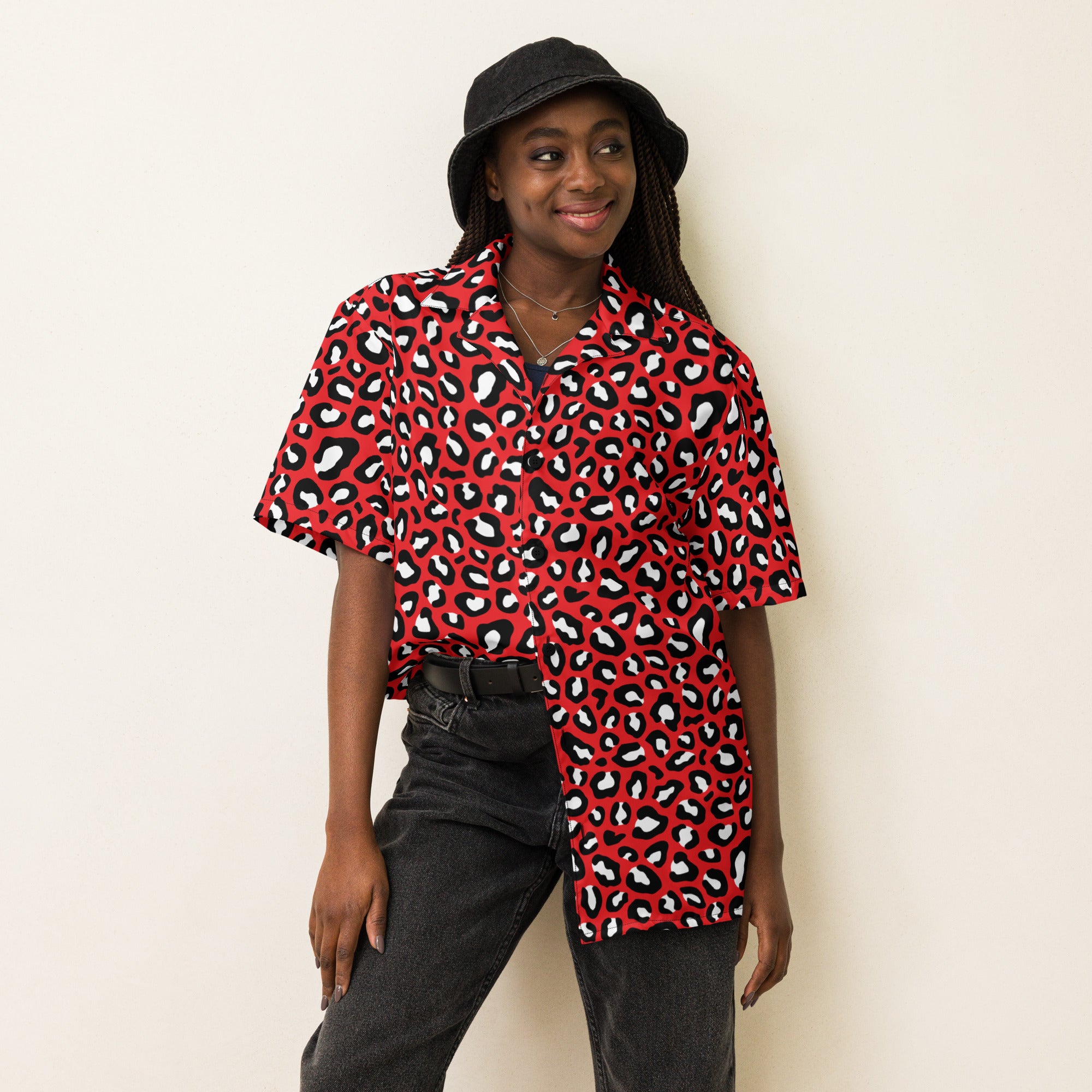 This Leopard Button Up Shirt features an OVERSIZED FIT in vibrant Red, Black, and White colors. Its unique design and comfortable fit offer a trendy and stylish look. Made with quality materials, this shirt is perfect for any occasion. Upgrade your wardrobe with this must-have piece. Peace.