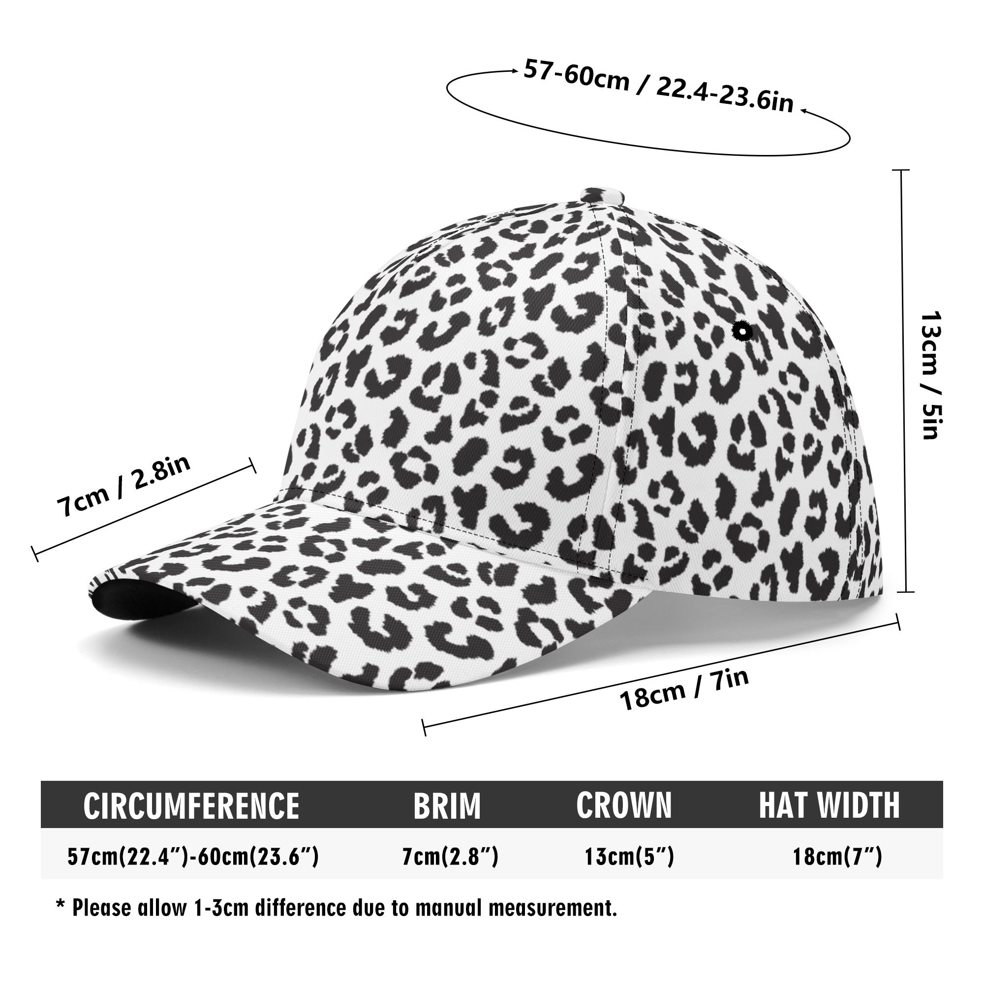 Introducing the elegant Leopard Hat in Black and White Print. Made from high-quality materials, this hat boasts a bold leopard print design. Perfect for adding a touch of sophistication to any outfit. Make a statement with this stylish accessory.