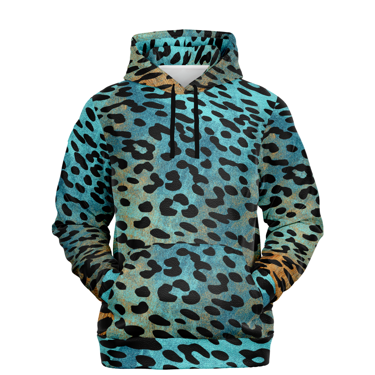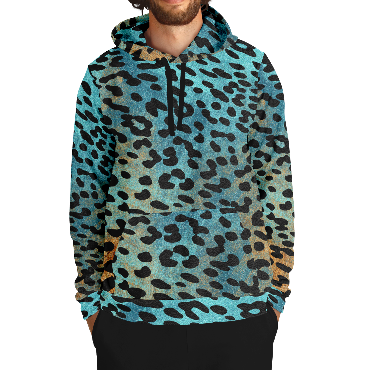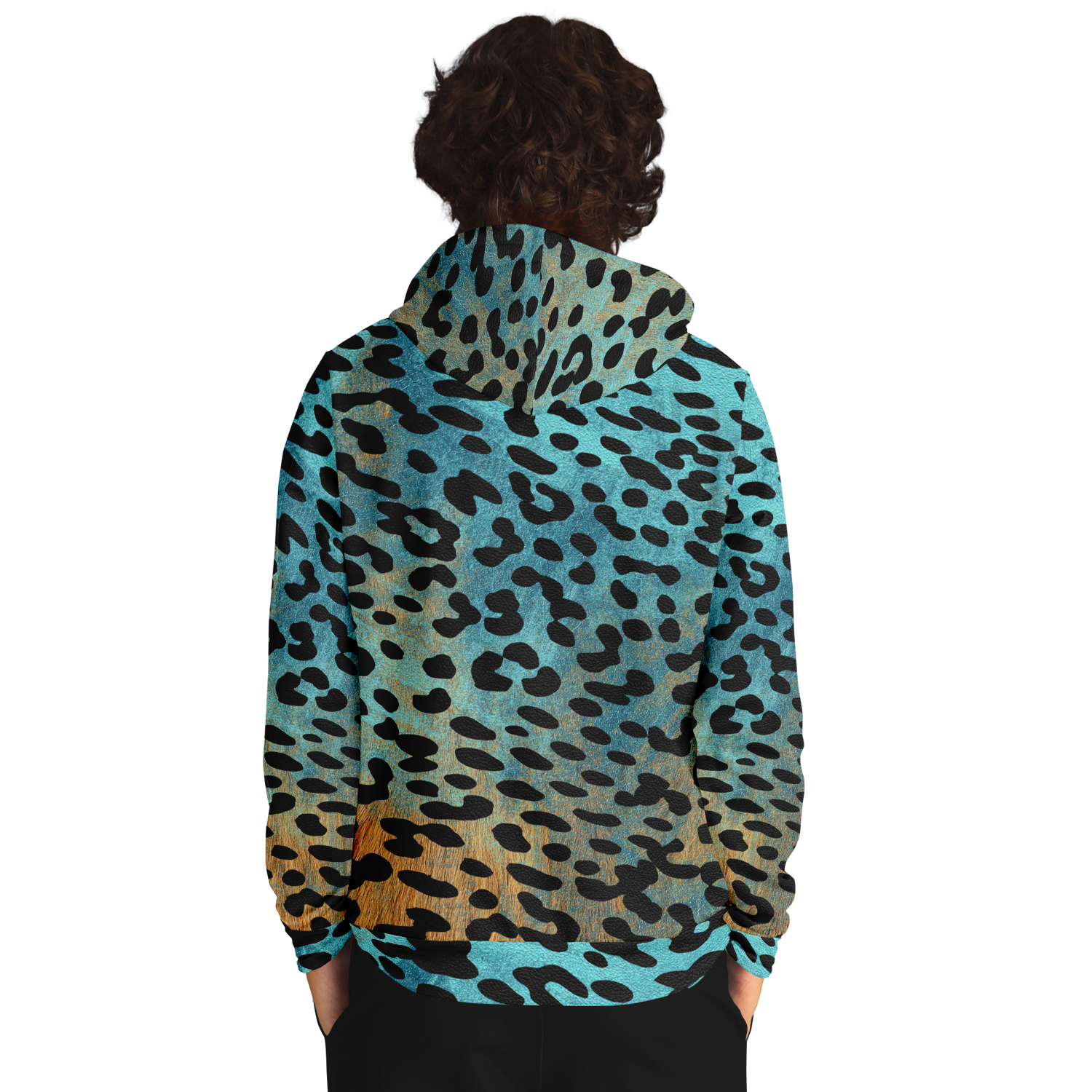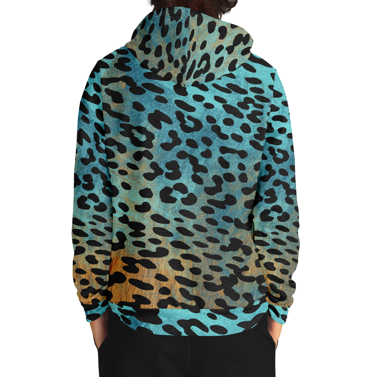This leopard hoodie features a unique blue and orange safari pattern, perfect for the fashion-forward individual. The soft material and comfortable fit provide both style and comfort while adding a touch of adventure to any outfit.