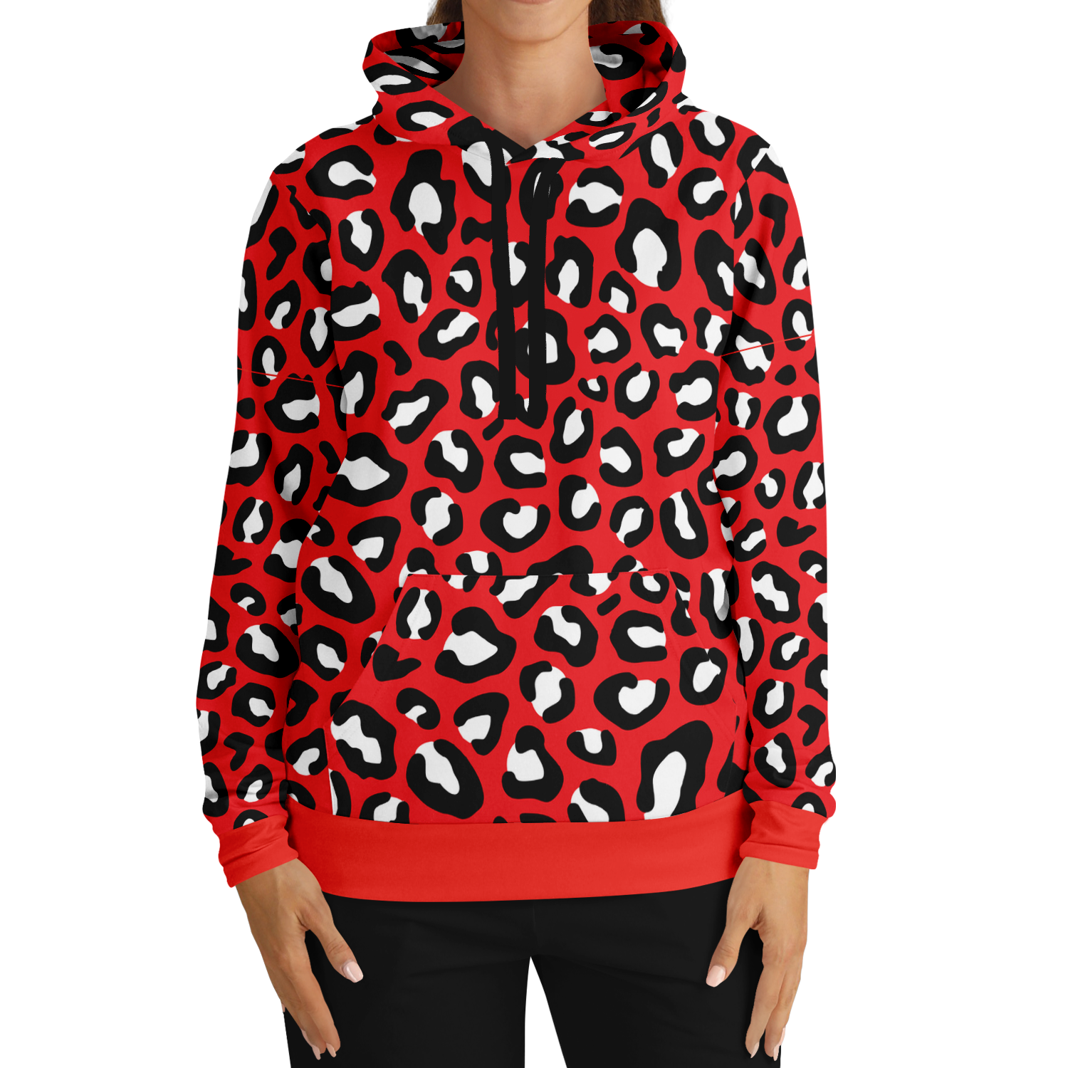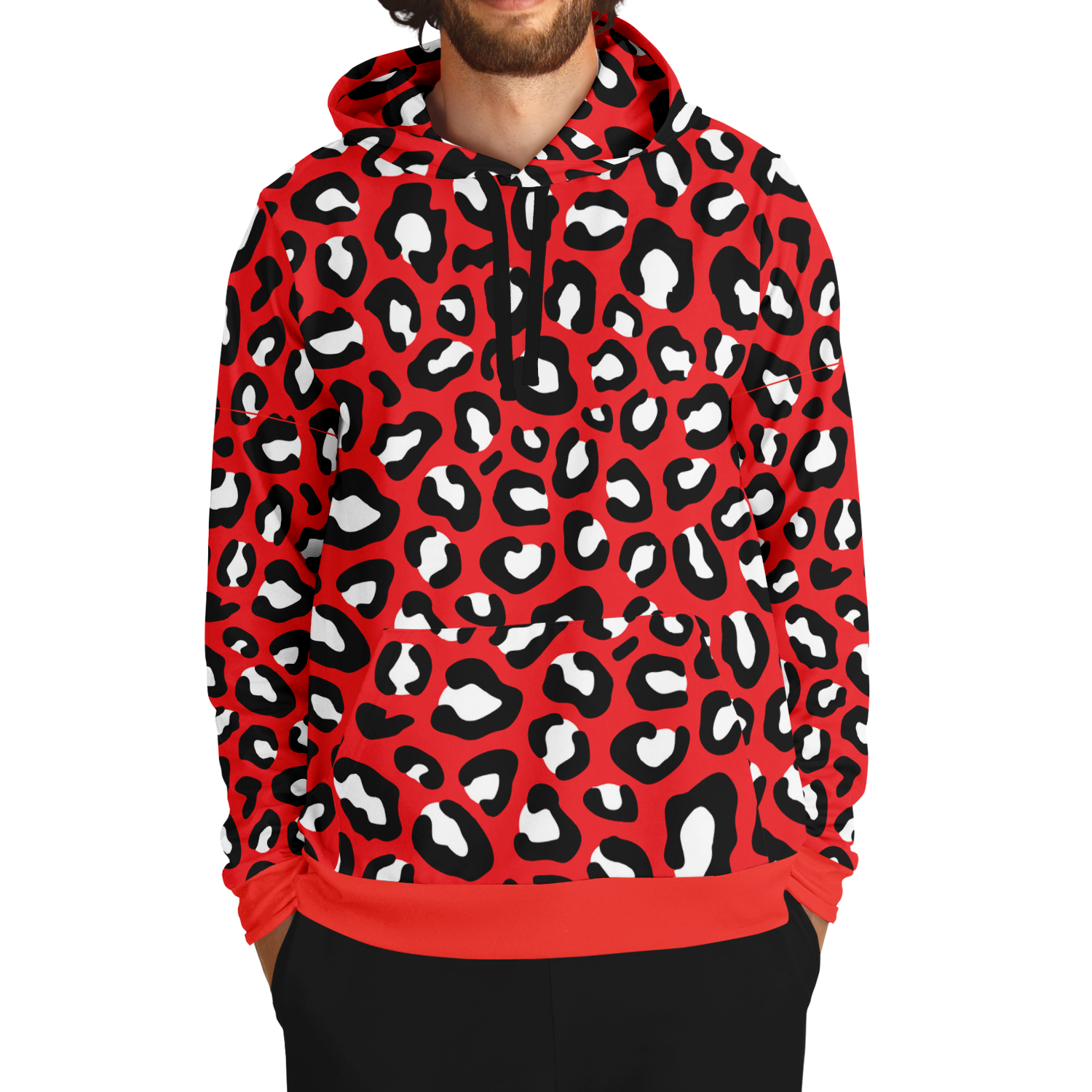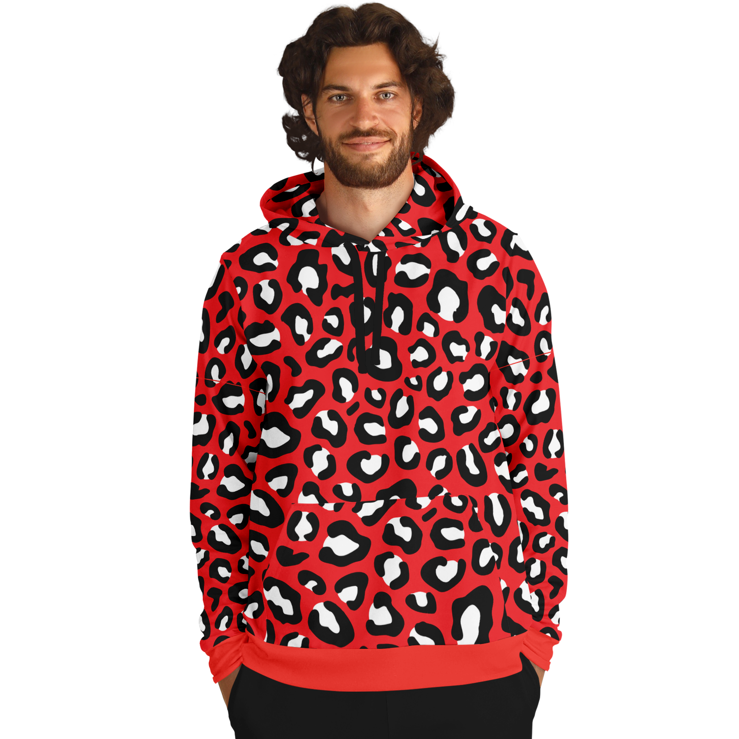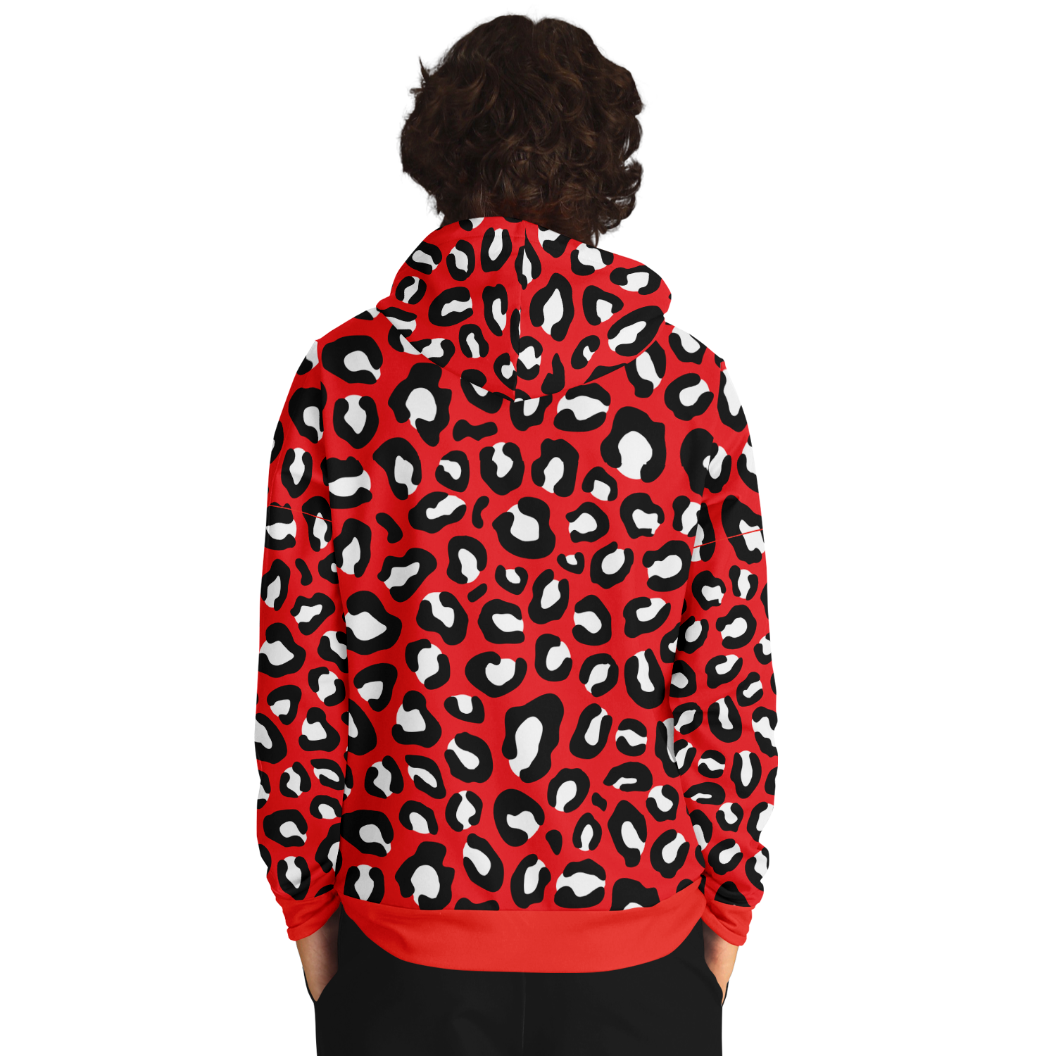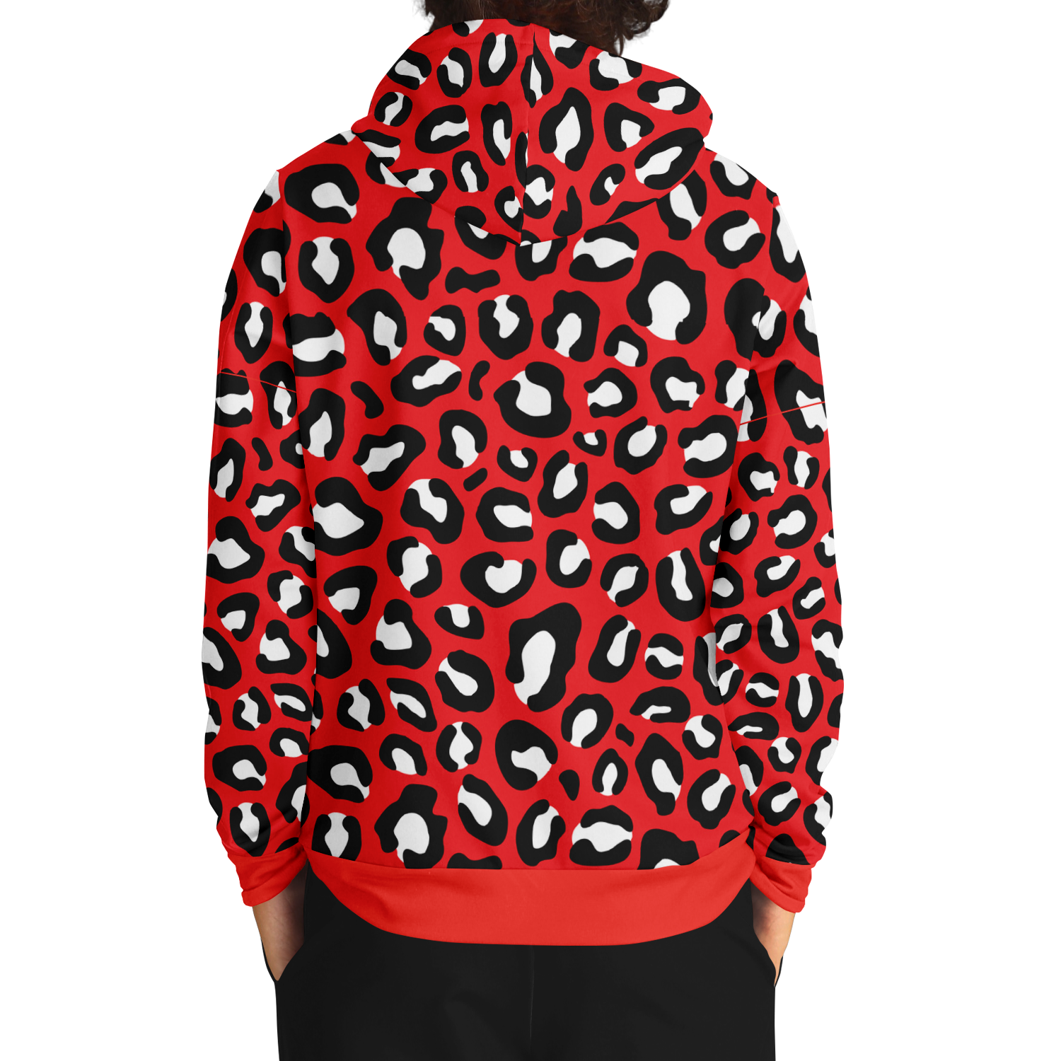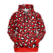 This leopard hoodie features a vibrant red, black, and white pattern that adds a touch of fierce style to any outfit. Made with high-quality material, it offers both comfort and durability. The perfect way to make a statement and stay warm.