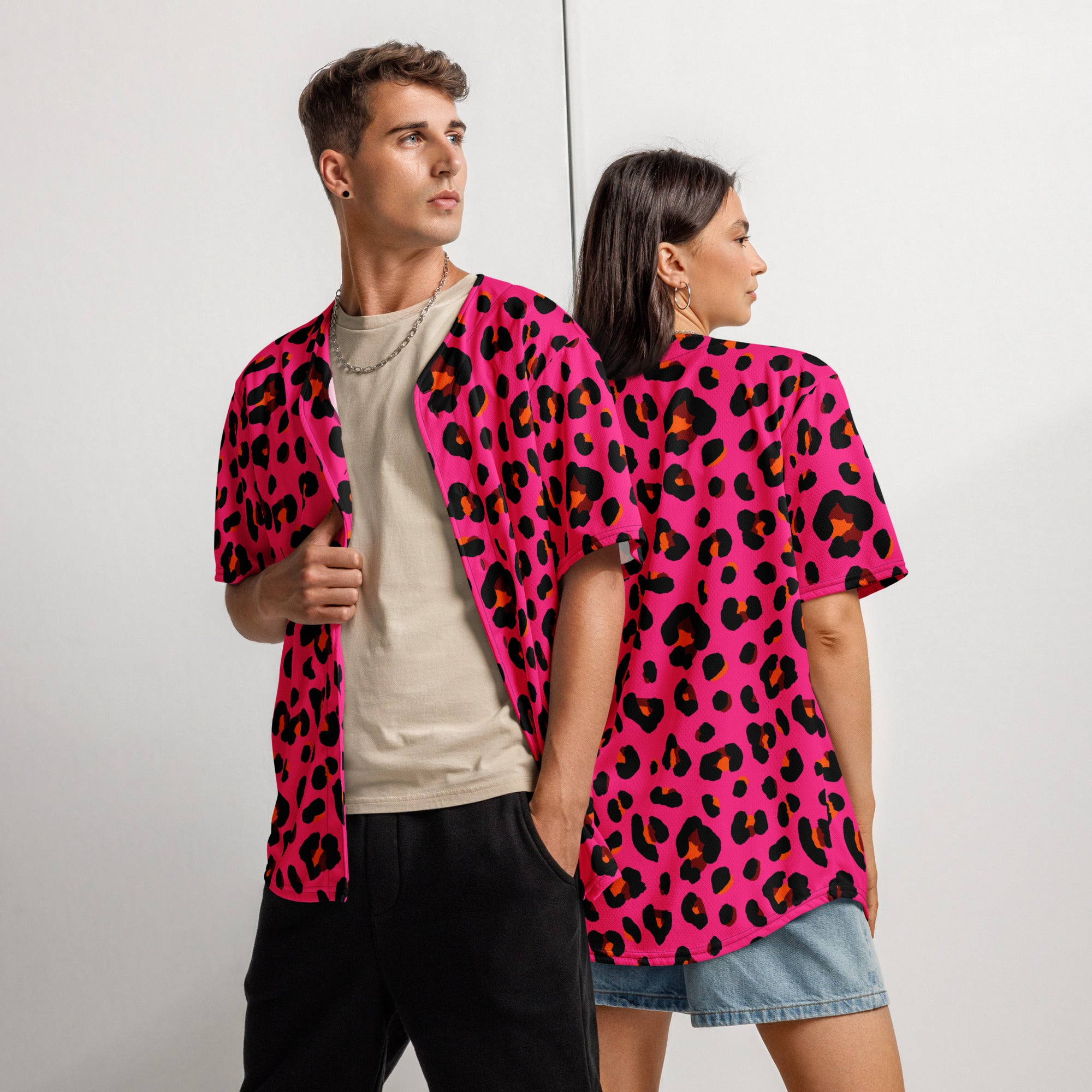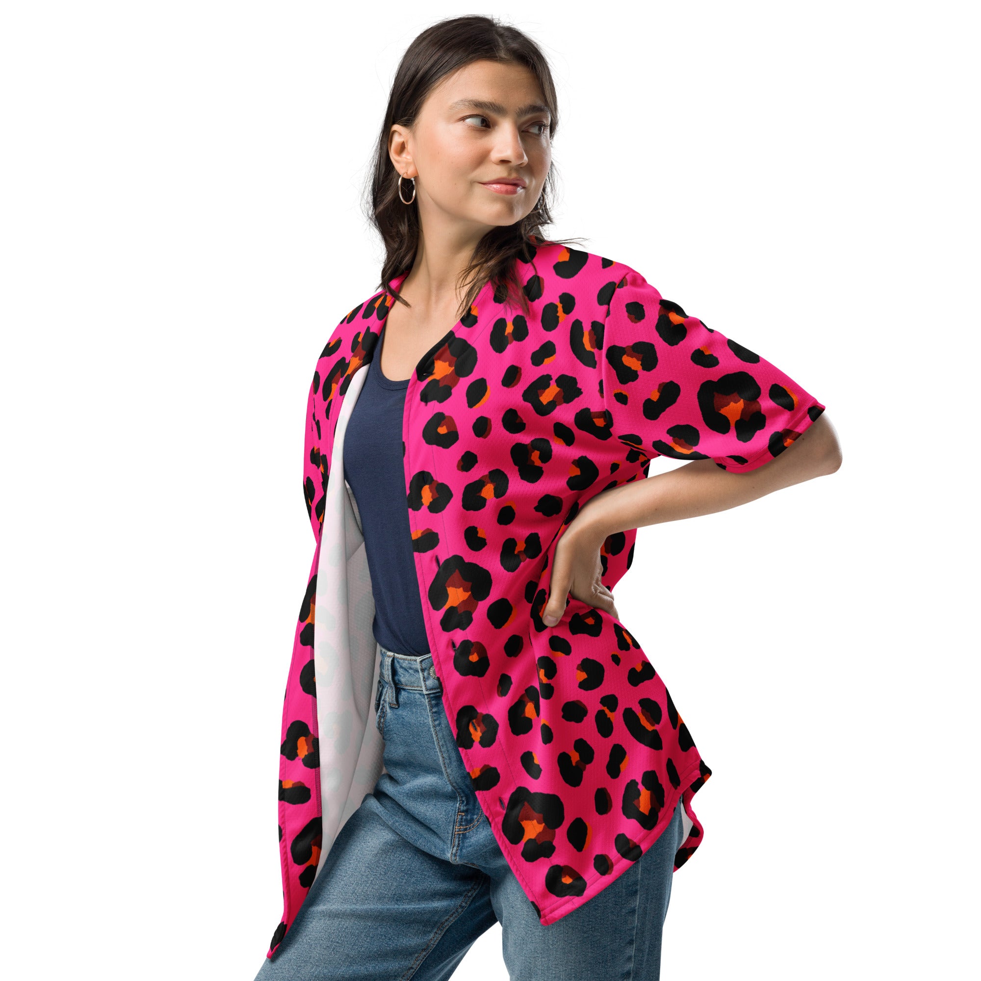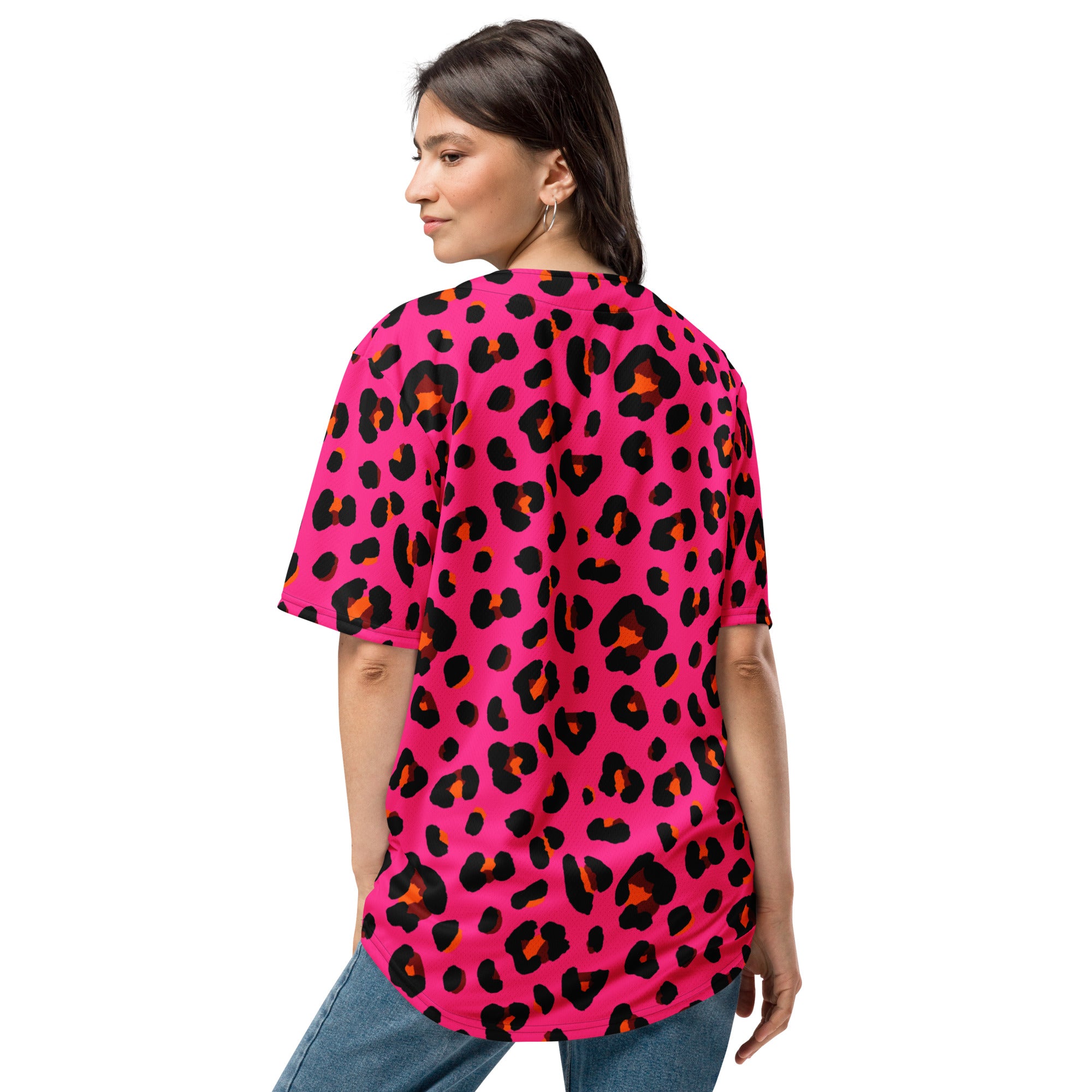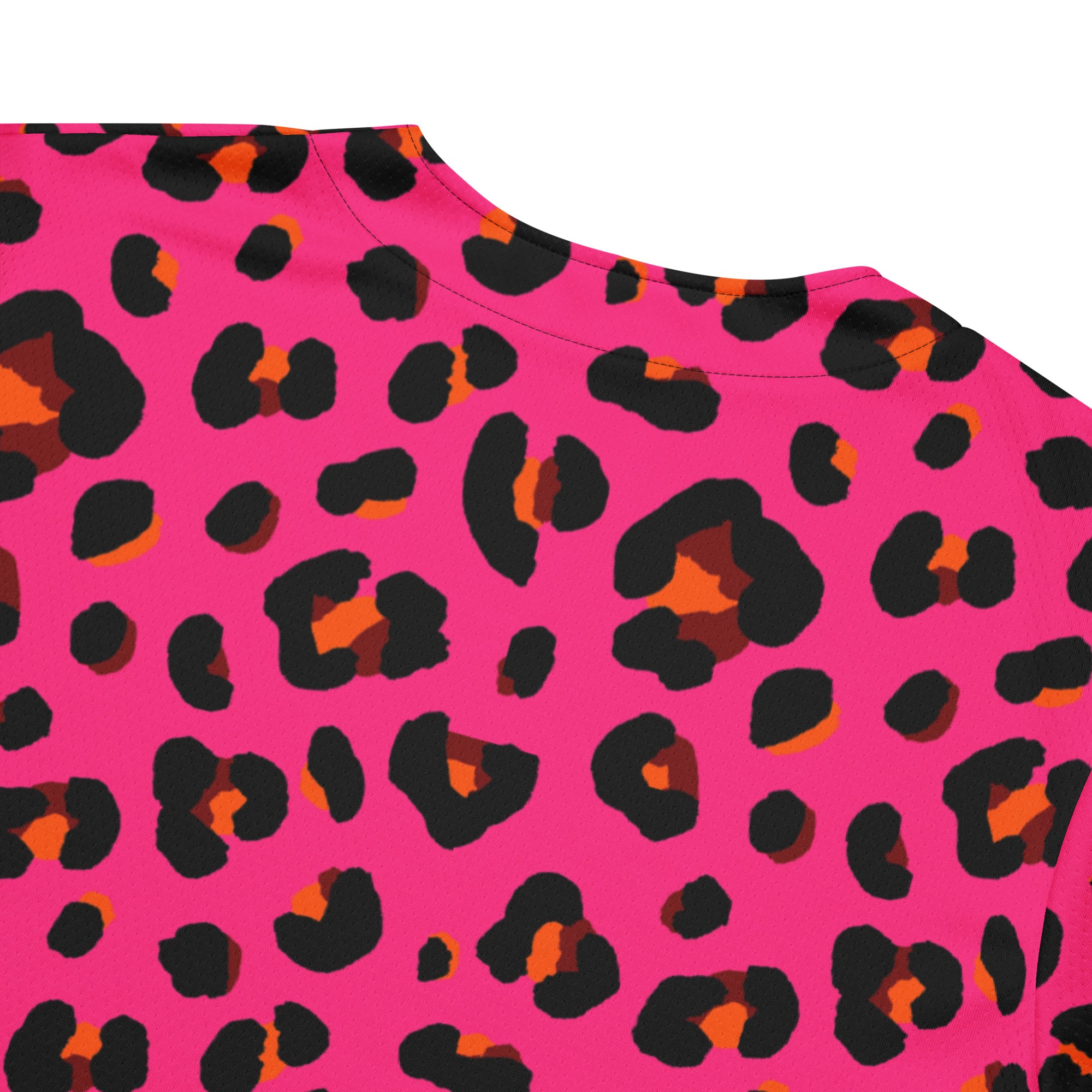 Discover the wild side of fashion with our Leopard Jersey in Cerise Pink, Orange, and Black. Made with a fierce leopard print, this jersey adds a bold touch to any outfit. Unleash your inner style with the perfect combination of color and pattern.