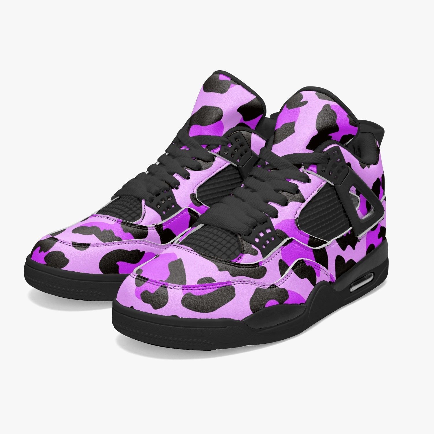 These high top leopard sneakers in purple, blue, and black are versatile and stylish, perfect for any outfit. The unique leopard print adds a touch of glamour and the high top design provides extra ankle support. Stay fashionable and comfortable with these sneakers.
