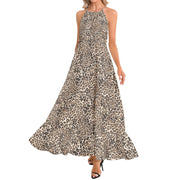 Introducing our Leopard Maxi Dress in a classic brown print. Made with chiffon and a slight stretch, this dress is perfect for any occasion. Featuring a sleeveless halter neck, tie back, and A-line flared silhouette, with a ruffle hem for an added touch. Look effortlessly stylish in this maxi dress.