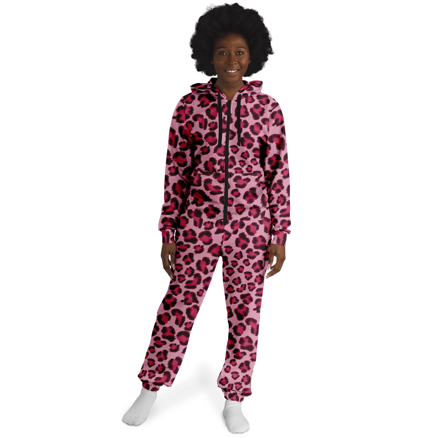 This Leopard Onesie features a unique Pink, Cherry, and Black Print design and is suitable for both men and women. Made from high-quality materials, this comfortable and stylish onesie is perfect for lounging at home or adding a fun touch to any costume. Unleash your wild side with this versatile and eye-catching onesie!