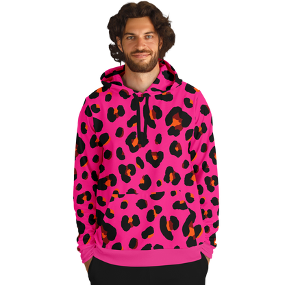 This leopard print hoodie comes in a striking combination of cerise pink, orange, and black. Made with top-notch fabric, it's both comfortable and stylish, perfect for everyday wear. Stand out from the crowd with this unique and trendy hoodie.