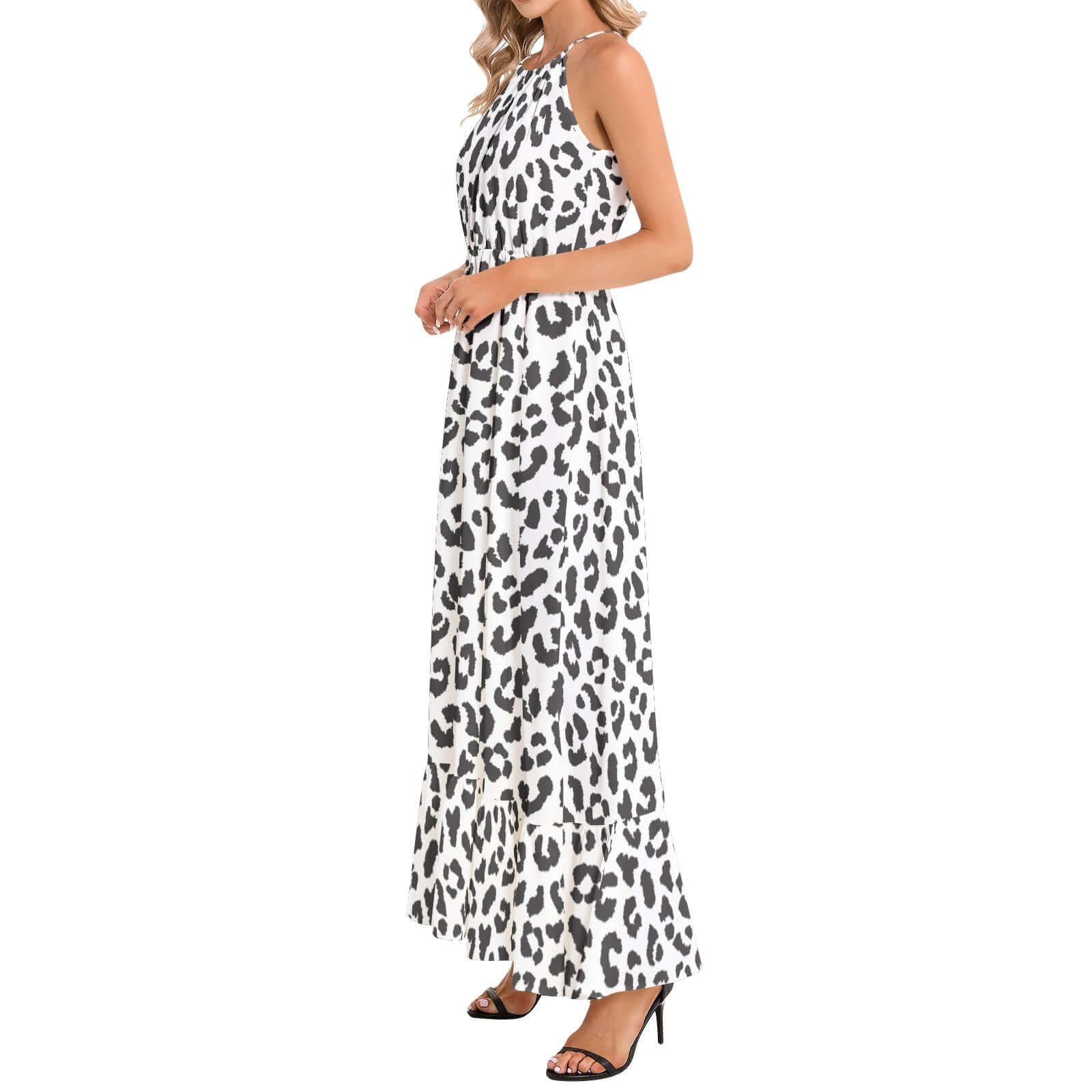 Expertly crafted from chiffon with a slight stretch, this Leopard Print Maxi Dress in Black & White is the perfect addition to any wardrobe. Featuring a sleeveless halter neck design, tie back, and A-line flare with a ruffle hem, this dress exudes elegant charm. Embrace your wild side with this effortlessly stylish maxi dress.