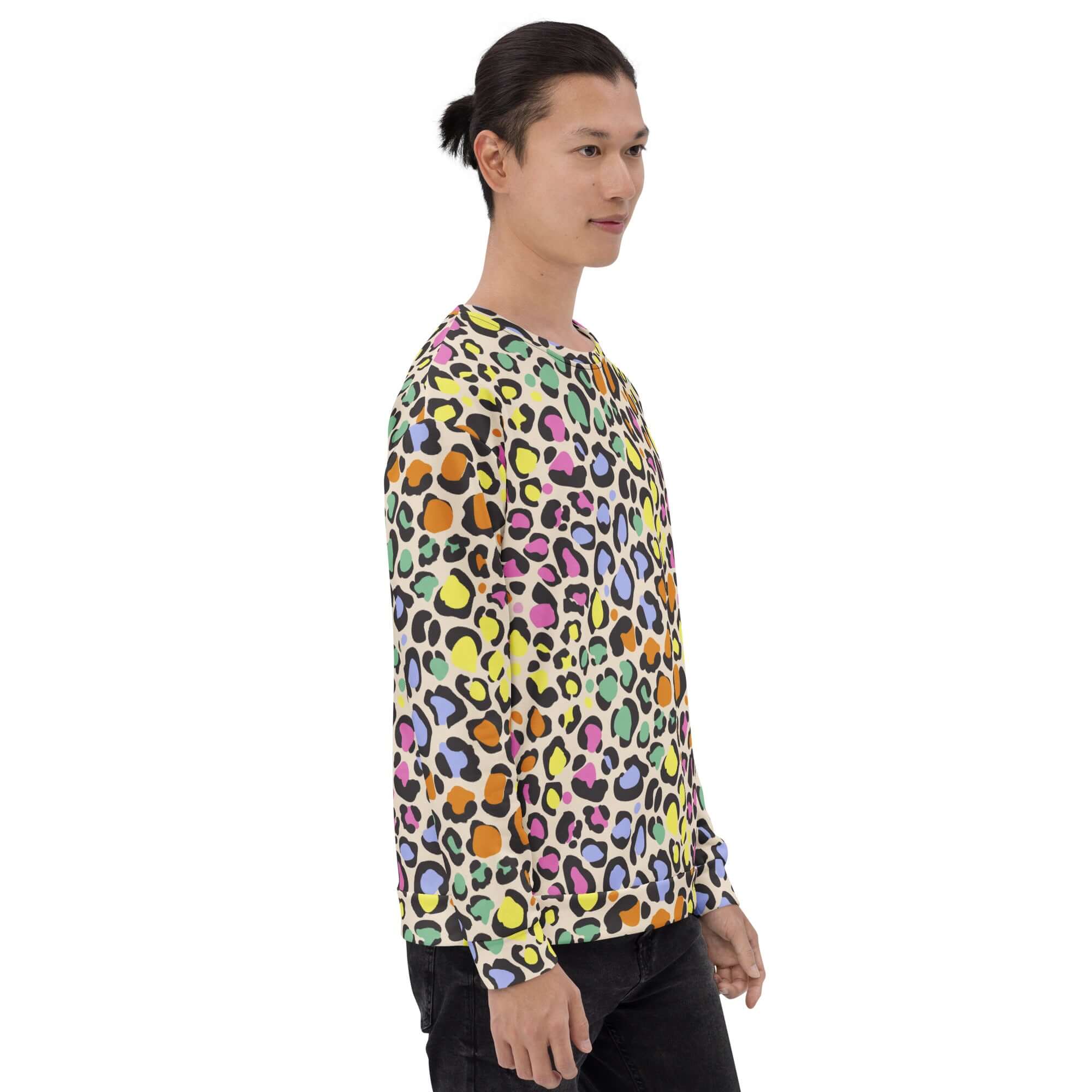 Unleash your wild side with a burst of color! This Leopard Print Sweatshirt in Rainbow Colors is the perfect blend of bold and cozy. Featuring a vibrant multicolor leopard pattern, this statement piece brings energy to any outfit. Made from a soft, breathable fabric blend, it offers all-day comfort while keeping you warm. The relaxed fit and ribbed cuffs add a laid-back vibe, perfect for layering or wearing solo. Whether you're lounging or making a streetwear statement, this sweatshirt is your go-to for fearless style.