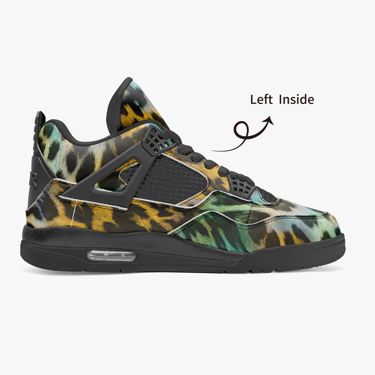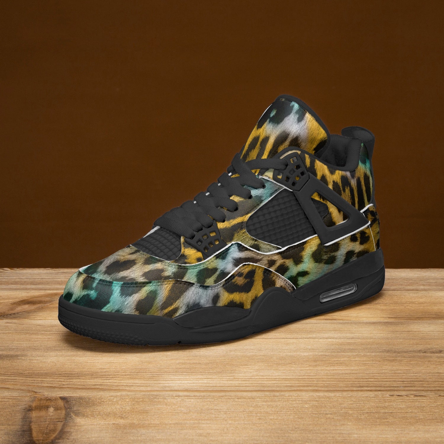 Experience fierce style with our Leopard Sneakers AJ4 Style in a bold yellow and blue abstract pattern. These sneakers feature a unique and eye-catching design that will surely make a statement. With the iconic AJ4 style, you'll have both comfort and fashion in one shoe. Elevate your sneaker game today.