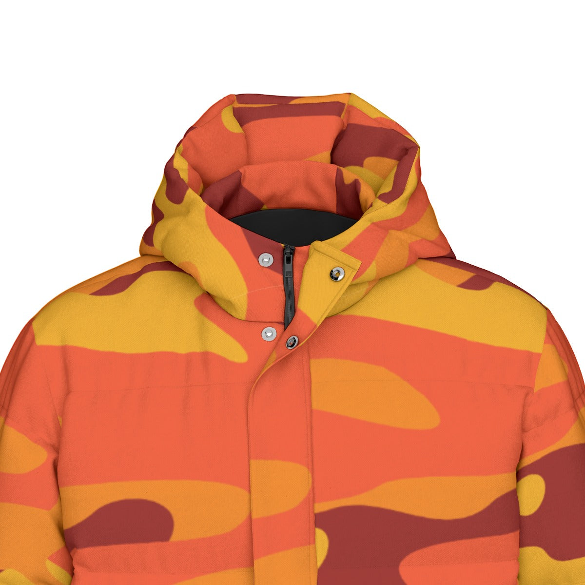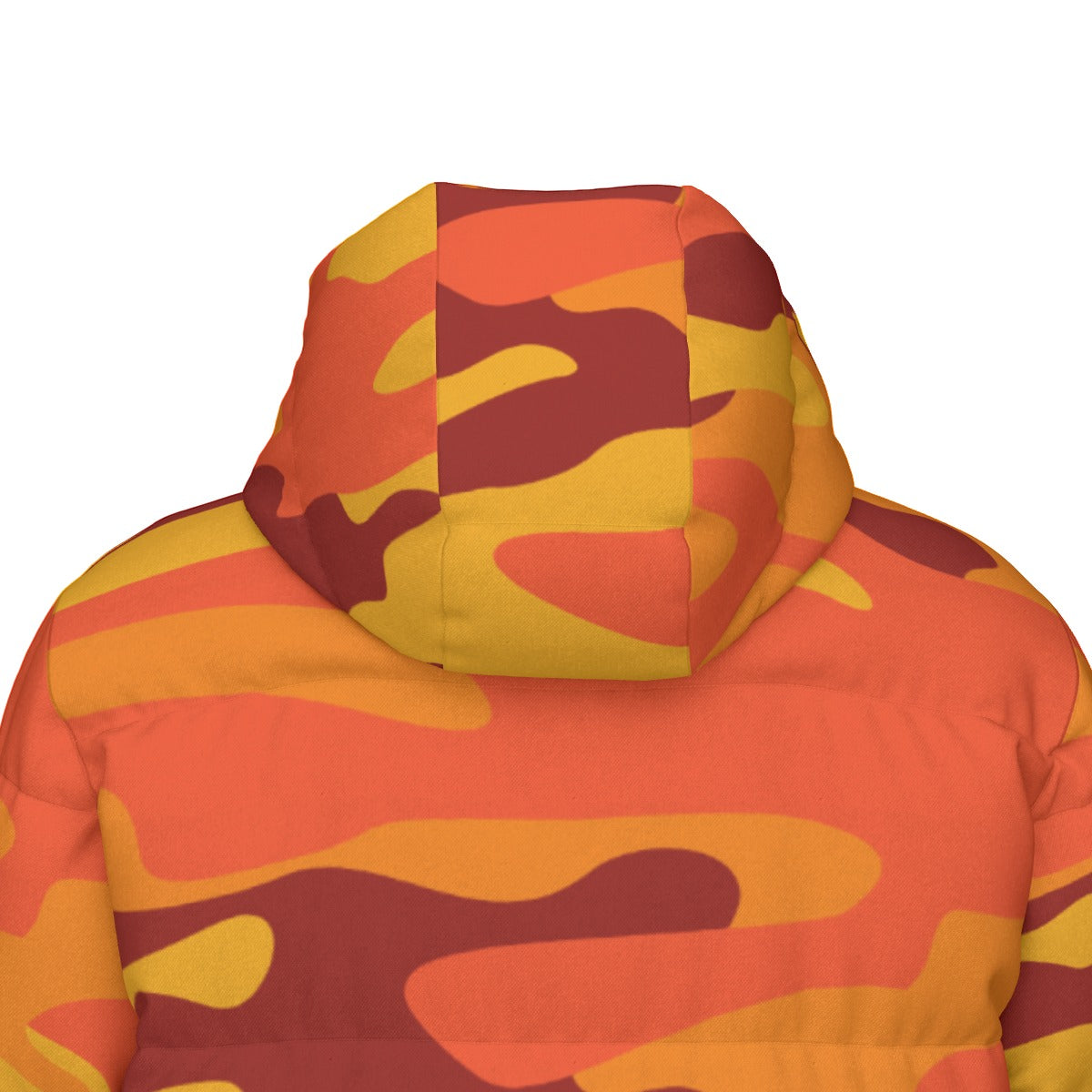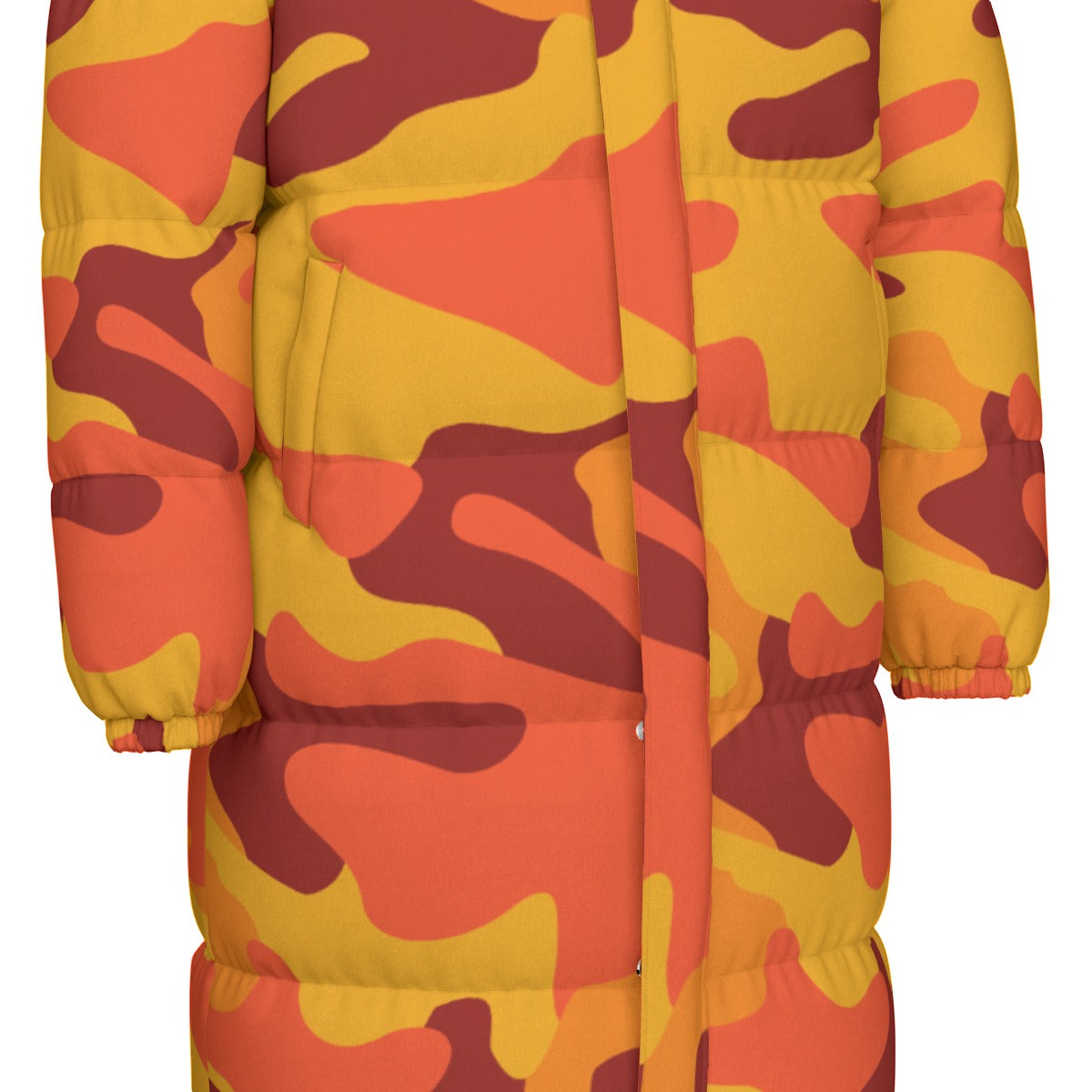 Long Puffer Coat | Unisex | Orange & Red Camouflage